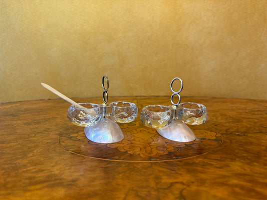 Antique Mother Of Pearl Crystal Open Salts Double Bowls Pair