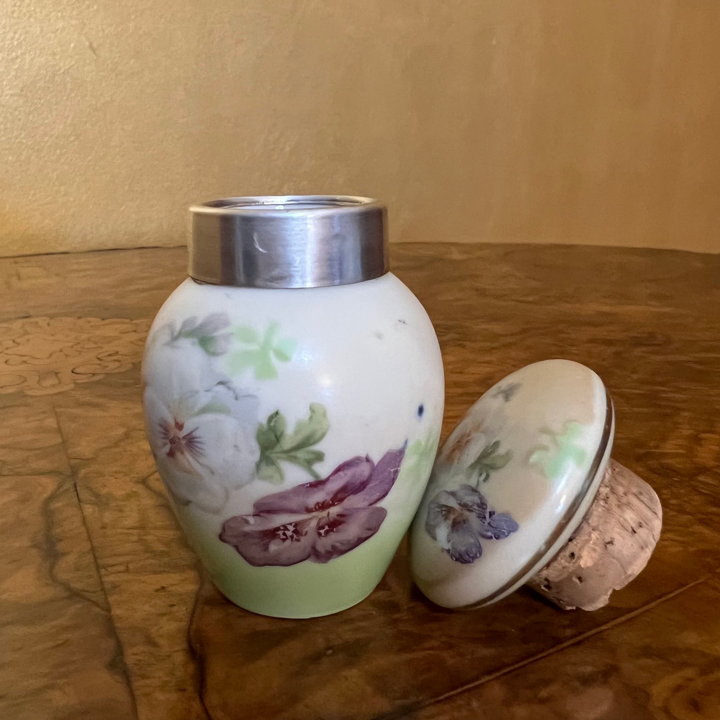 Description: Sterling Silver Lid rim, floral print bottle and lid, cork top has some wear, some ware to print.
