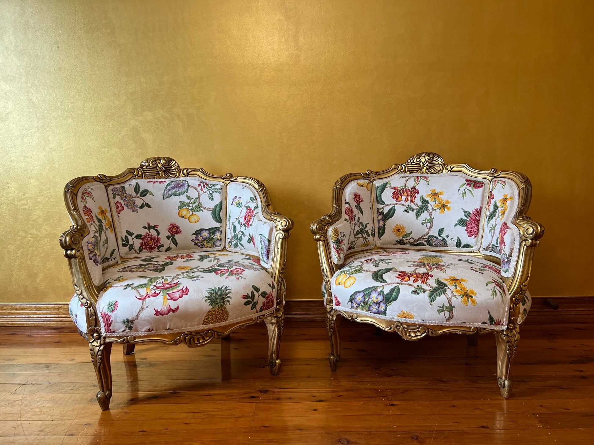 Description: Beautiful 24 carrot gold gilt 19th Century floral carvings and detailed throughout, upholstered in a silk damask fabric with flowers and pineapples.