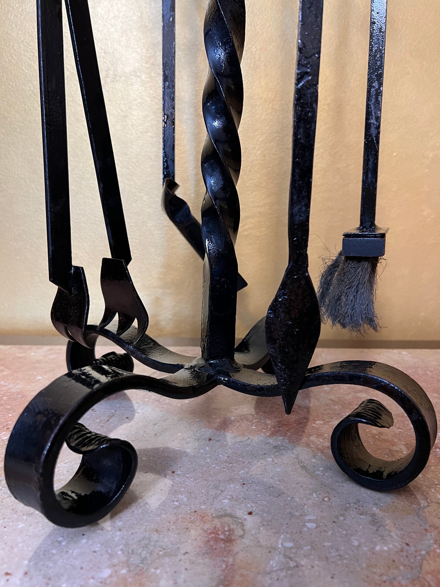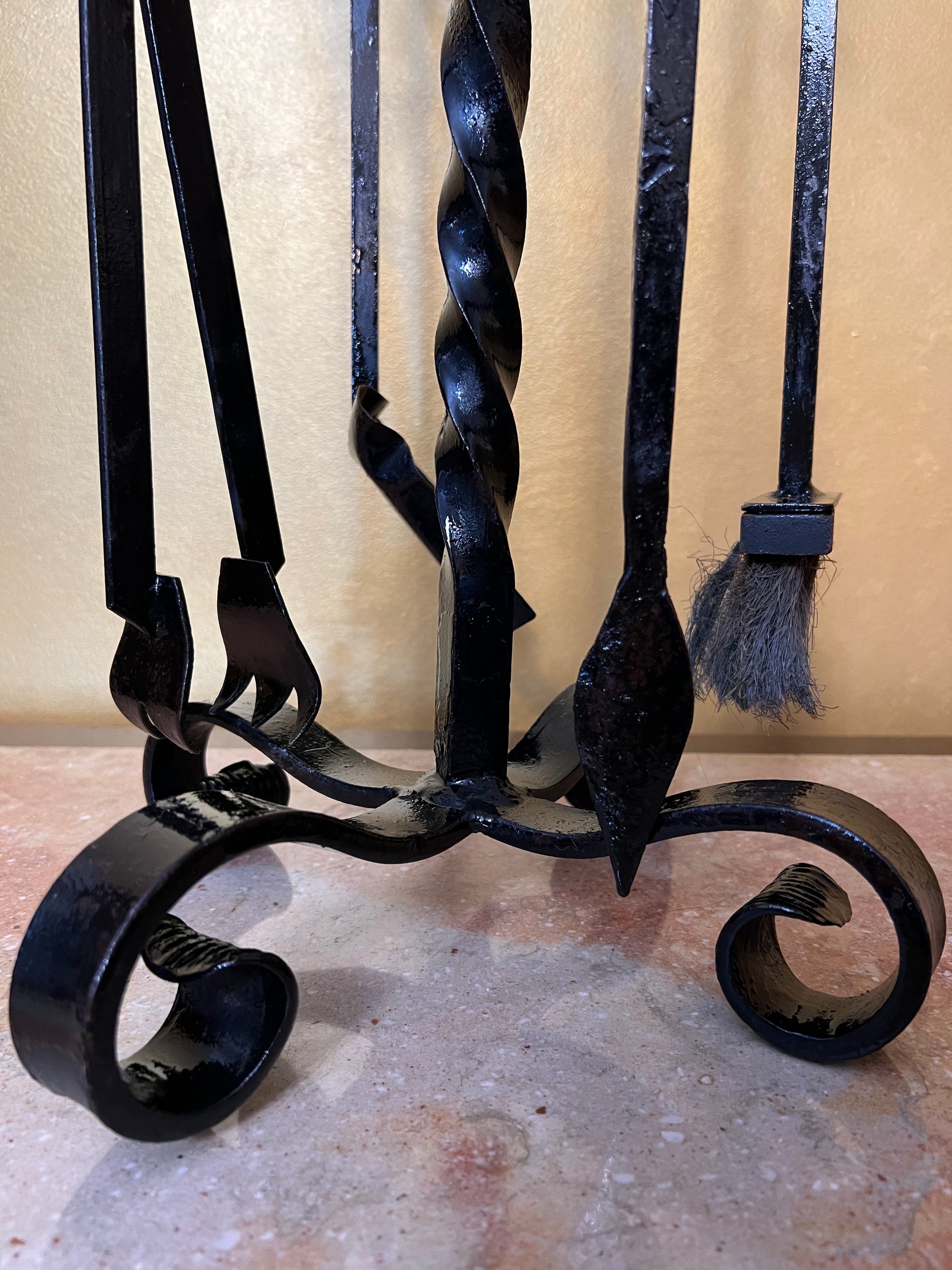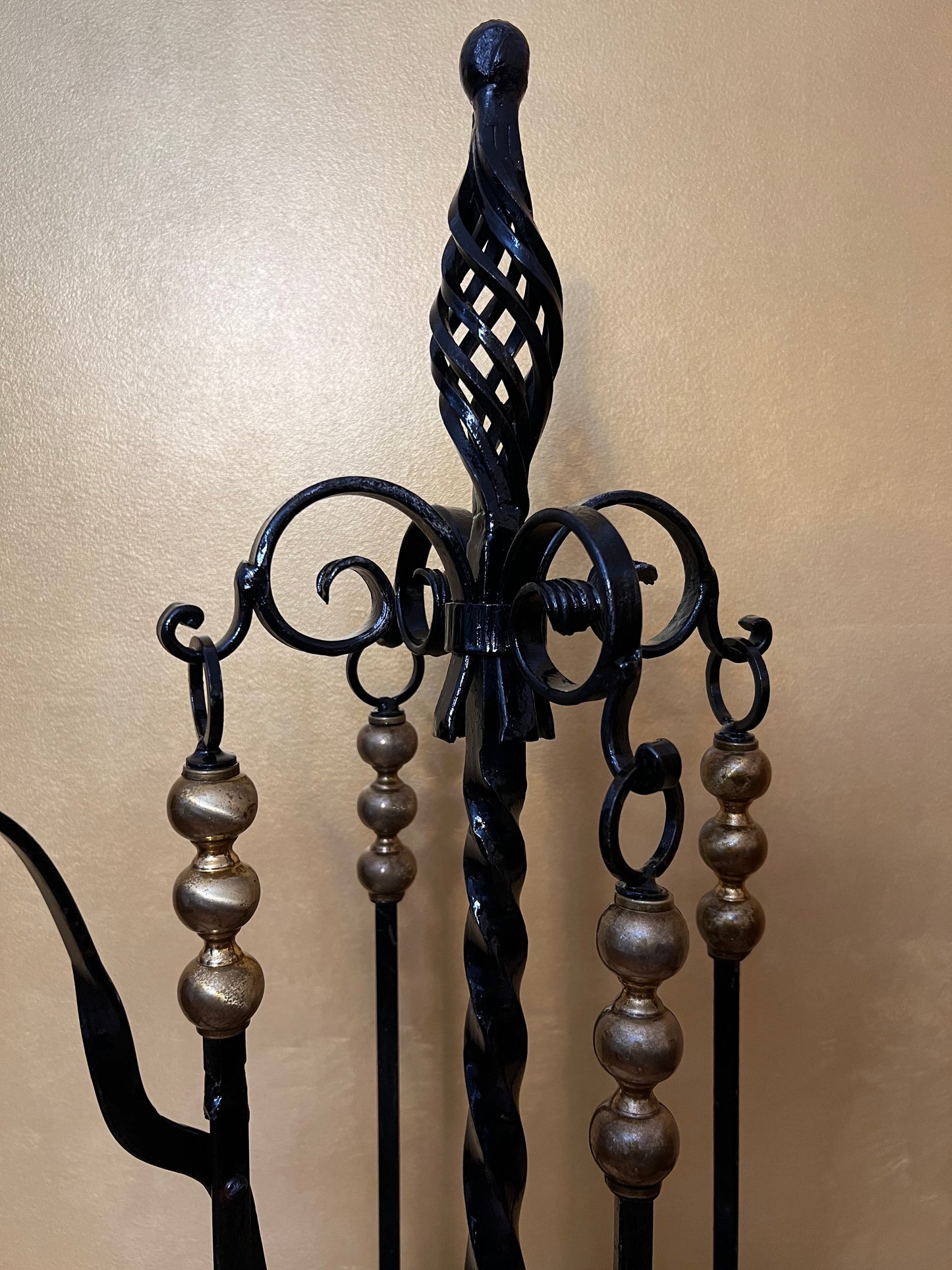 Description: Spiral details stand and comes with matching stoker, brush, tongs and shovel with 3 gold ball detail on top of tools.