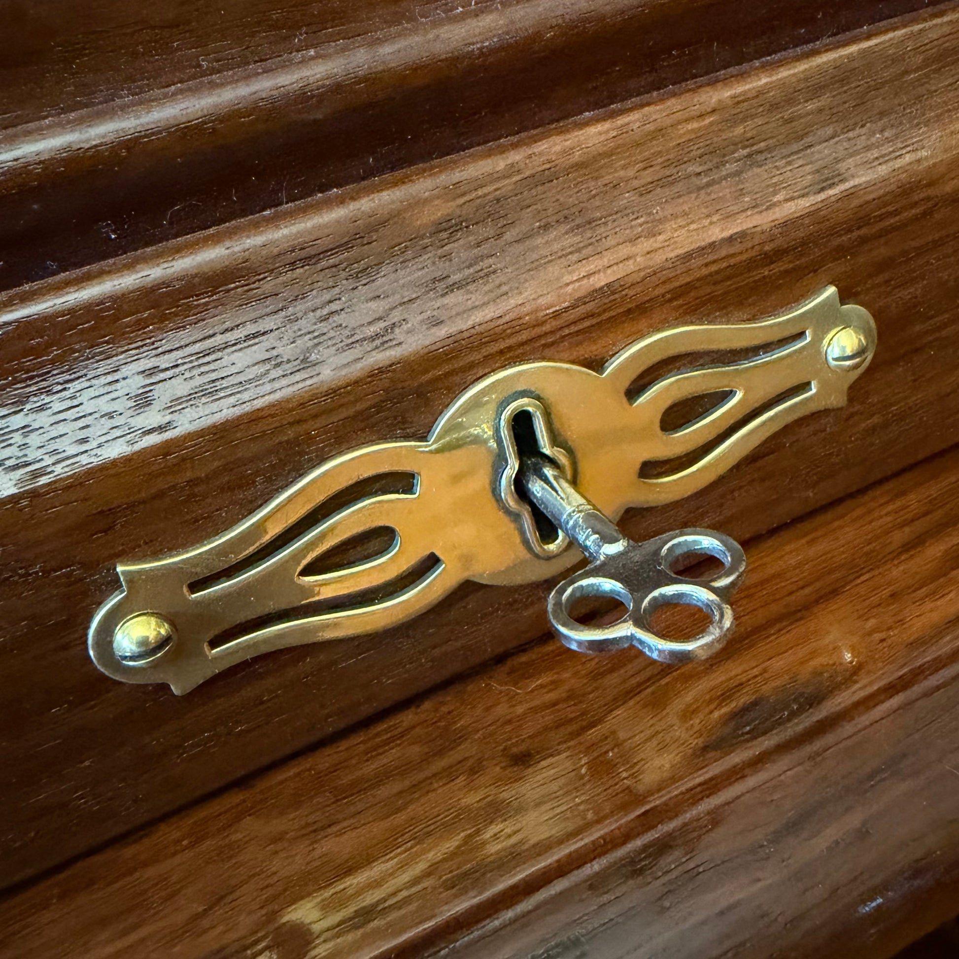 Description: Roll top mahogany dest, desk has 8 x drawers on bottom, top has 2 x small drawers, 13 pigeon holes, the whole table has been restored, sanded back and French Polished, brass hardware has all been polished to look new, inside drawers is oak and has been sanded back, comes with key to lock top compartment.