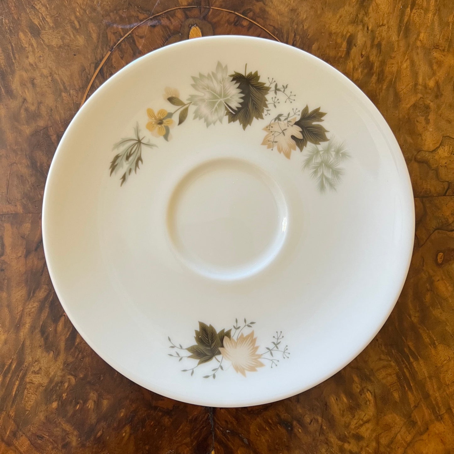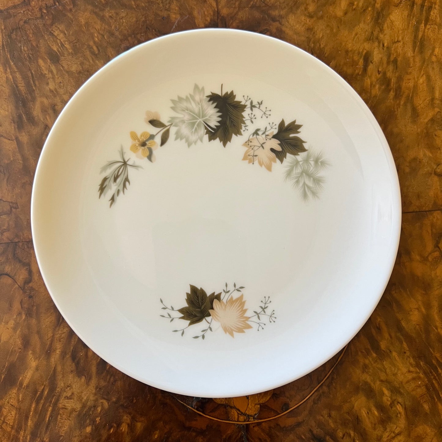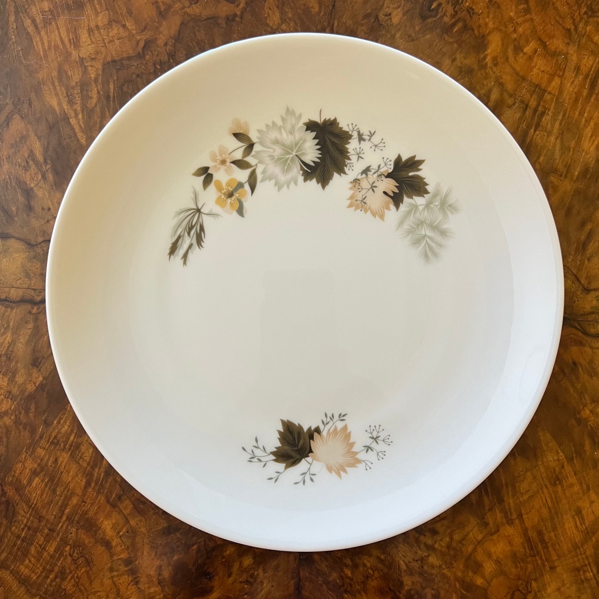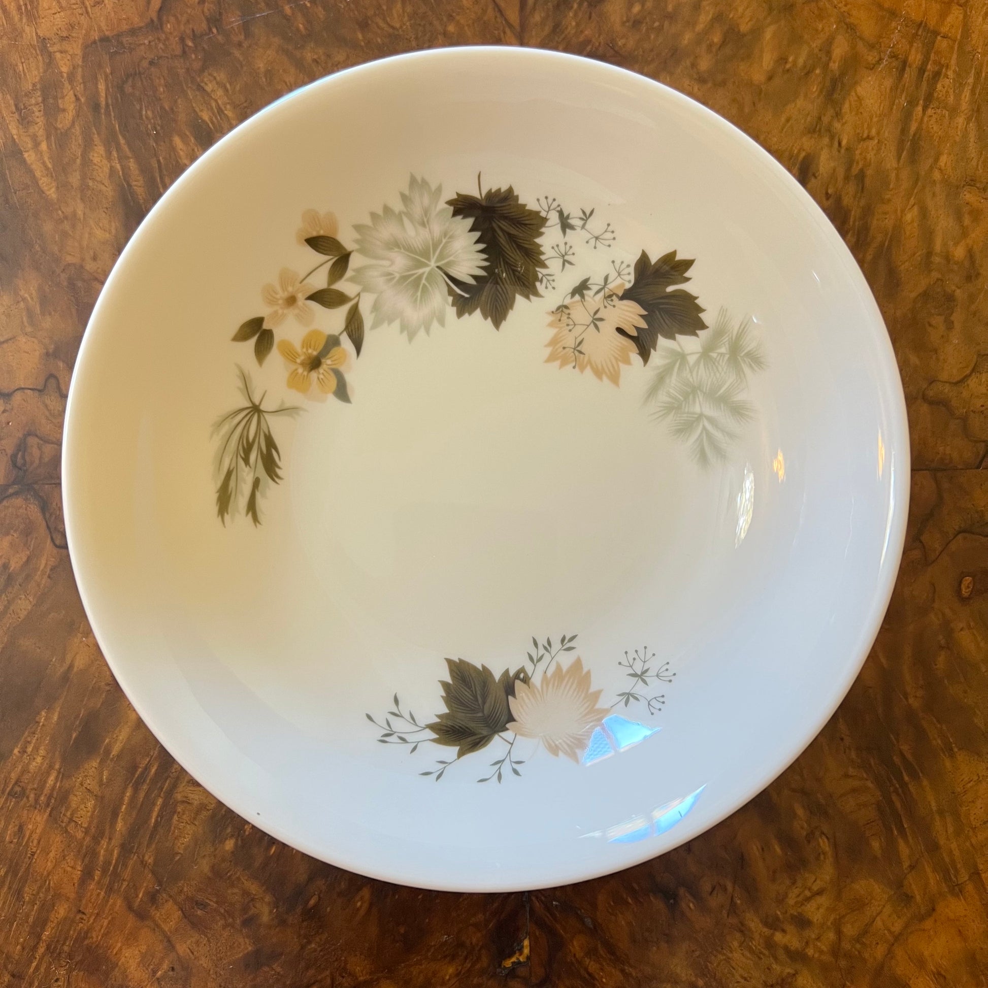 Description: Pink and brown leaves print with yellow and print florals, some scratches to print, stamped Royal Doulton Westwood