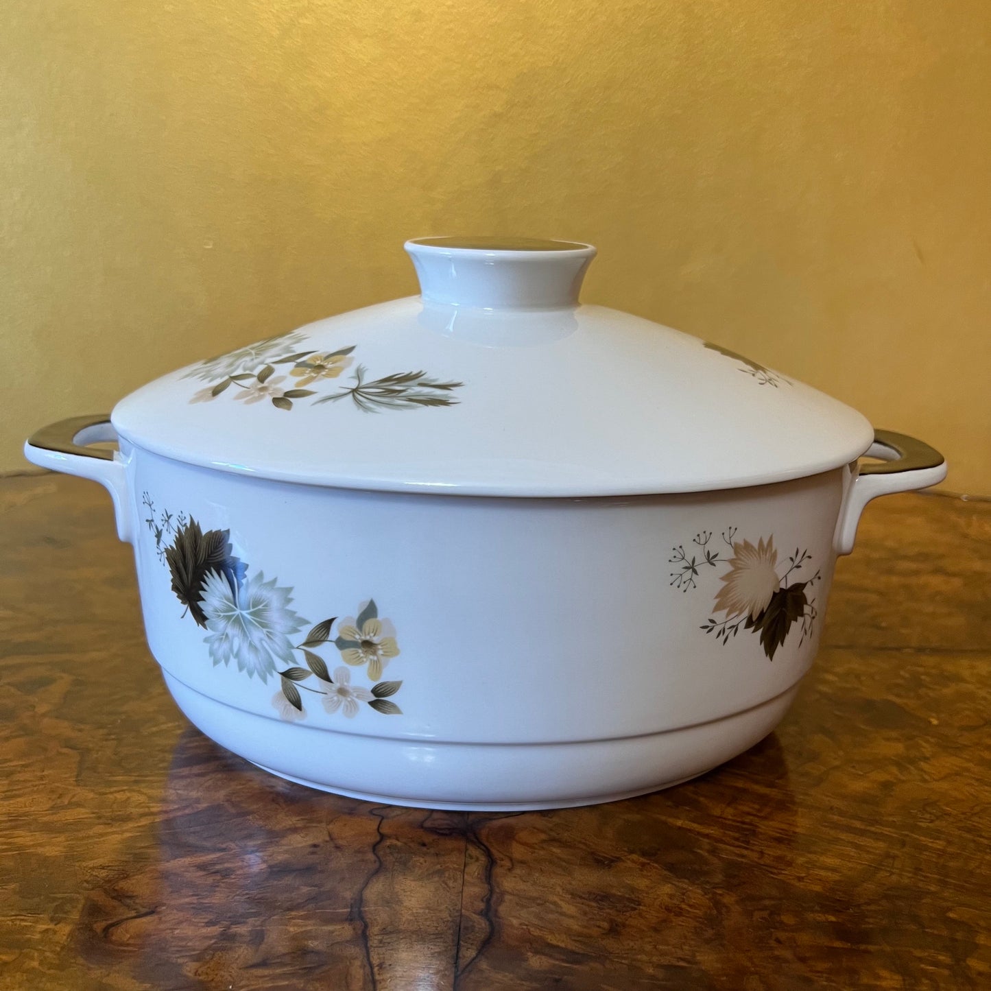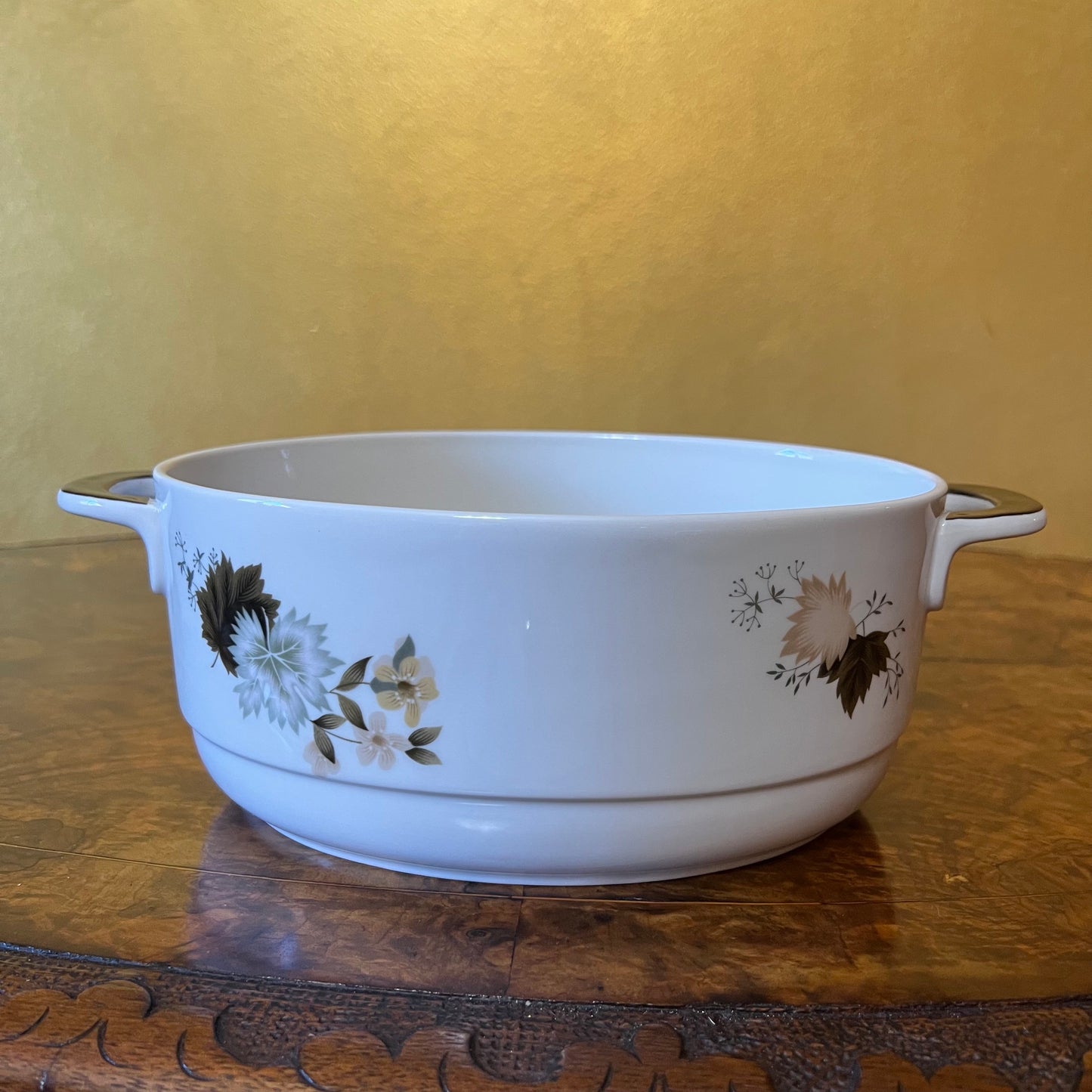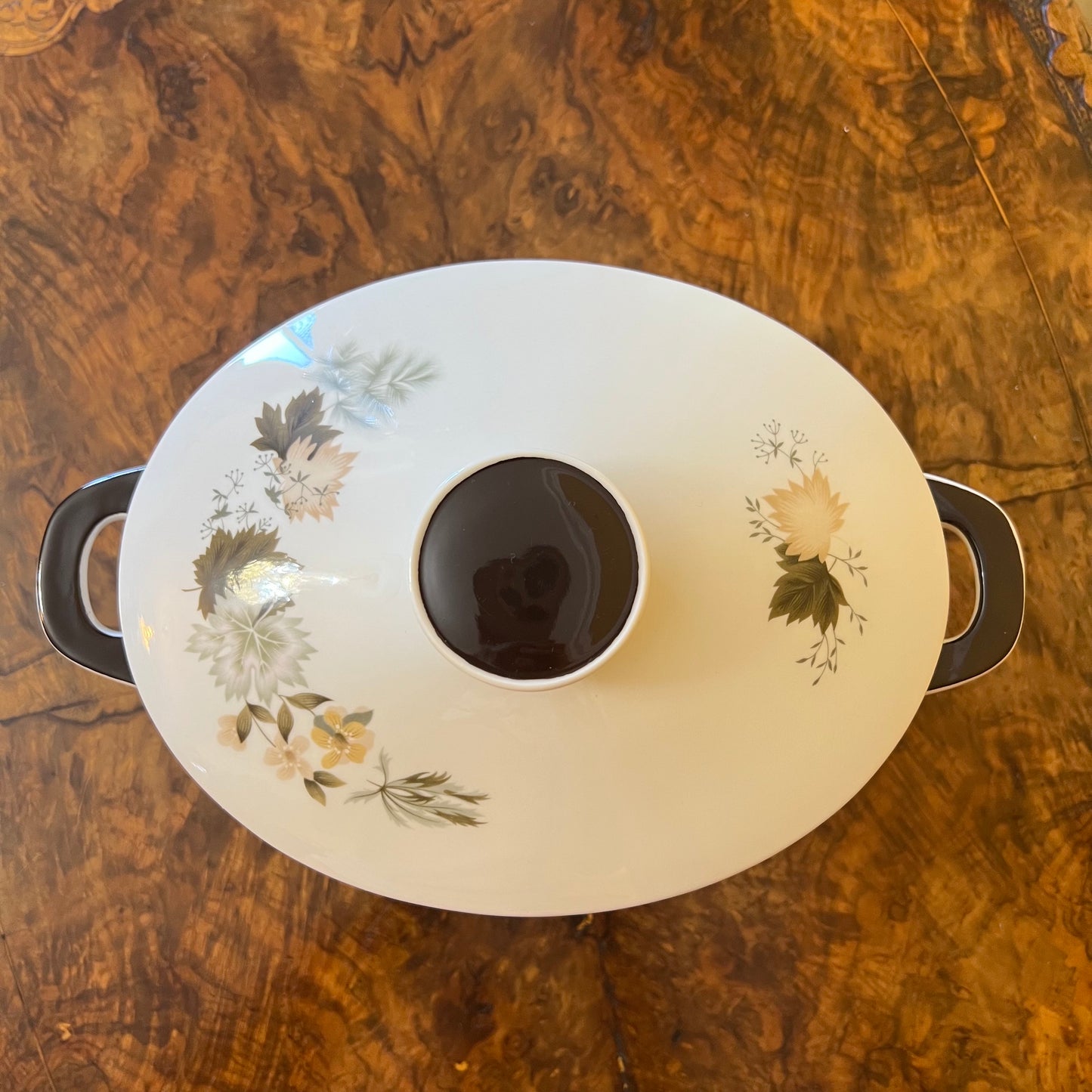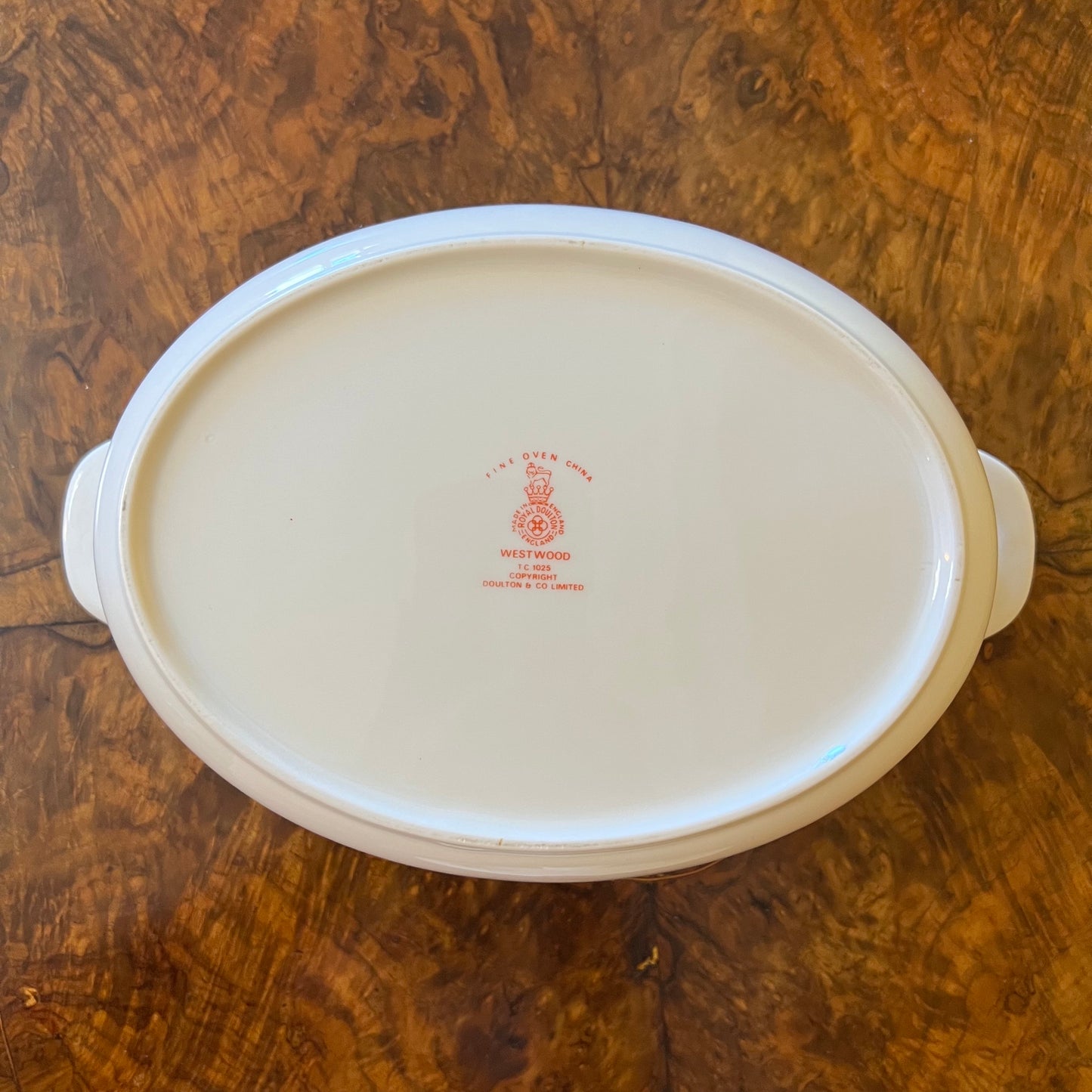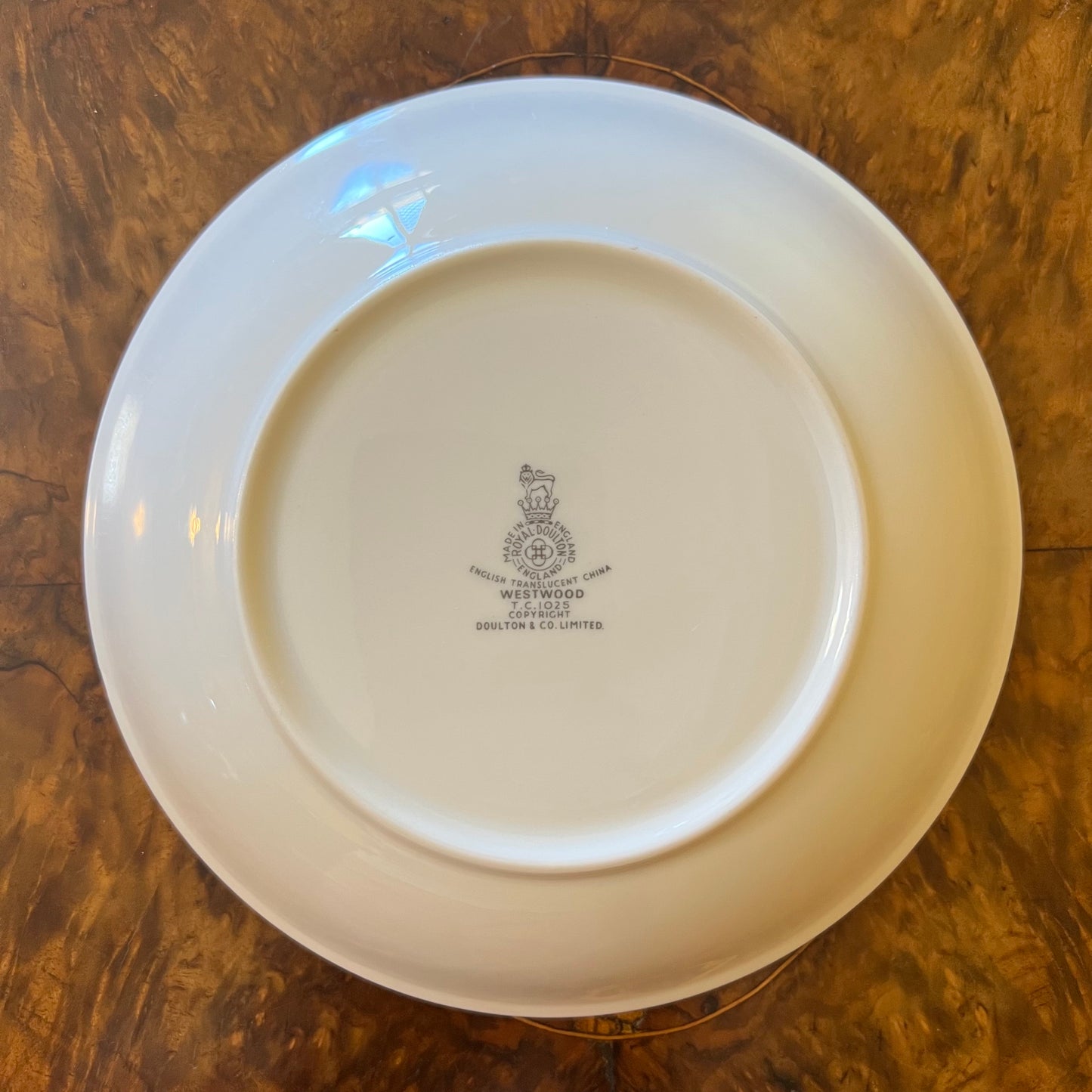 Description: Pink and brown leaves print with yellow and print florals, some scratches to print, stamped Royal Doulton Westwood