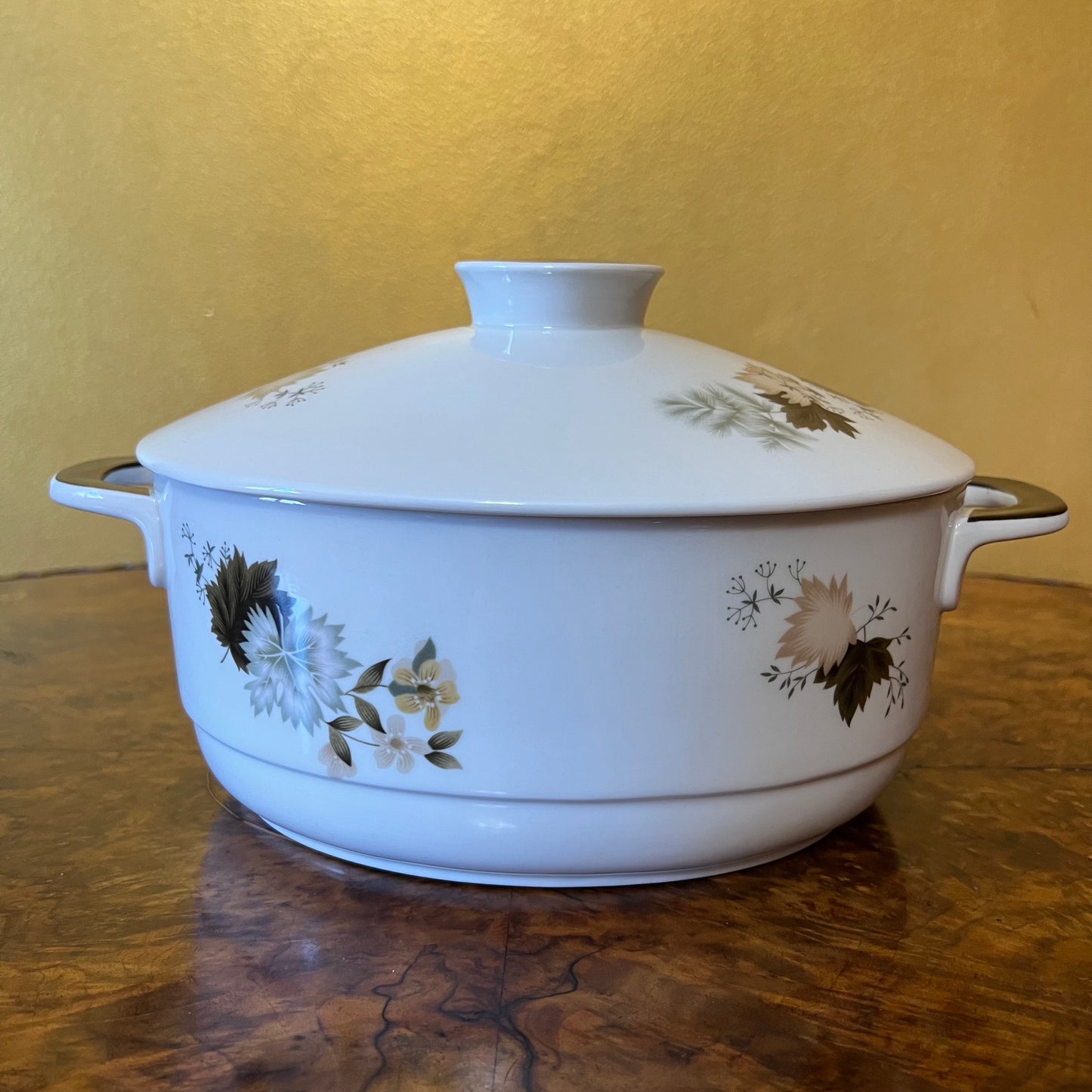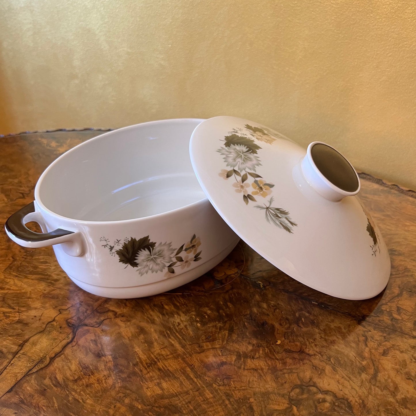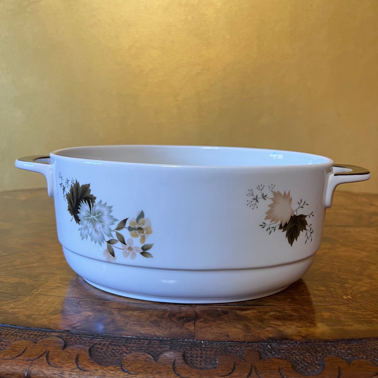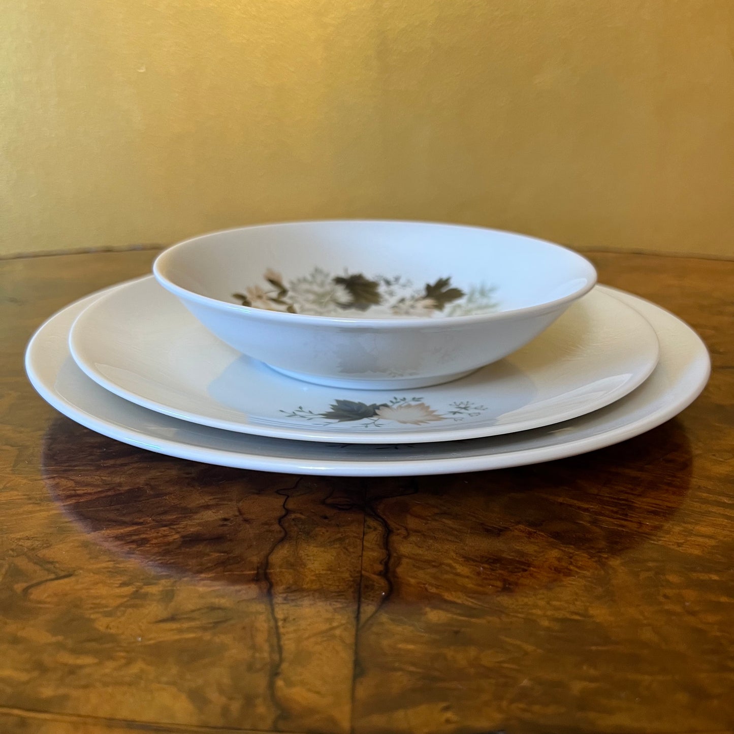 Description: Pink and brown leaves print with yellow and print florals, some scratches to print, stamped Royal Doulton Westwood