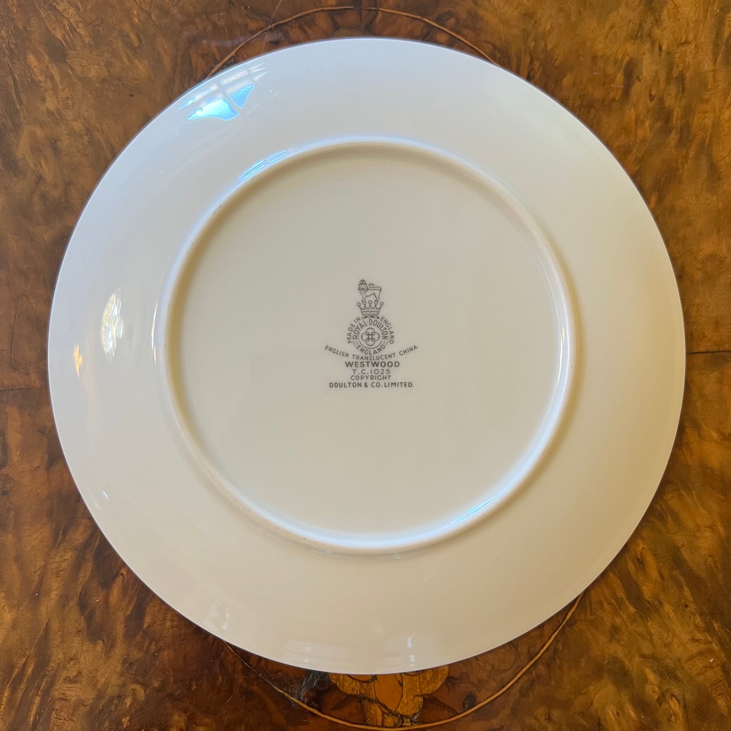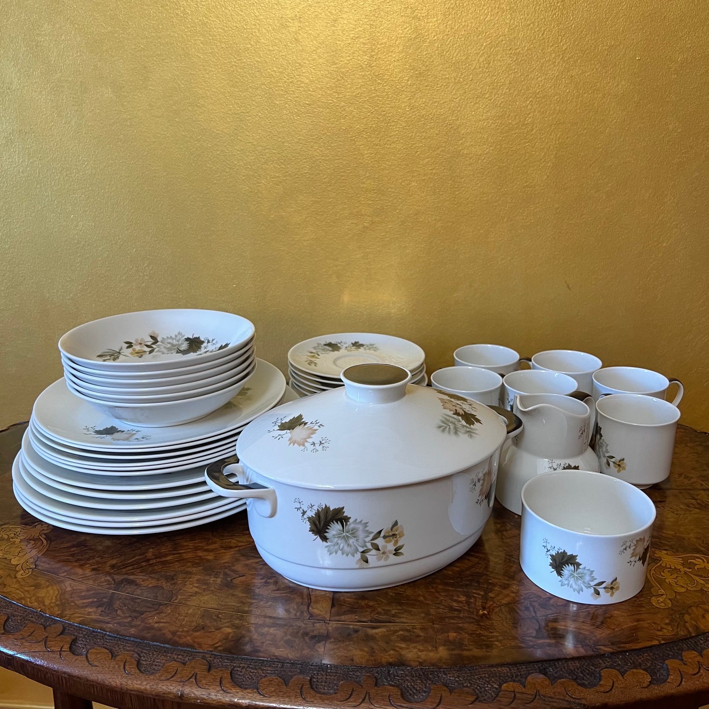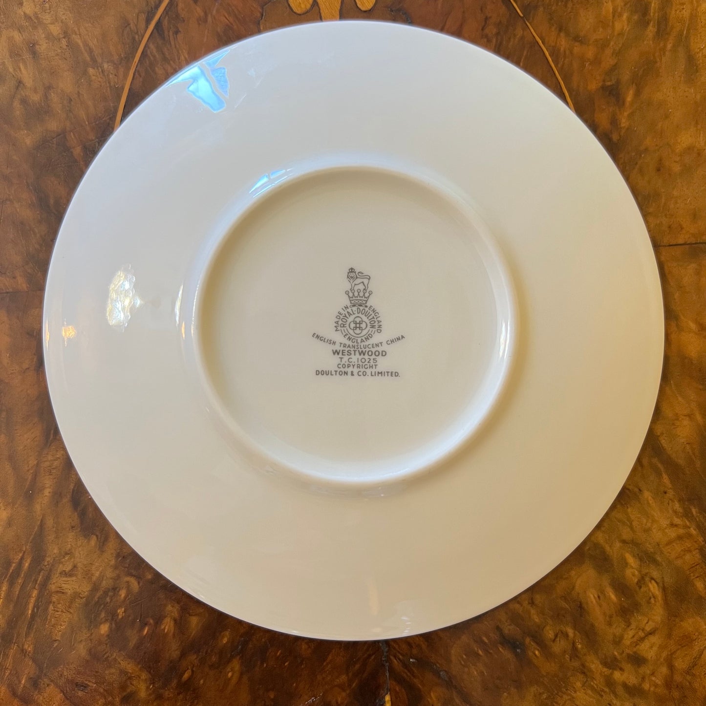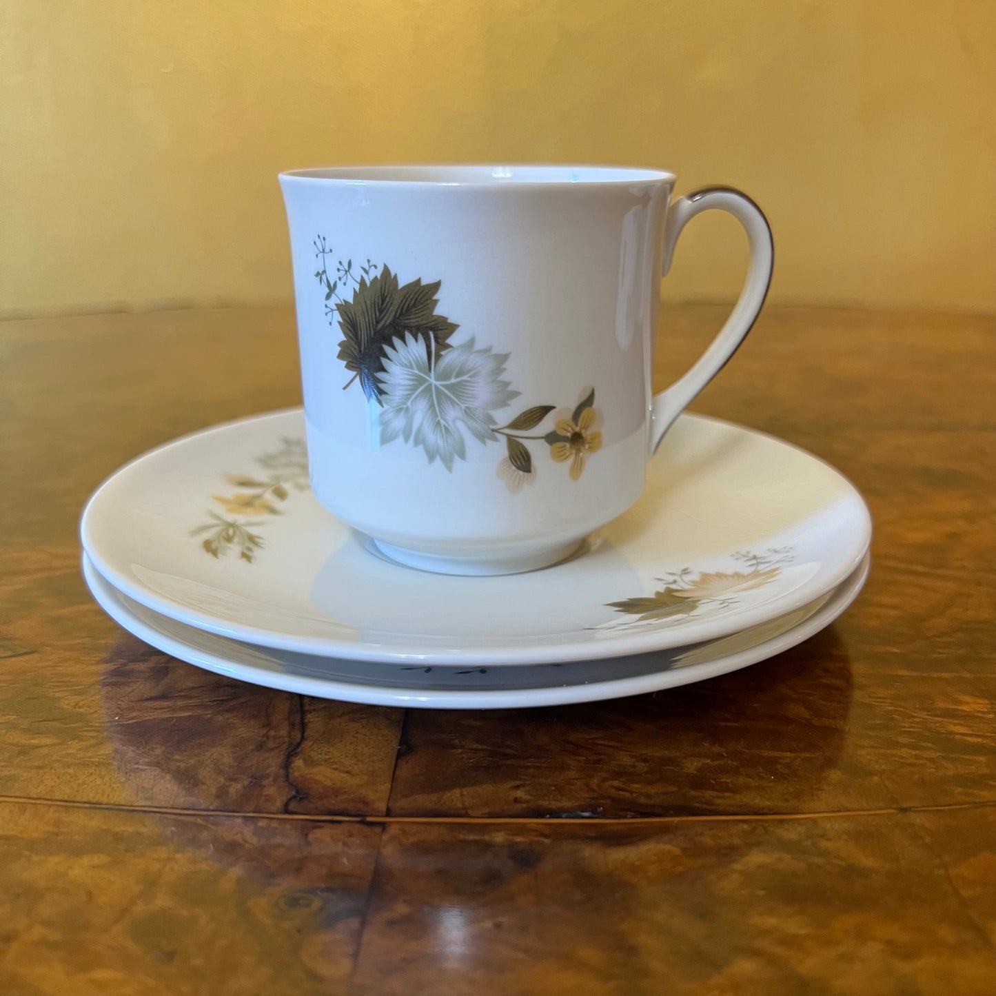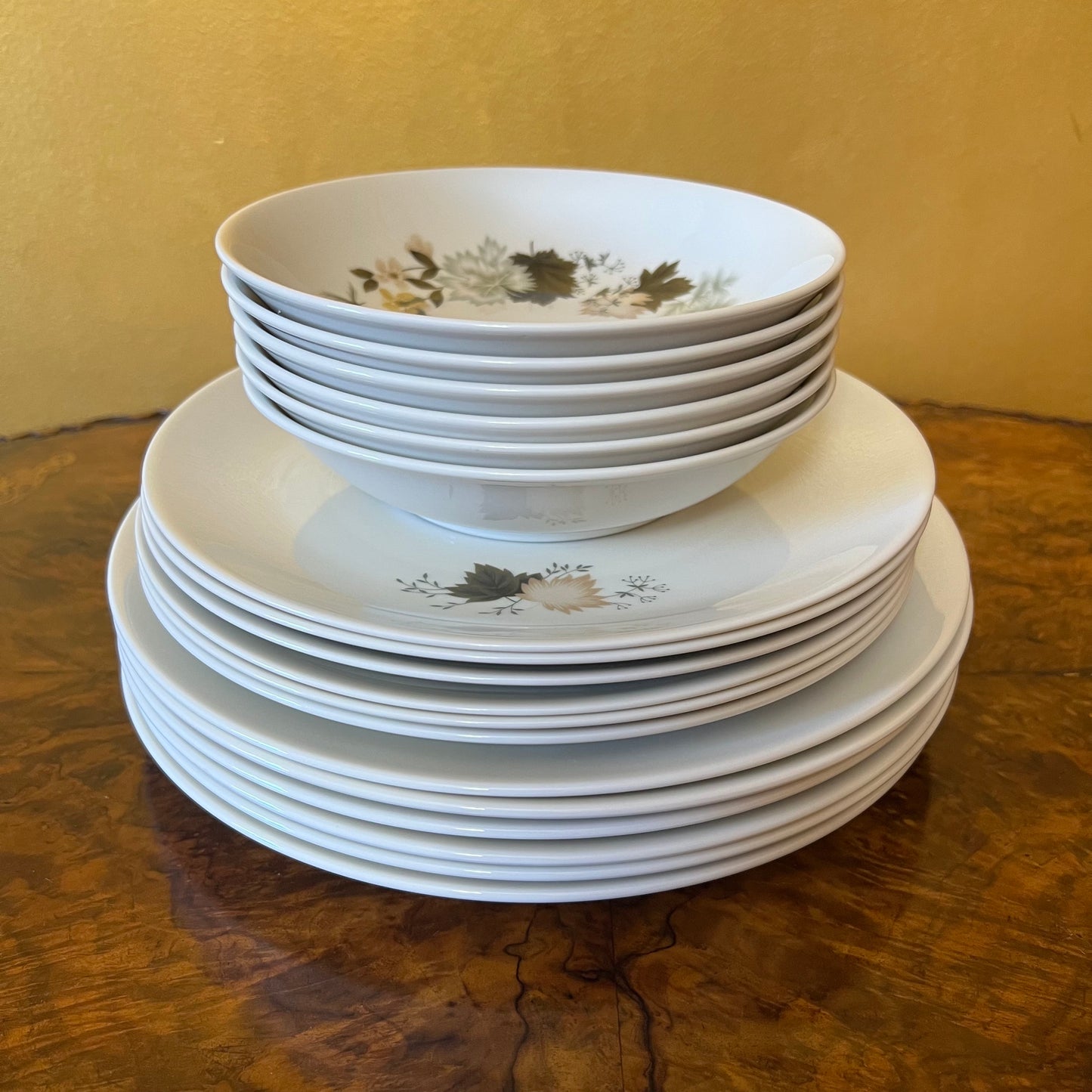 Description: Pink and brown leaves print with yellow and print florals, some scratches to print, stamped Royal Doulton Westwood