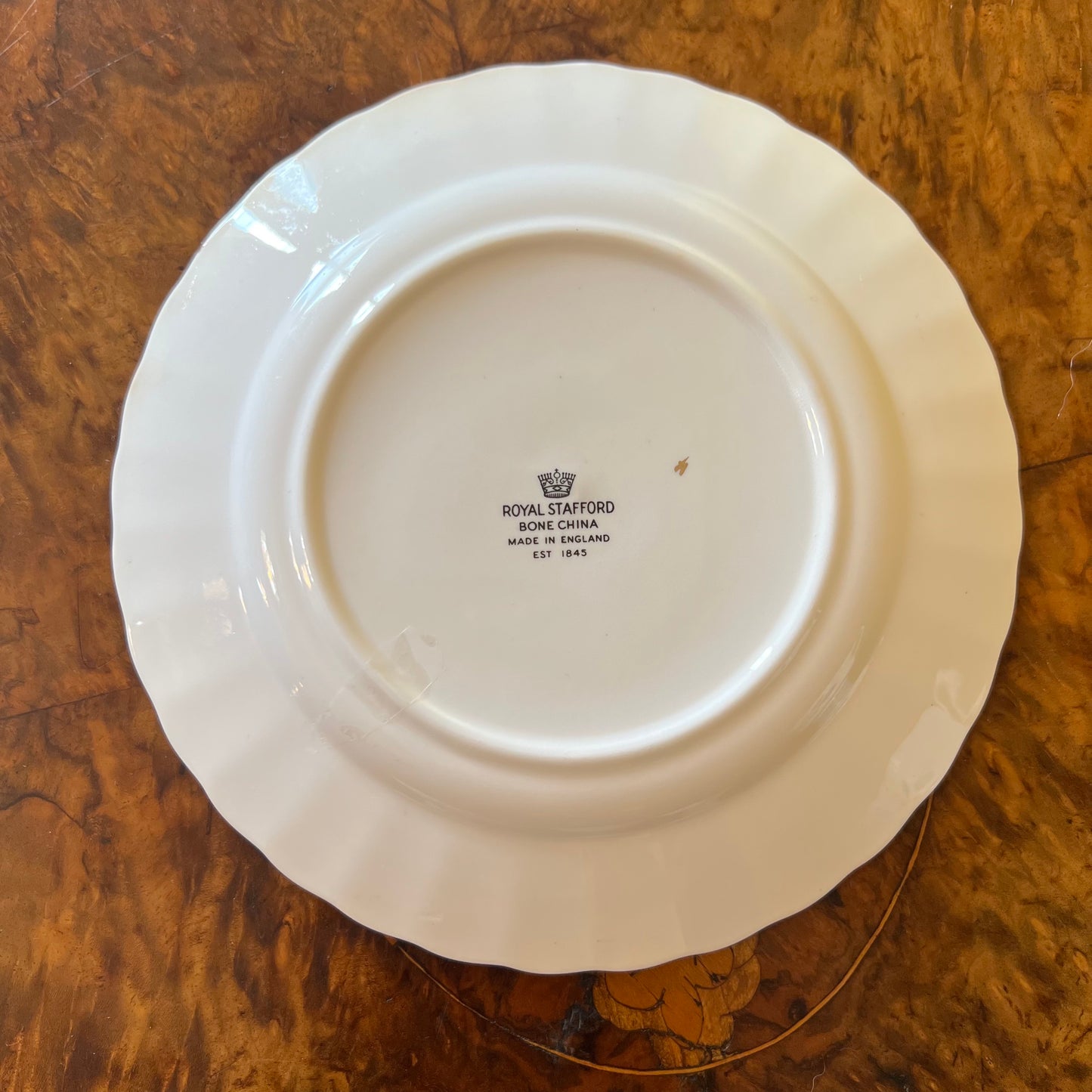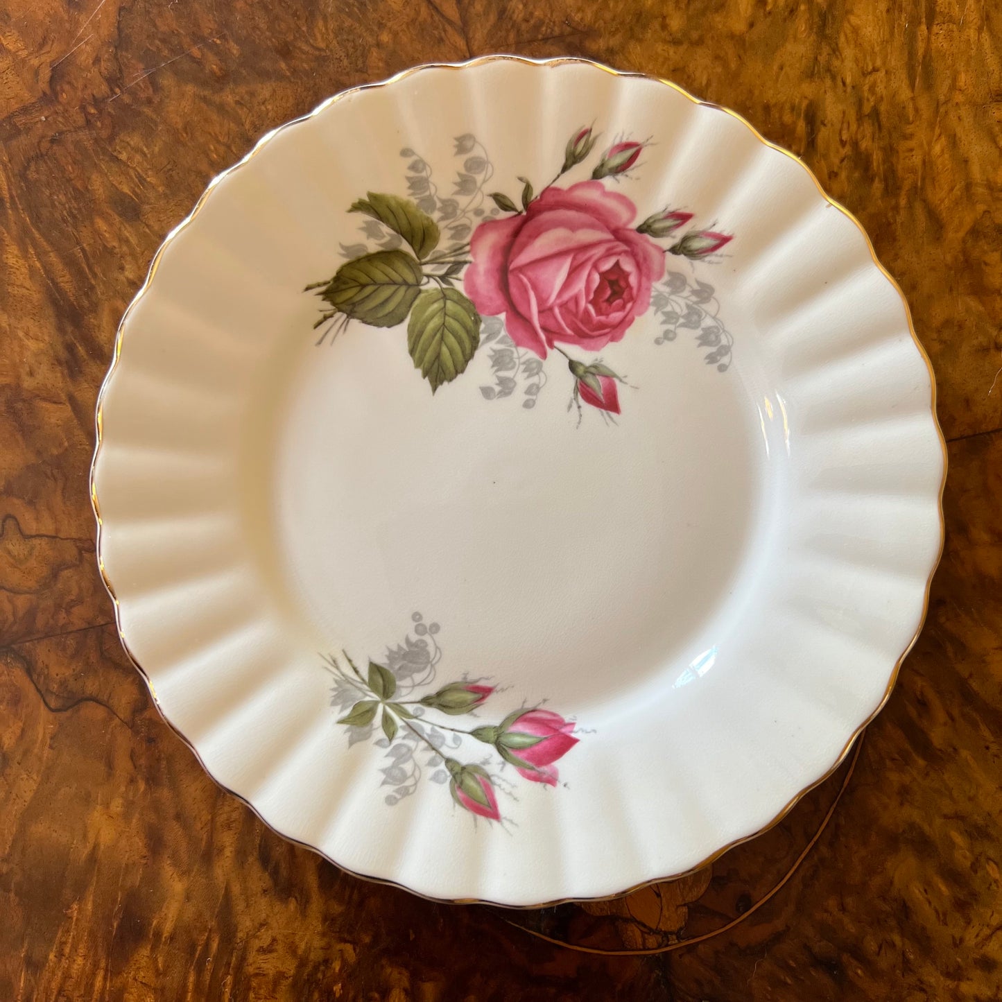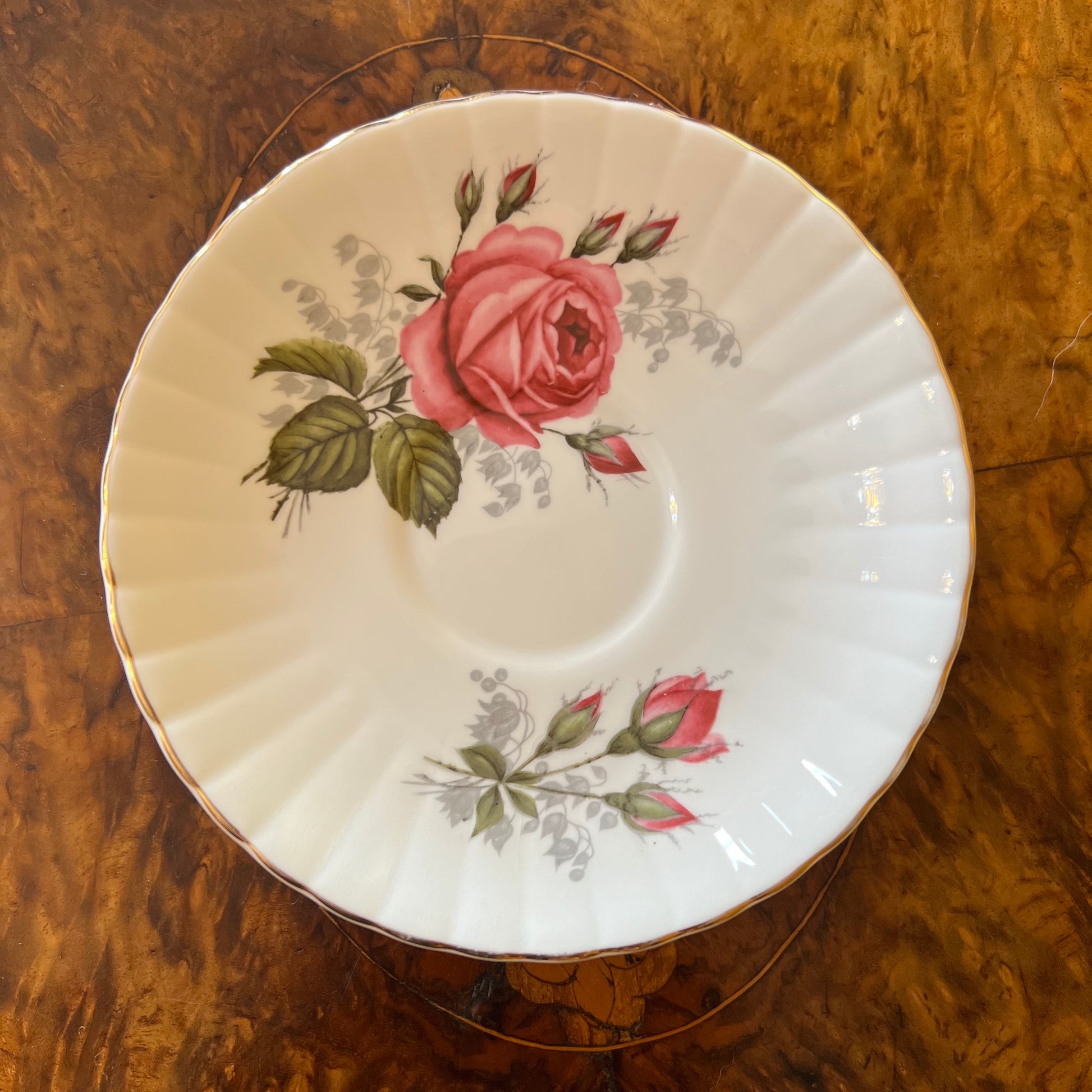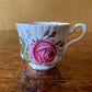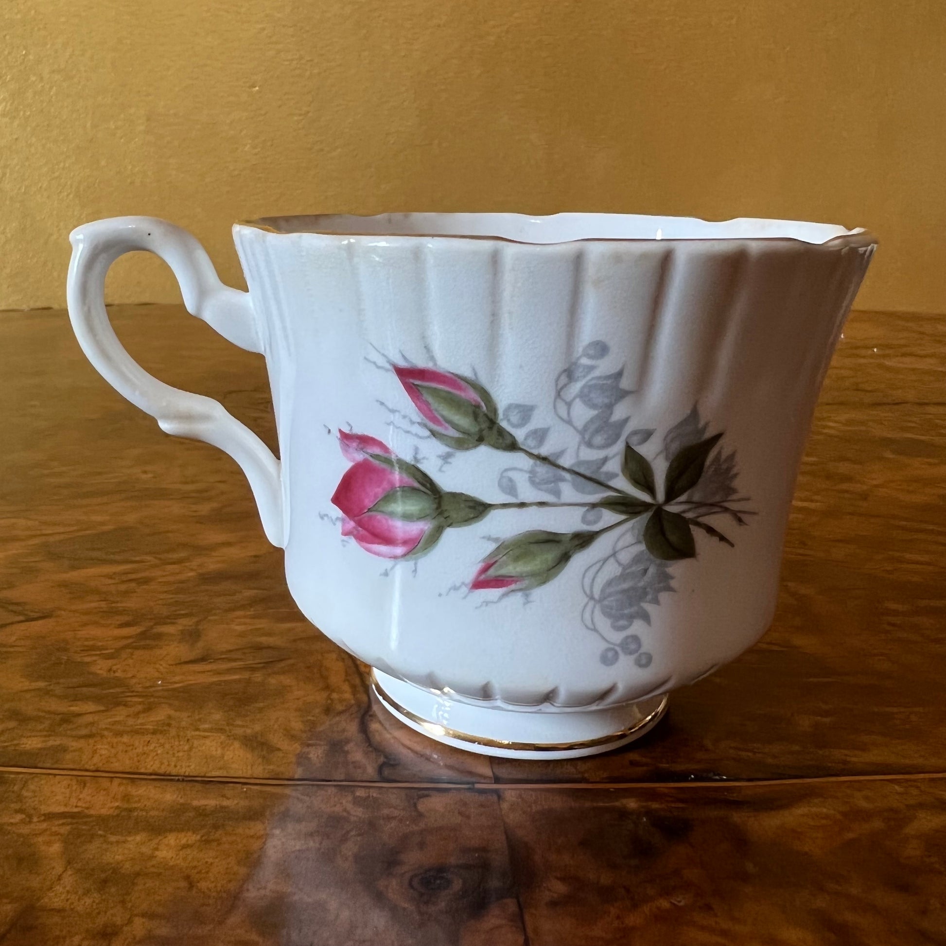 Description: Pink rose with gold trim, some wear to gold trim on cup rim, stamped Royal Stafford