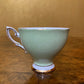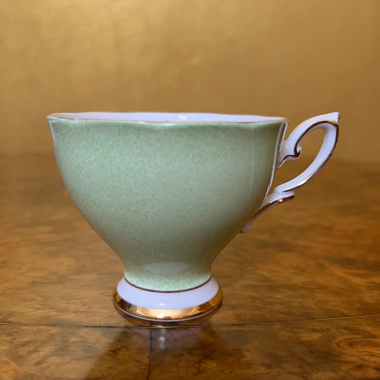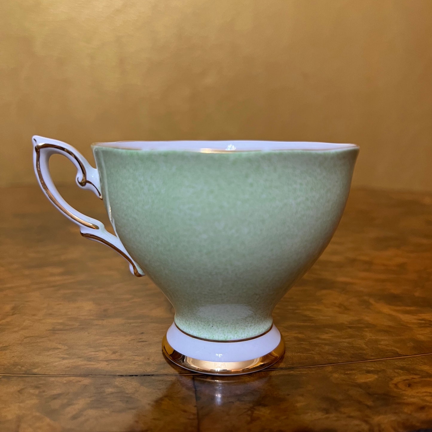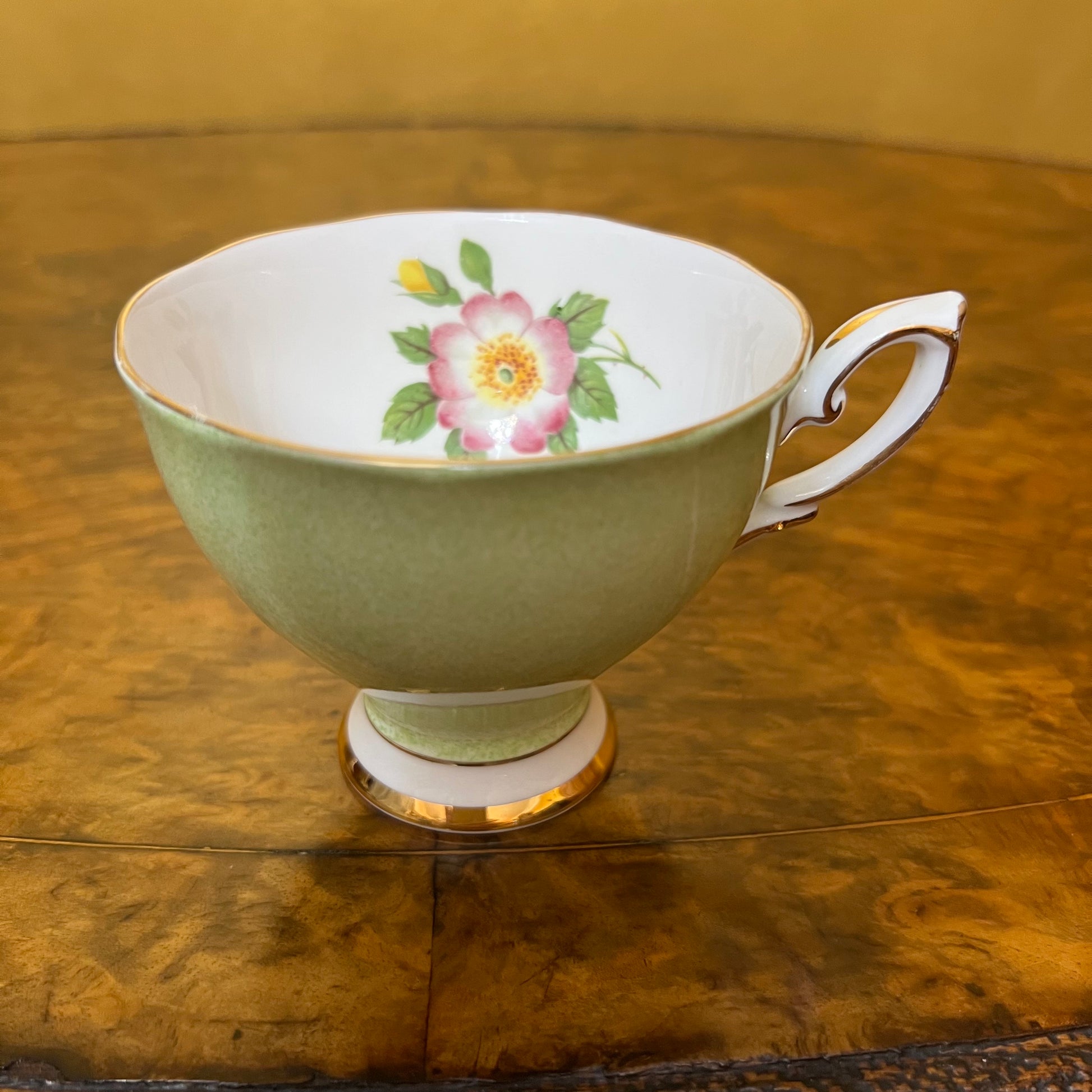 Description: Green cup with floral print and gold trim, wear and fade to gold trim, stamped Royal Standard
