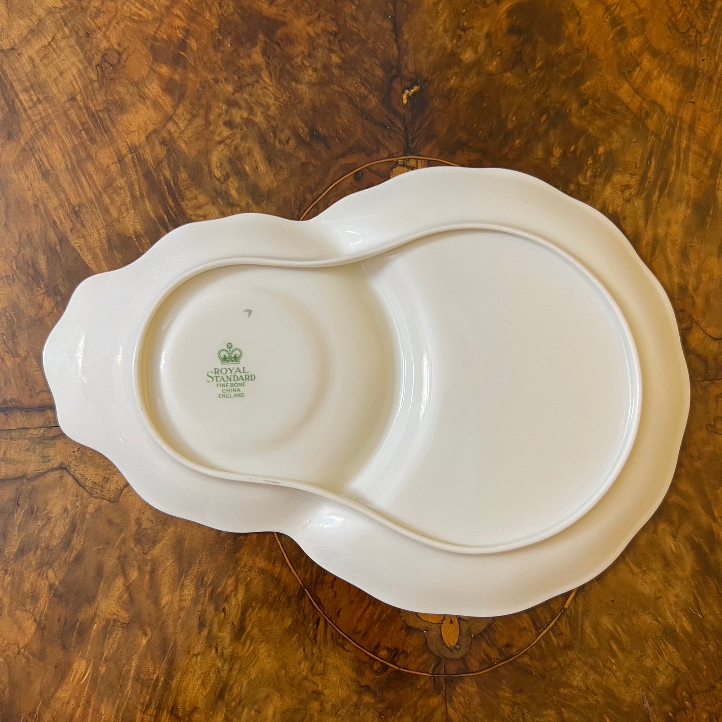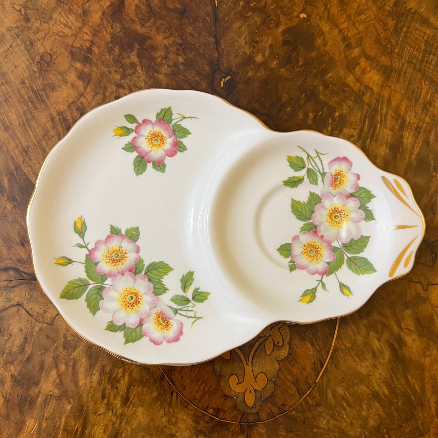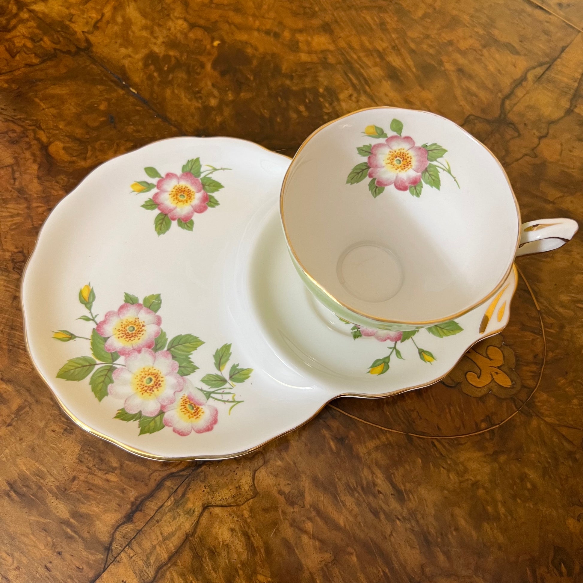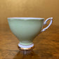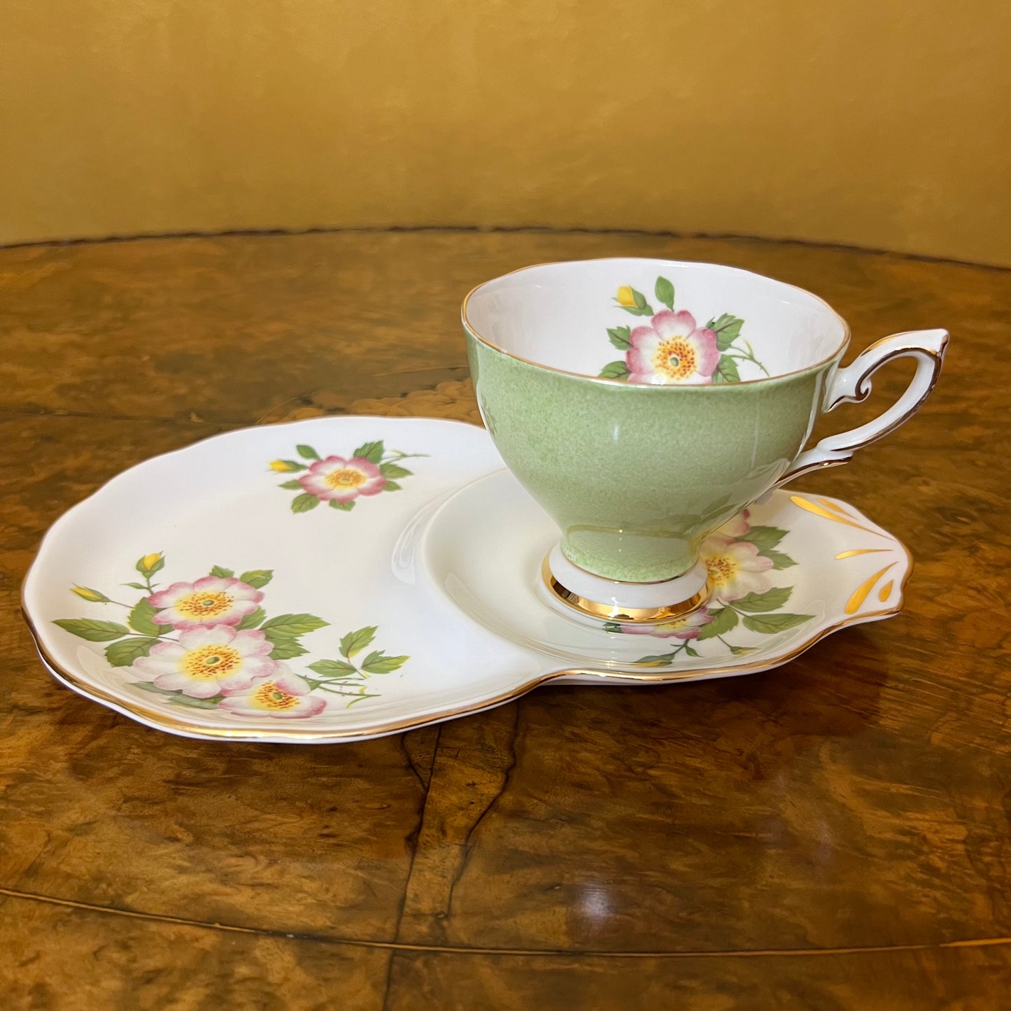 Description: Green cup with floral print and gold trim, wear and fade to gold trim, stamped Royal Standard