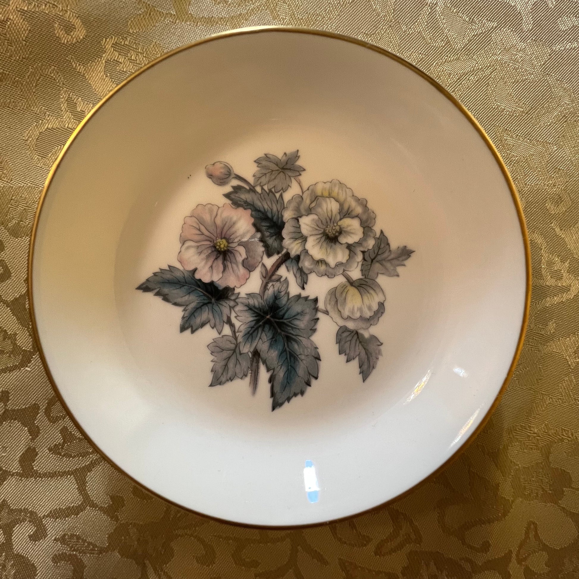 Description: Grey tones floral print with gold trim. Stamped Royal Worcester