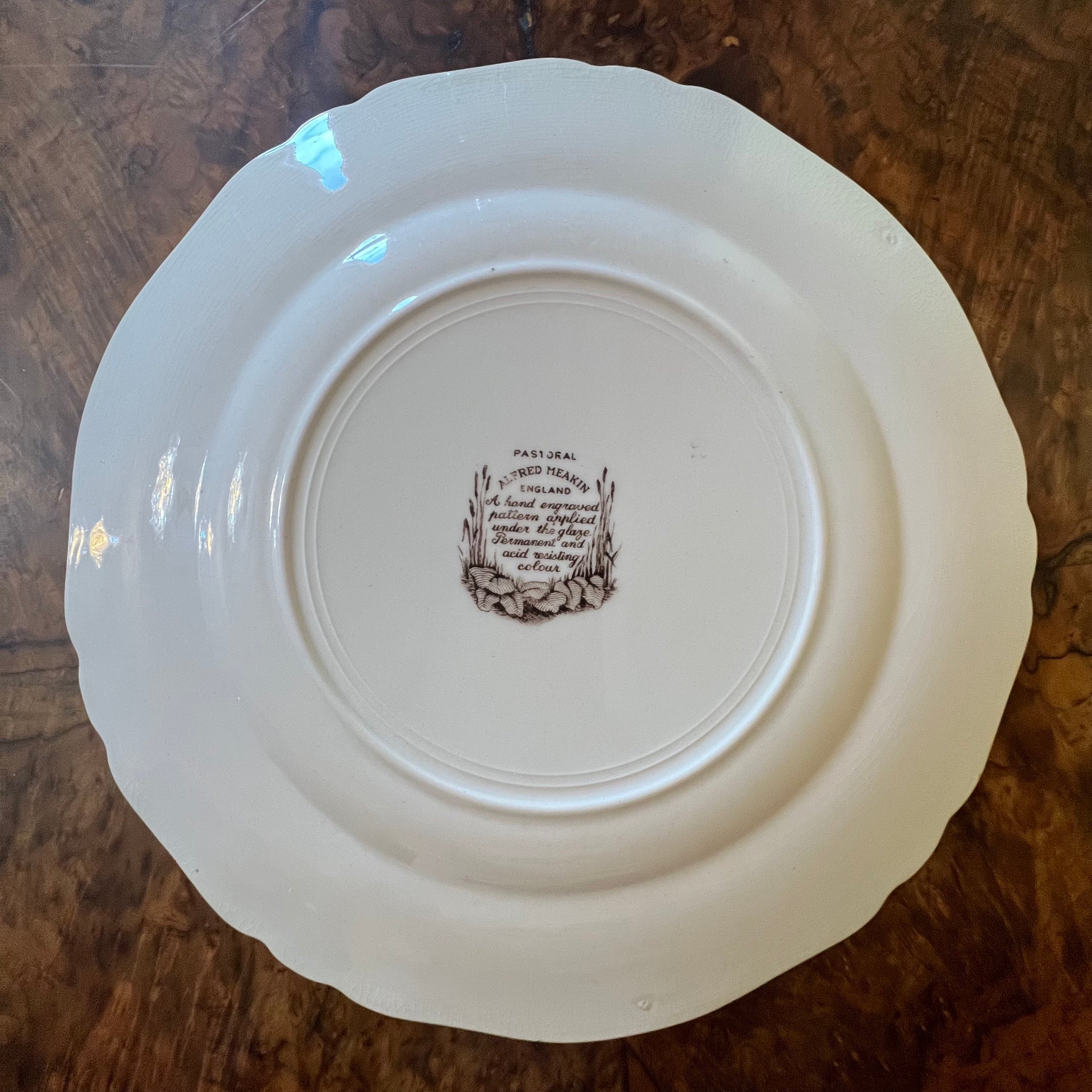 Description: Brown print farm print, crazing to plate, stamped Alfred Meakin