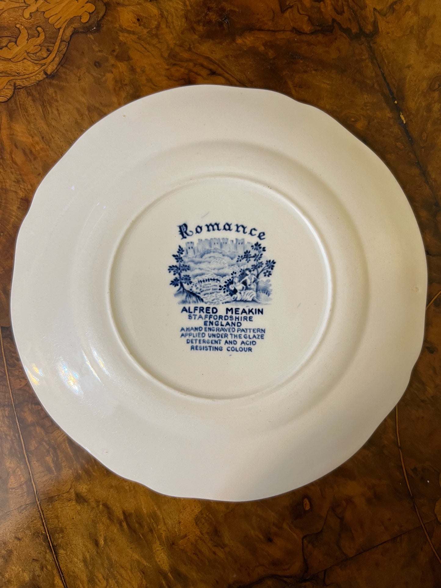 Description: Blue and white romantic scene, stamped Romanace Alread Meakin.