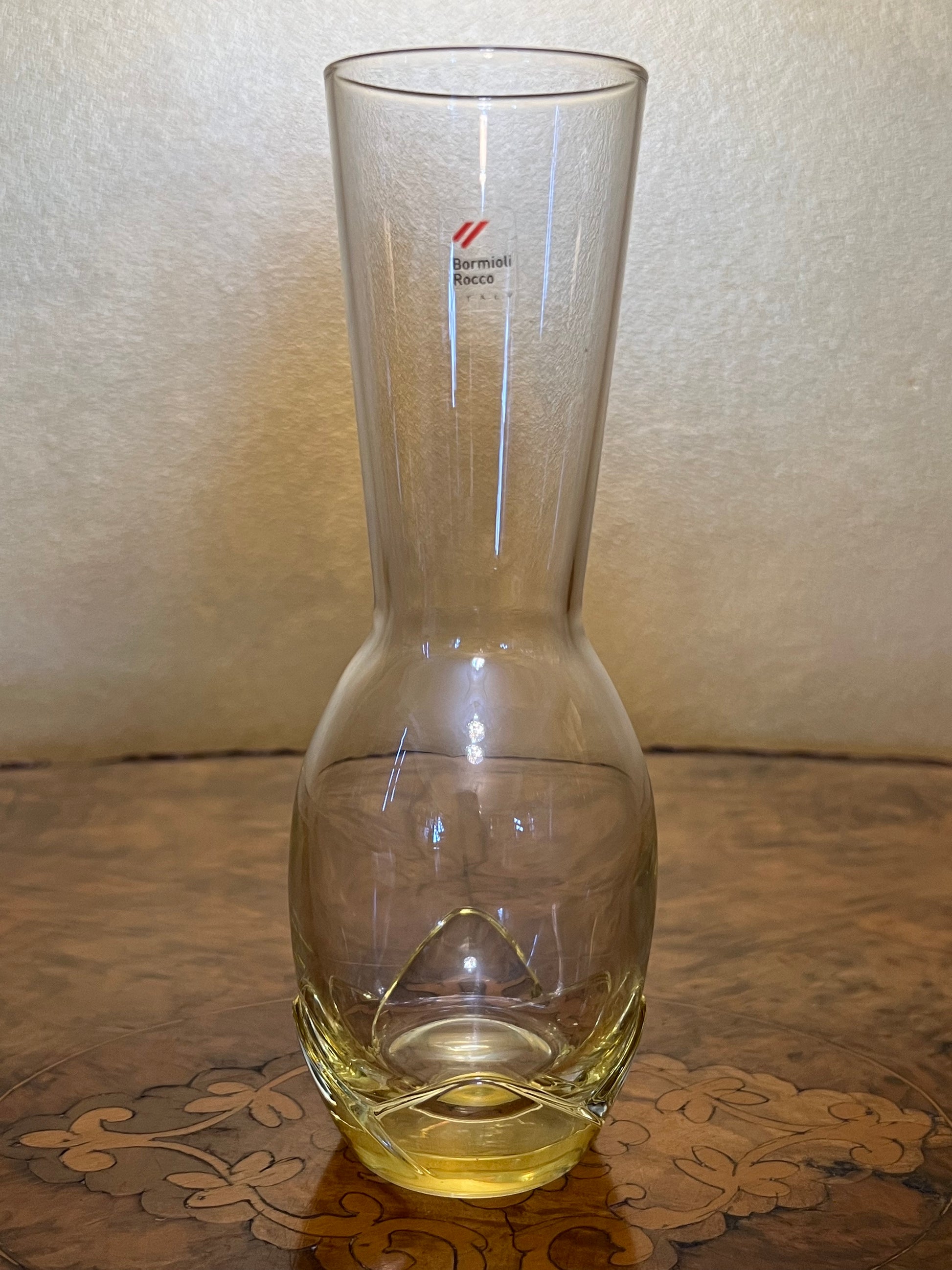 Description: Glass vase with yellow bud bottom. Sticker Bormiolo Rocco