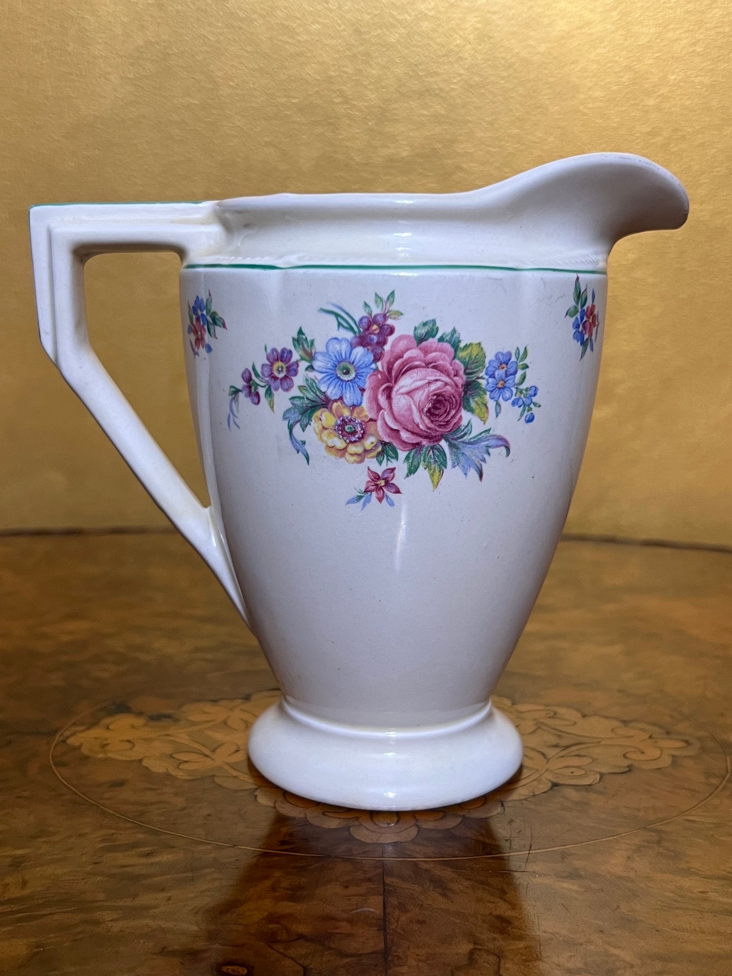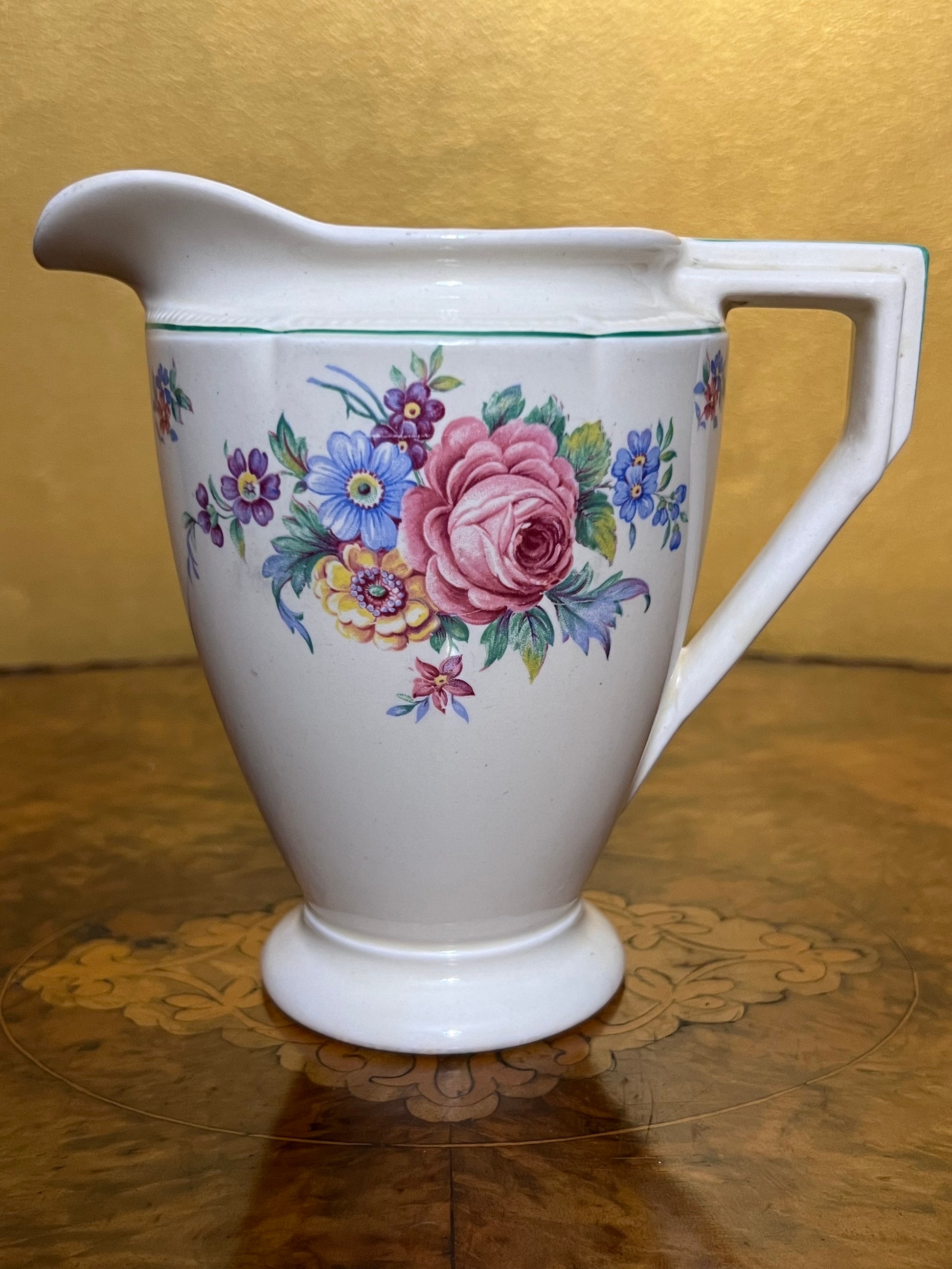 Description: Floral detail print both front and back of jug, green trimming, scratches to the print, stamped Burleigh Athlone