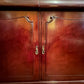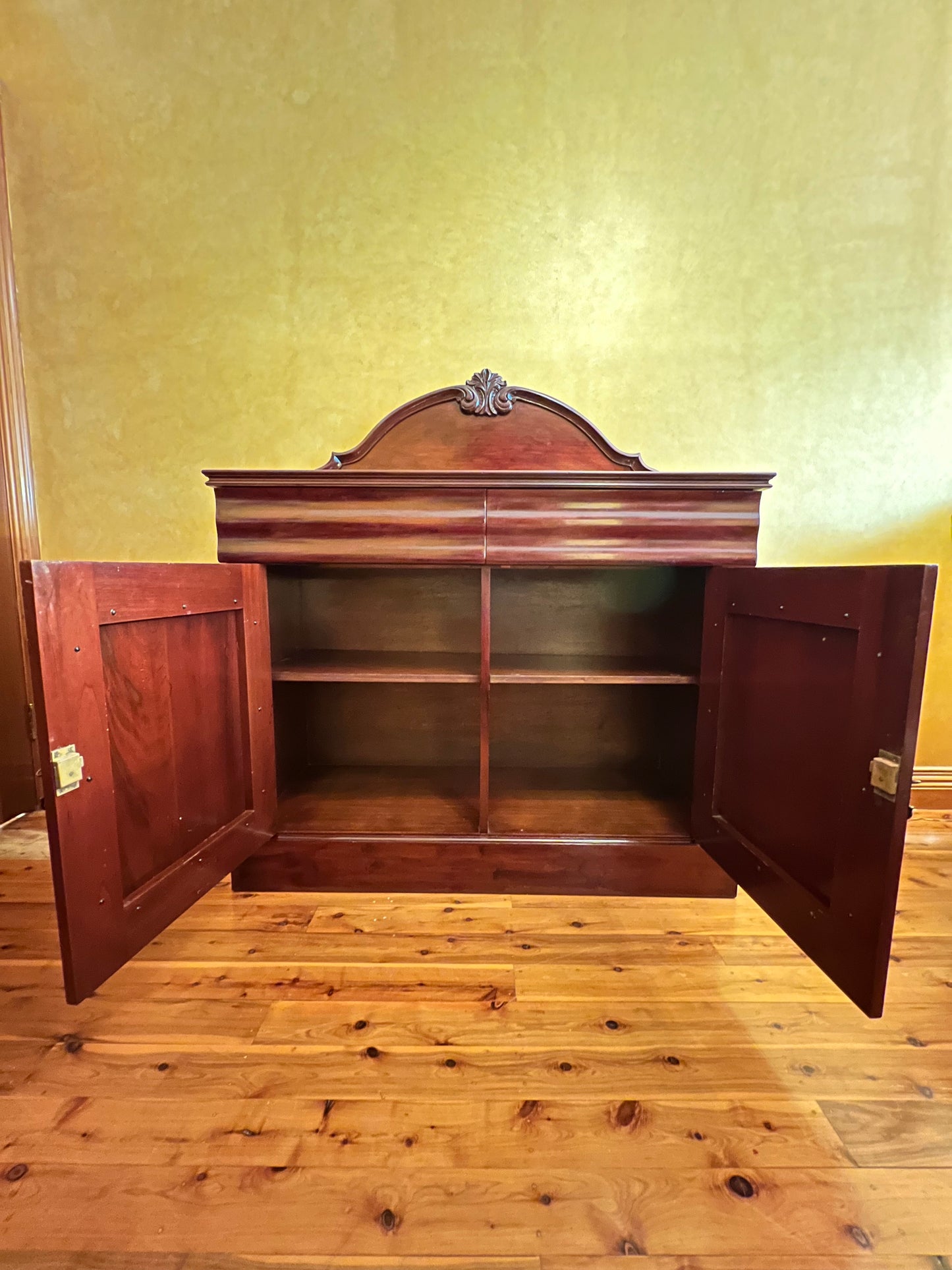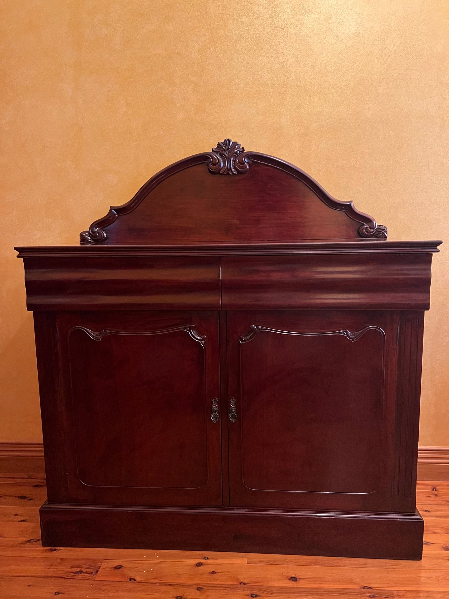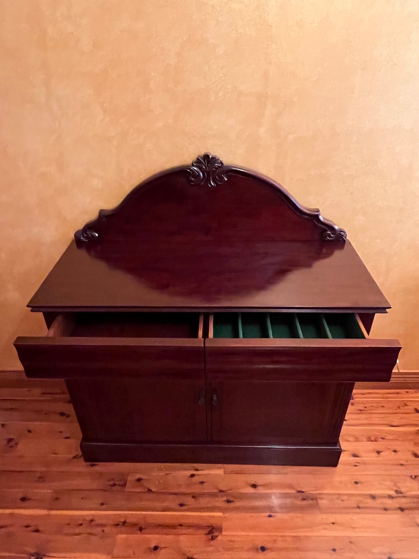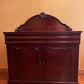Description: Carving detail to centre back board, two drawers, one drawer has a cutlery divider, two doors both sides comes with keys, two shelves, there is some cracking to the paint.