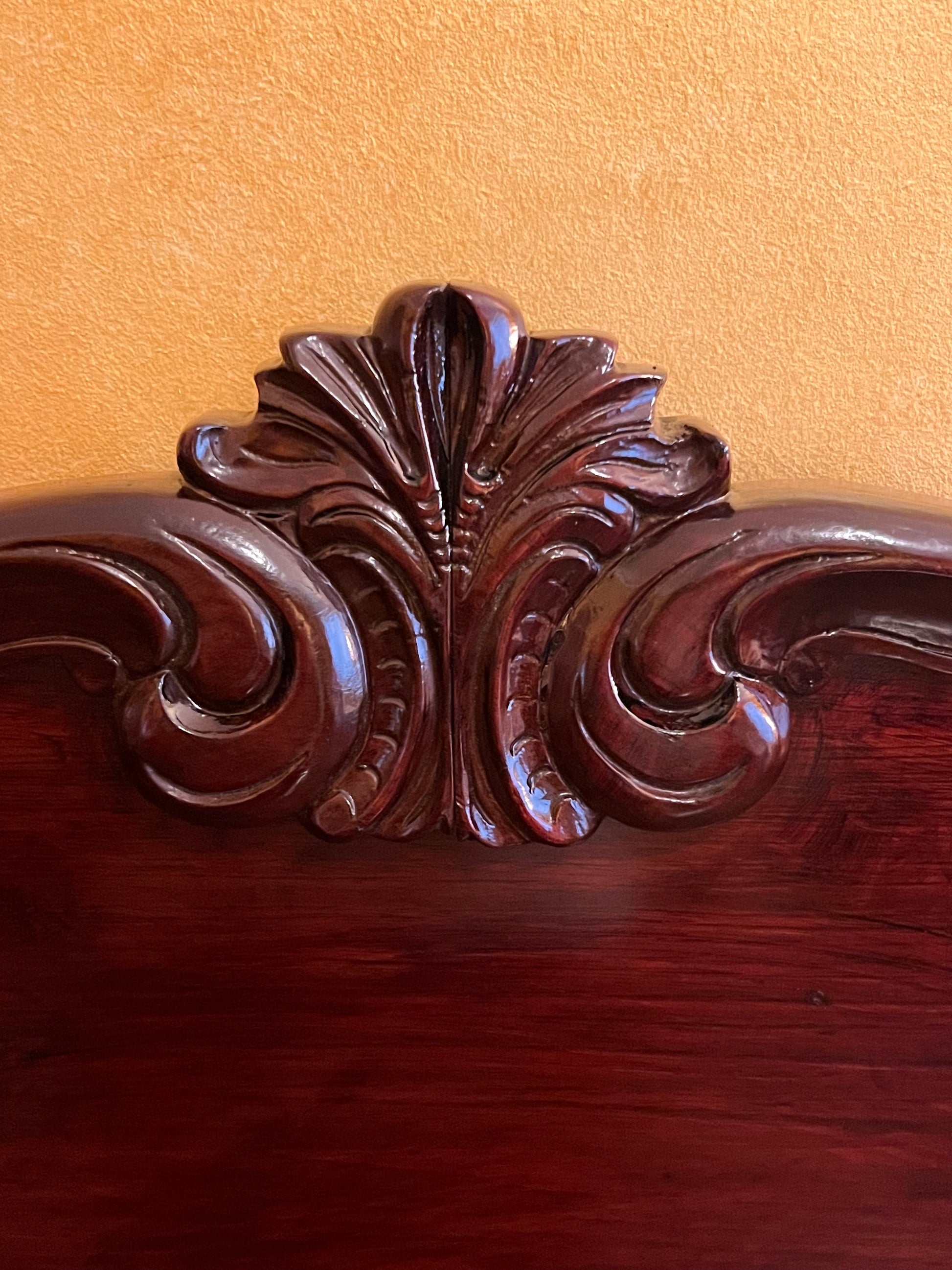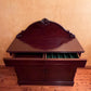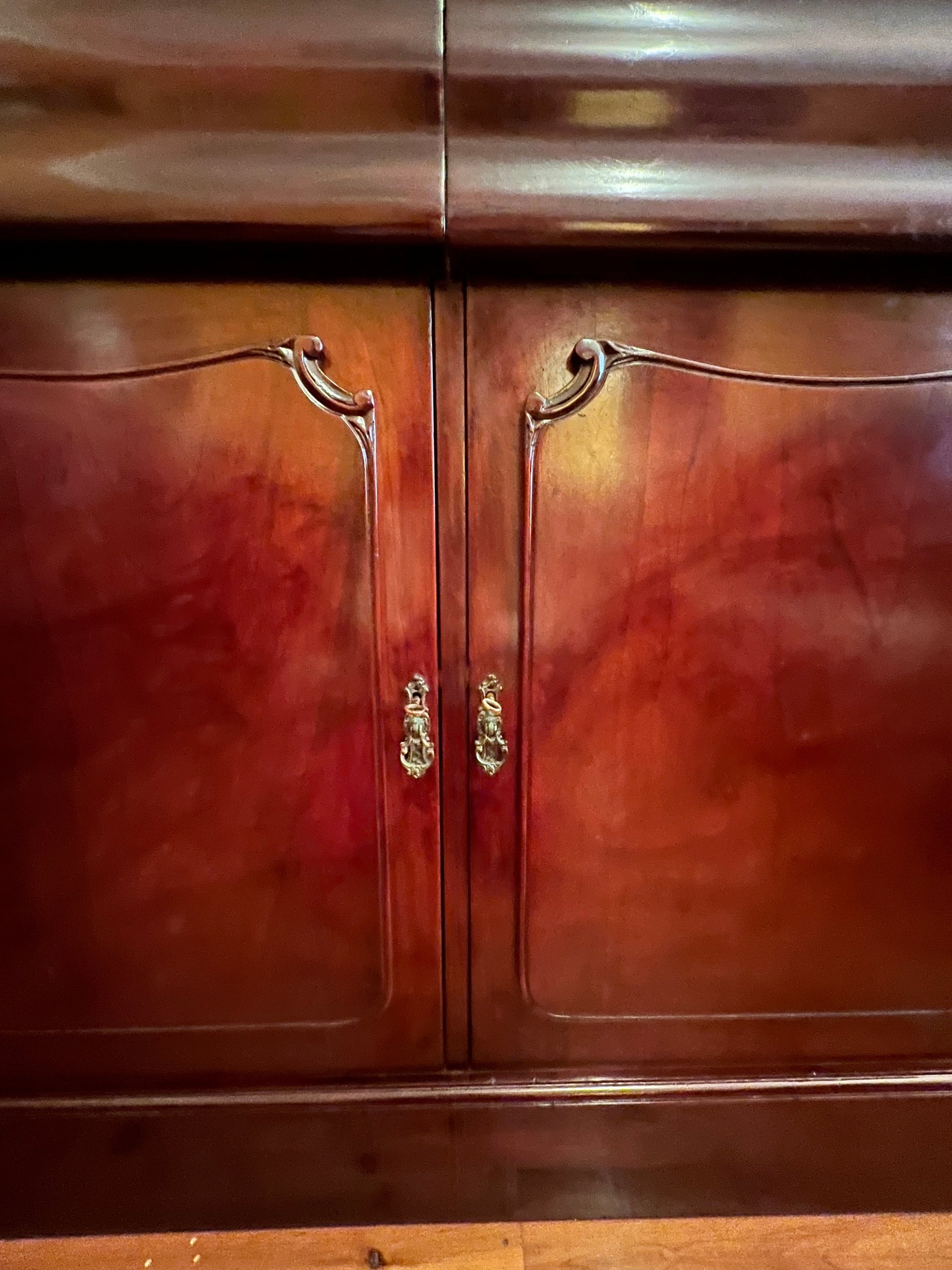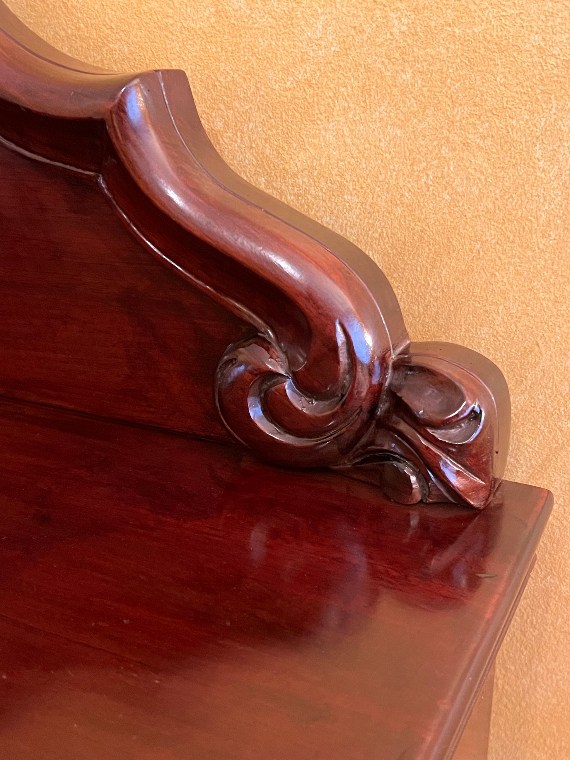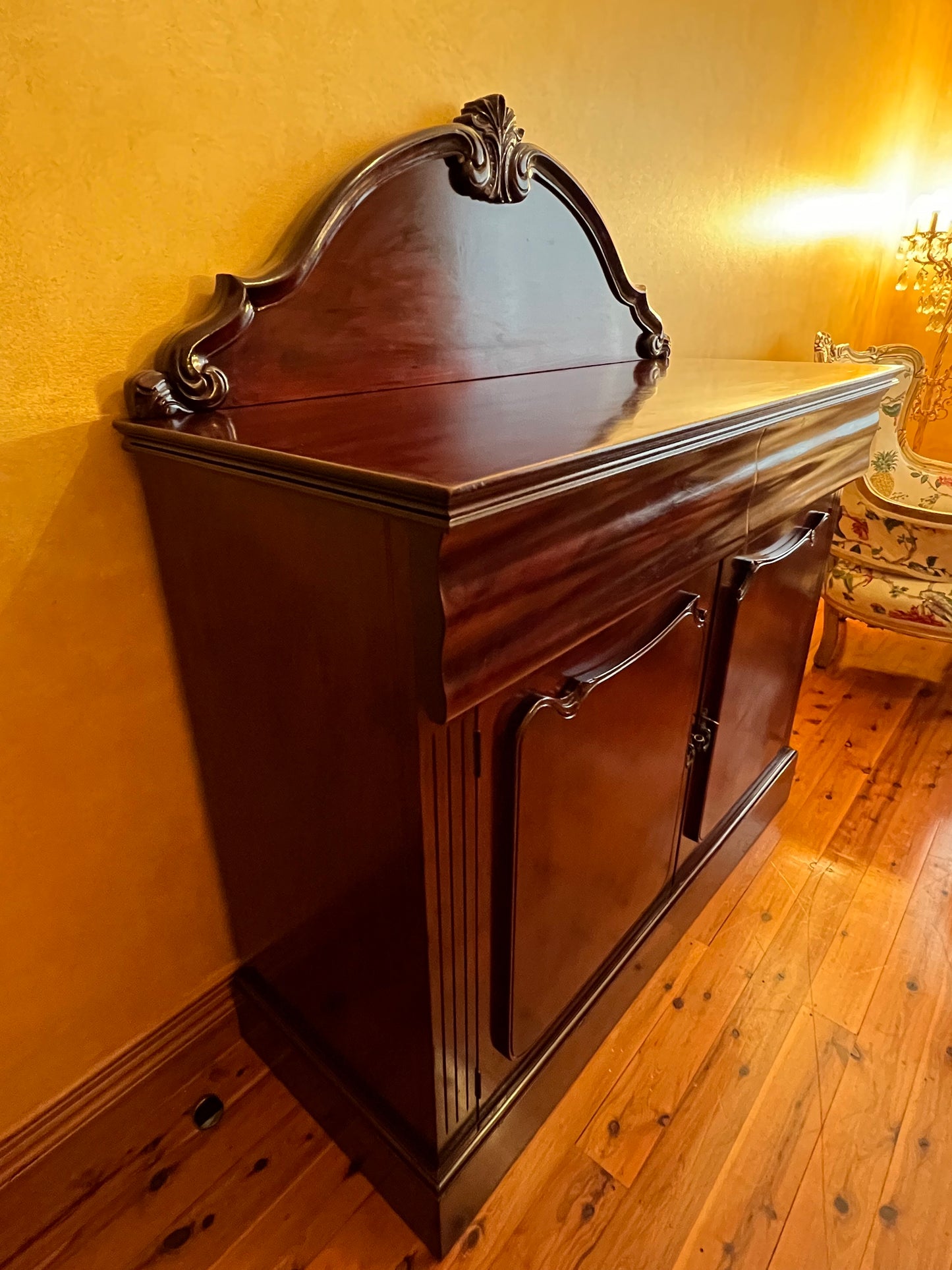 Description: Carving detail to centre back board, two drawers, one drawer has a cutlery divider, two doors both sides comes with keys, two shelves, there is some cracking to the paint.