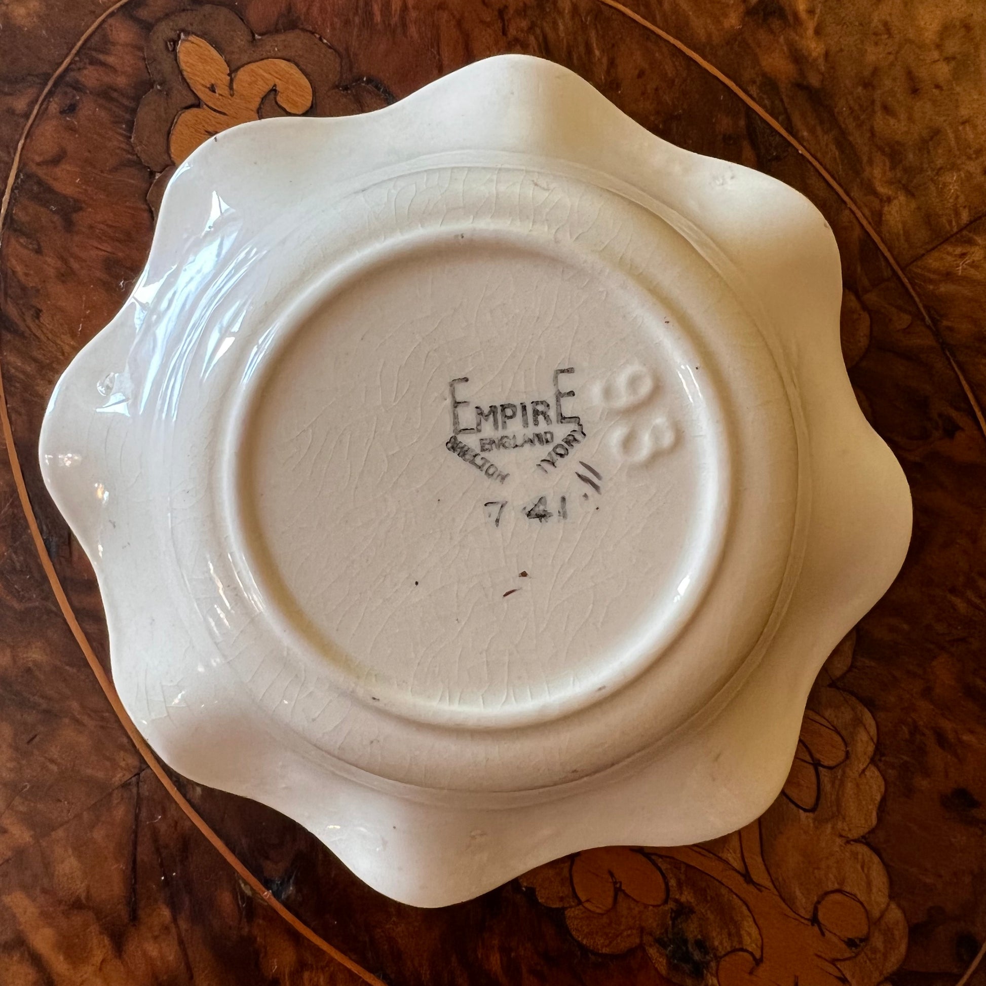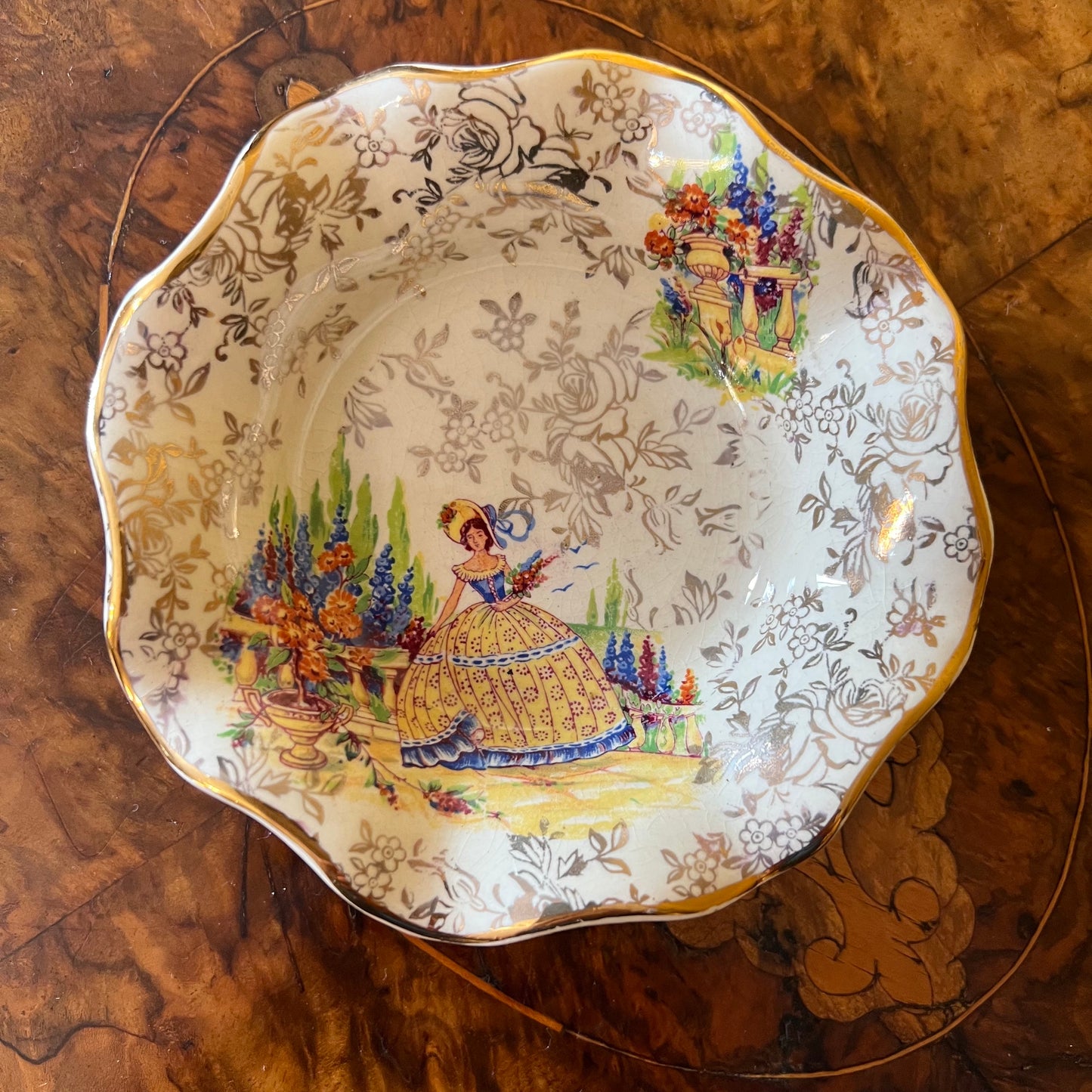 Description: Lady print in the garden, with gold print border and trim, slight wear to print, stamped Empire