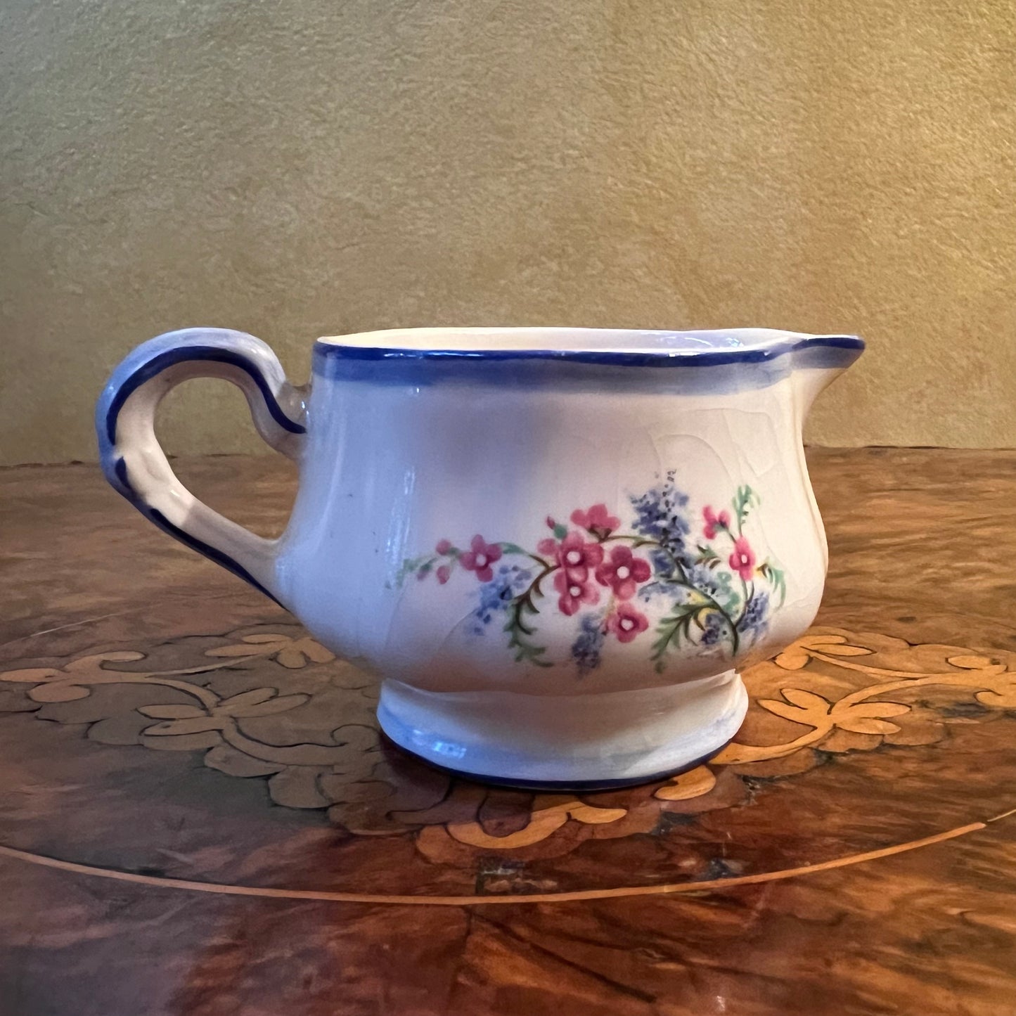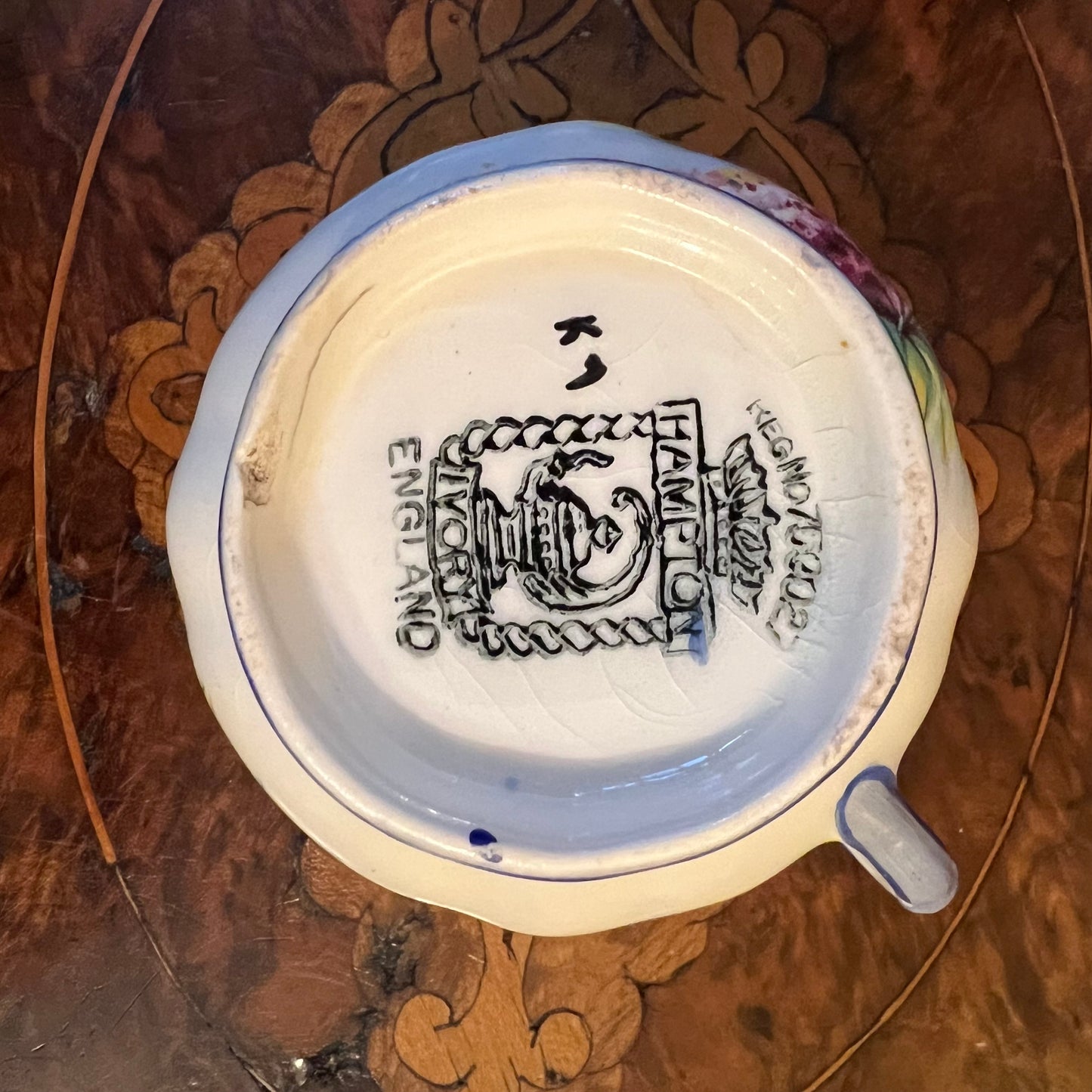 Description: Floral print with blue trimming, crazing and some ware to print, stamped Hampton Ivory
