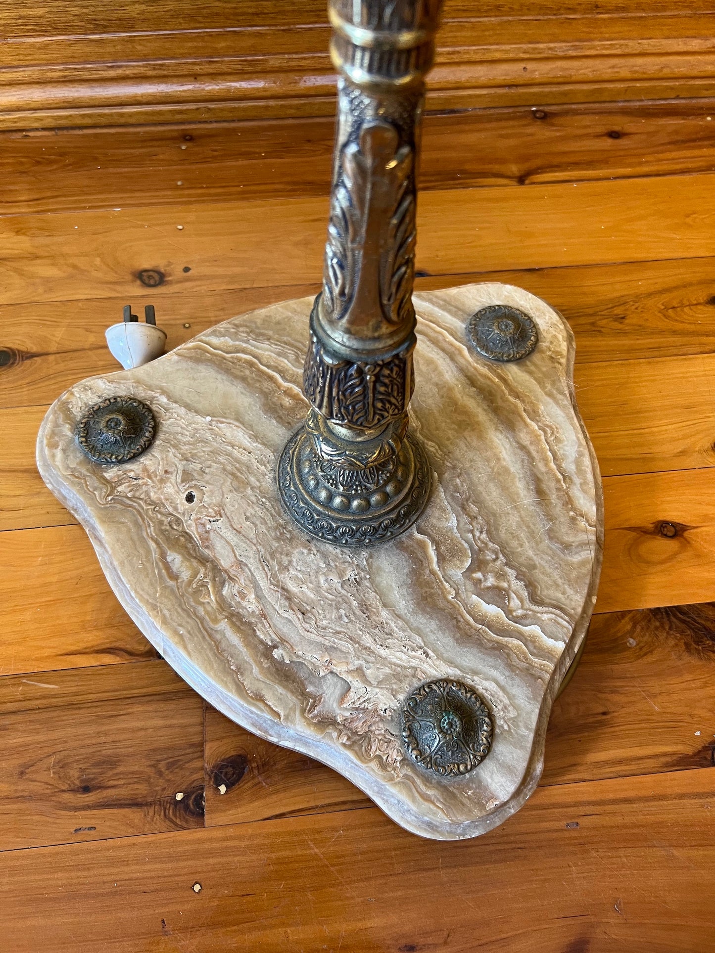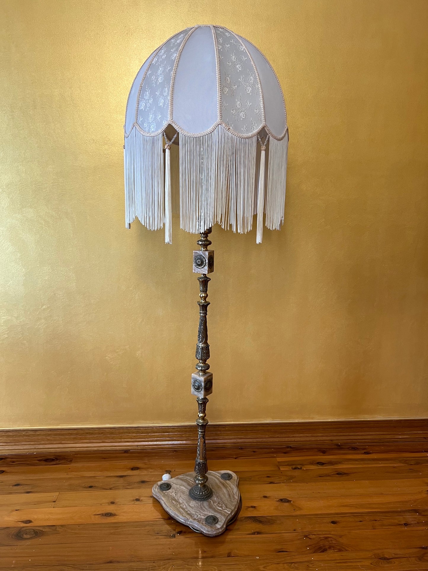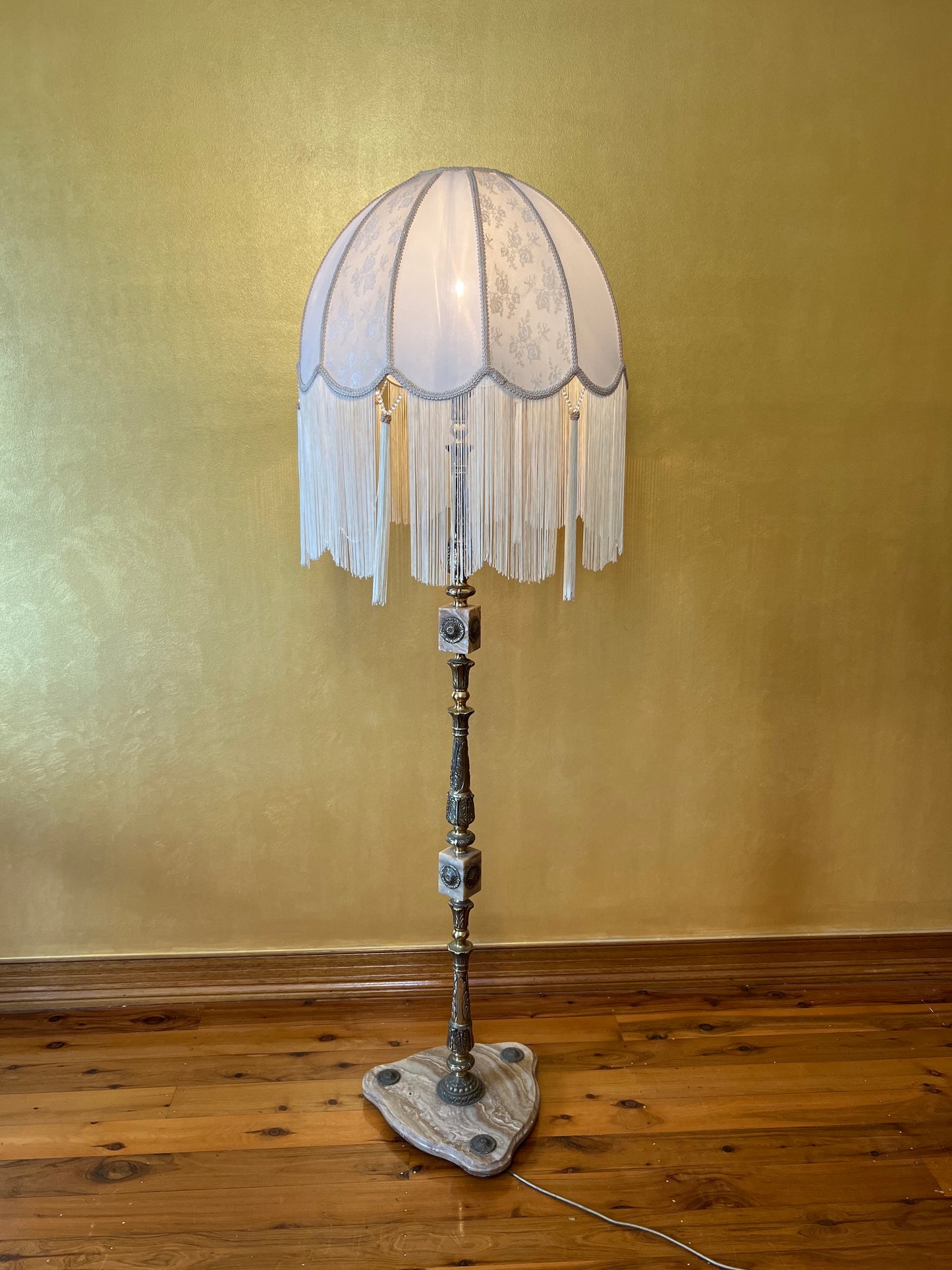 Description: Large lamp shade cream beige colour with floral lace and plain inserts alternate panels, with tassel detail all around shade, brass carved detail with marble pieces on stem, base is marble, in working order as seen in picture is working.