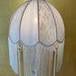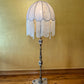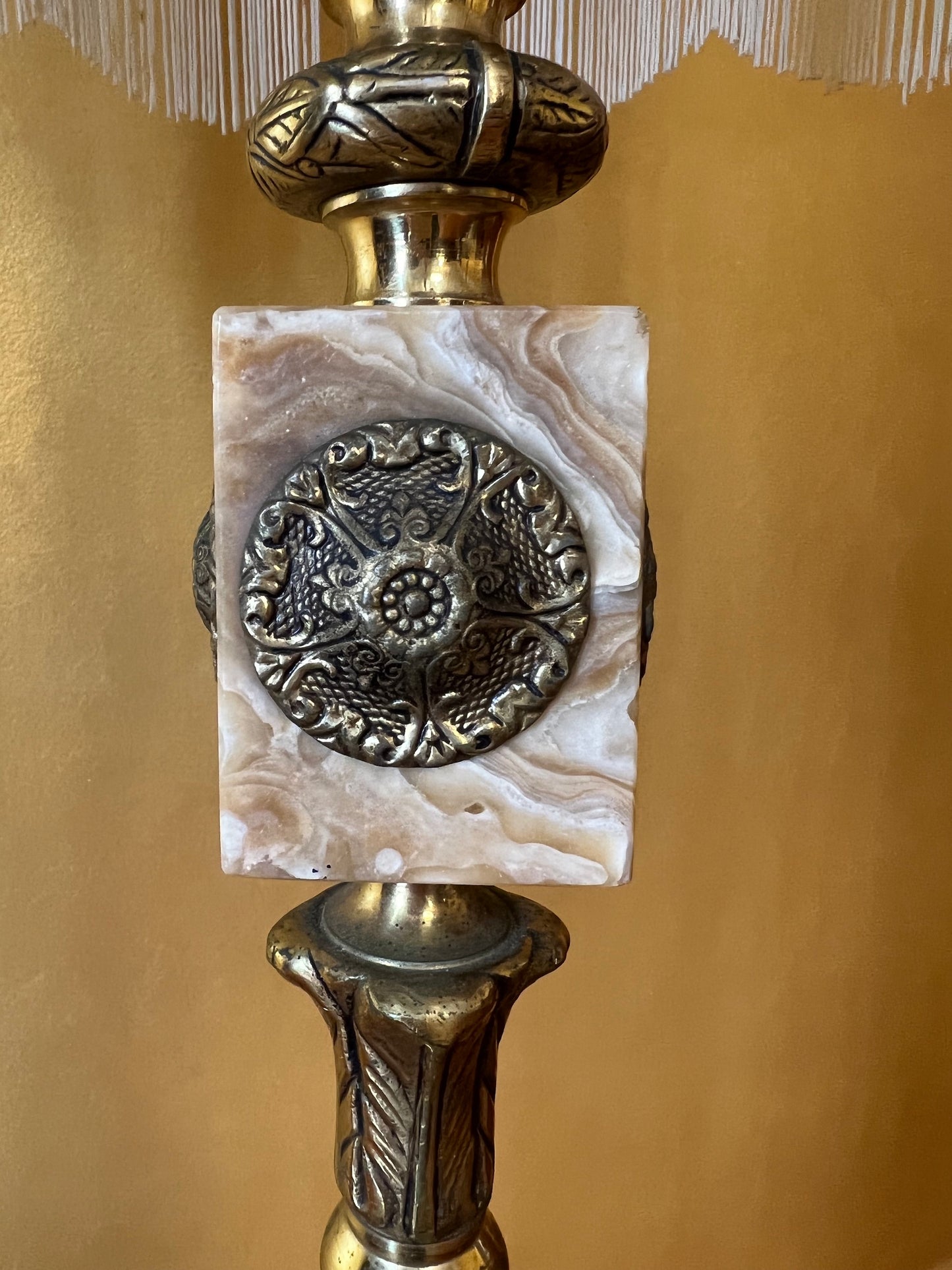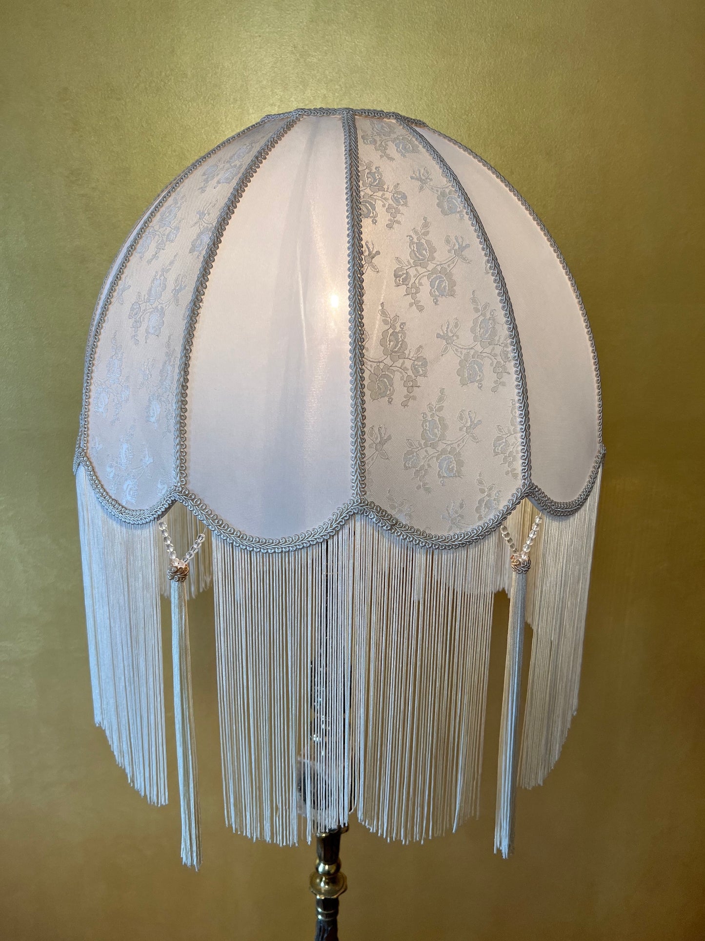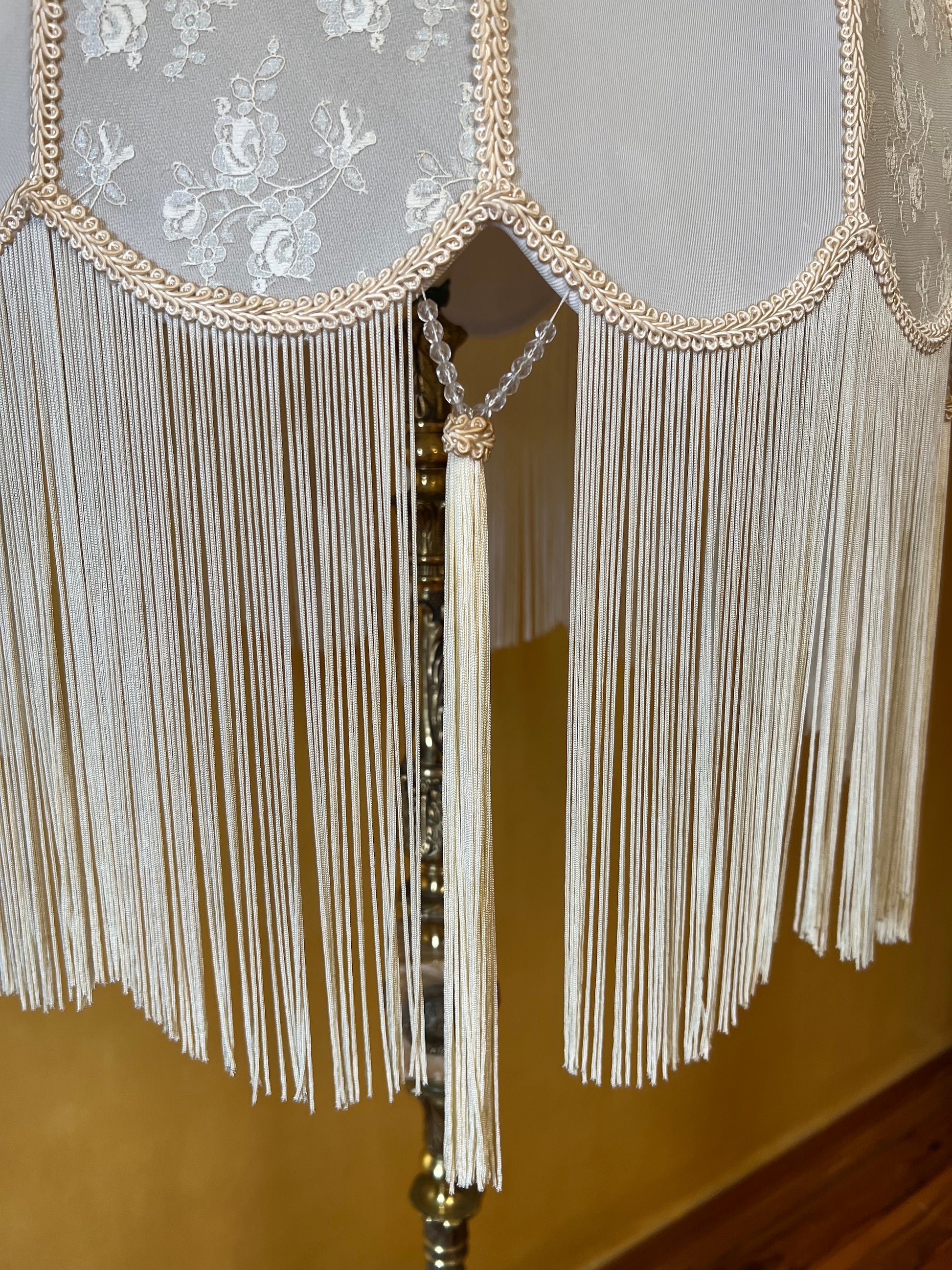 Description: Large lamp shade cream beige colour with floral lace and plain inserts alternate panels, with tassel detail all around shade, brass carved detail with marble pieces on stem, base is marble, in working order as seen in picture is working.