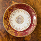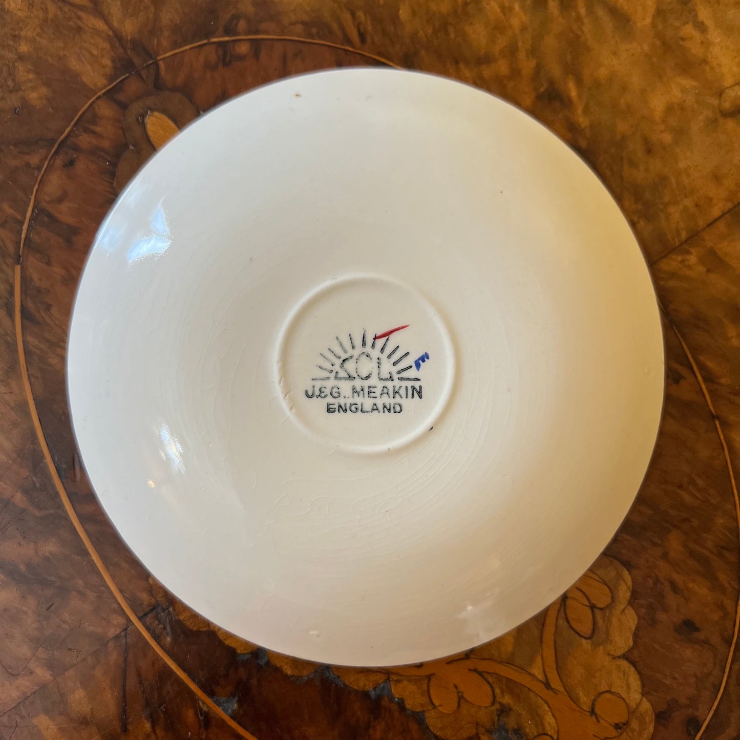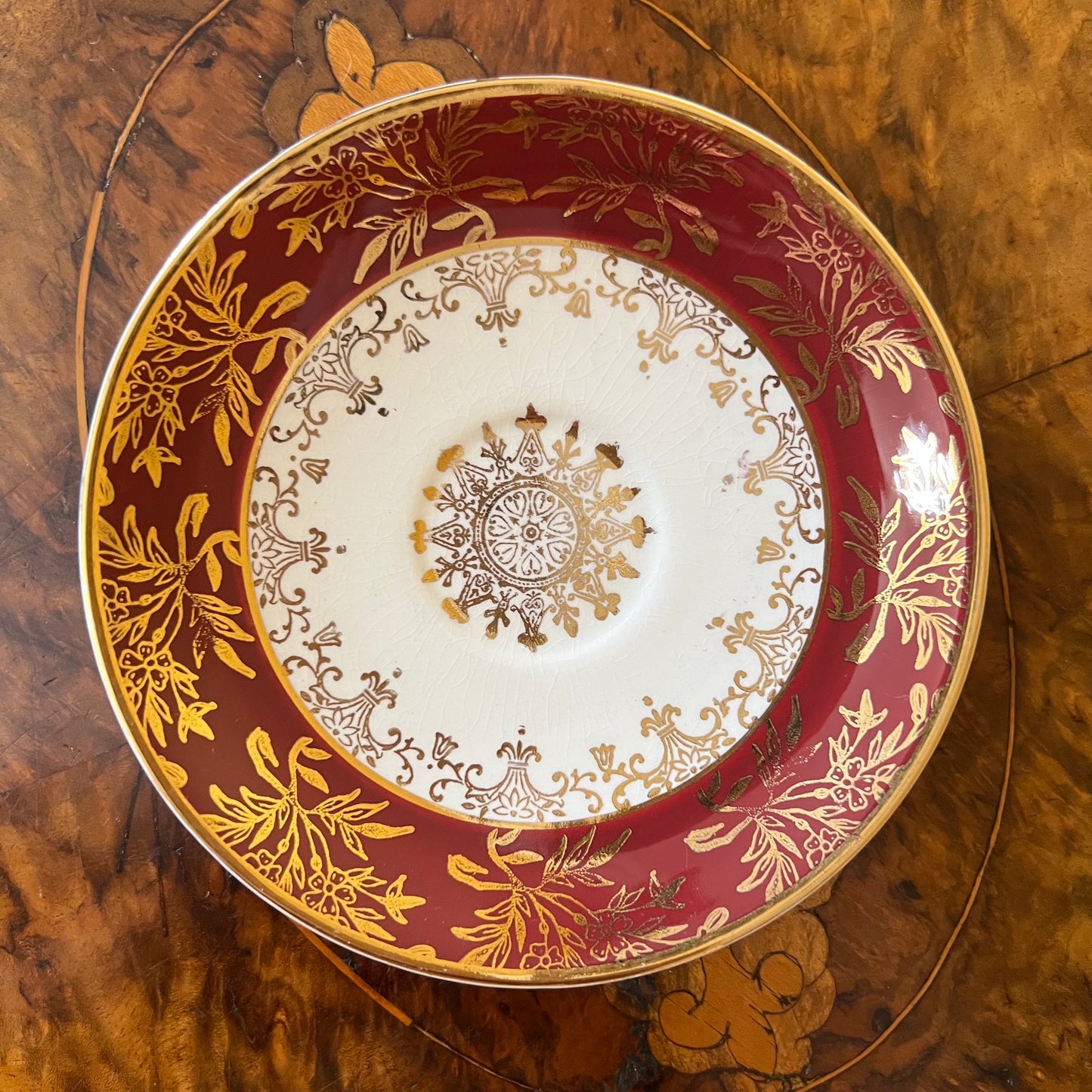 Description: Gold print with burgundy border, slight wear and scratches, crazing, stamped J & G Meakin