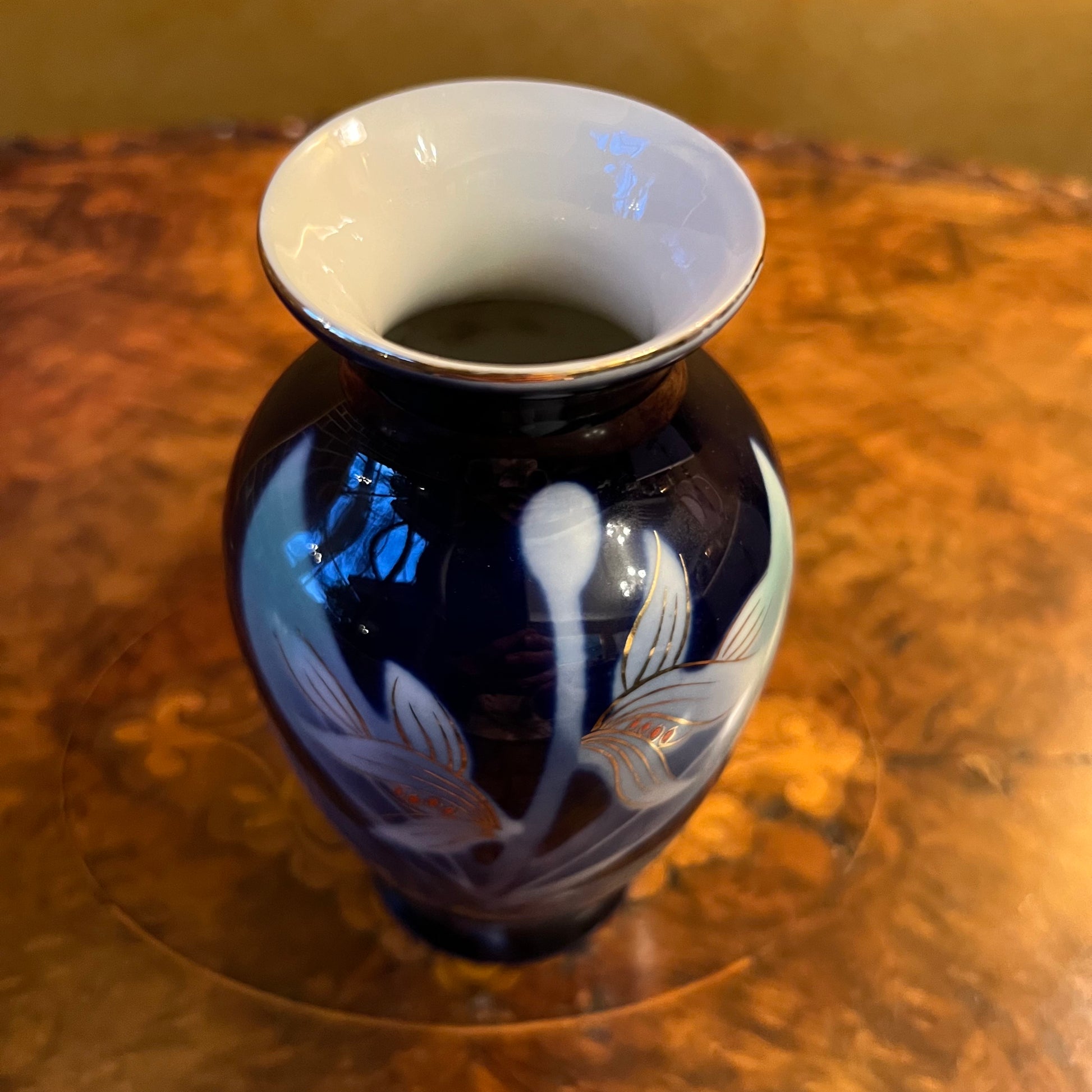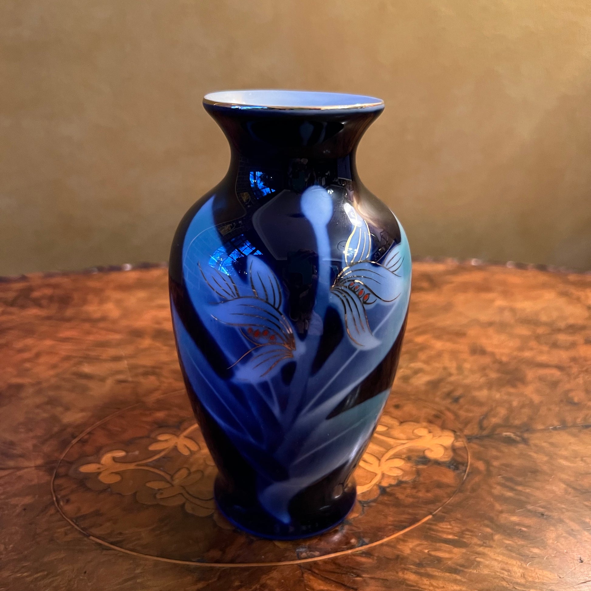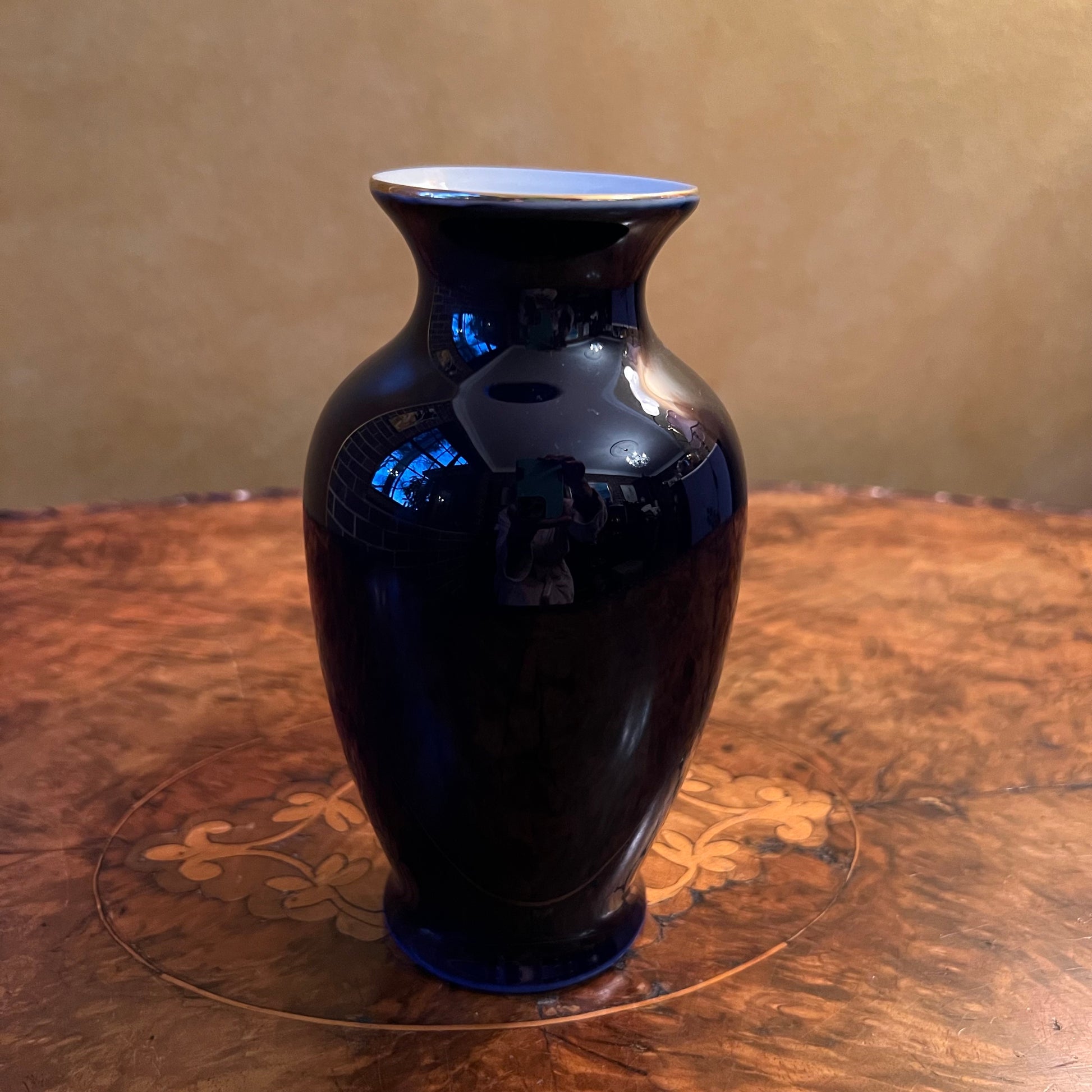 Description: Cobalt blue back ground with blue, green floral print, gold trim around top trim, trim has ware and fading, stamped
