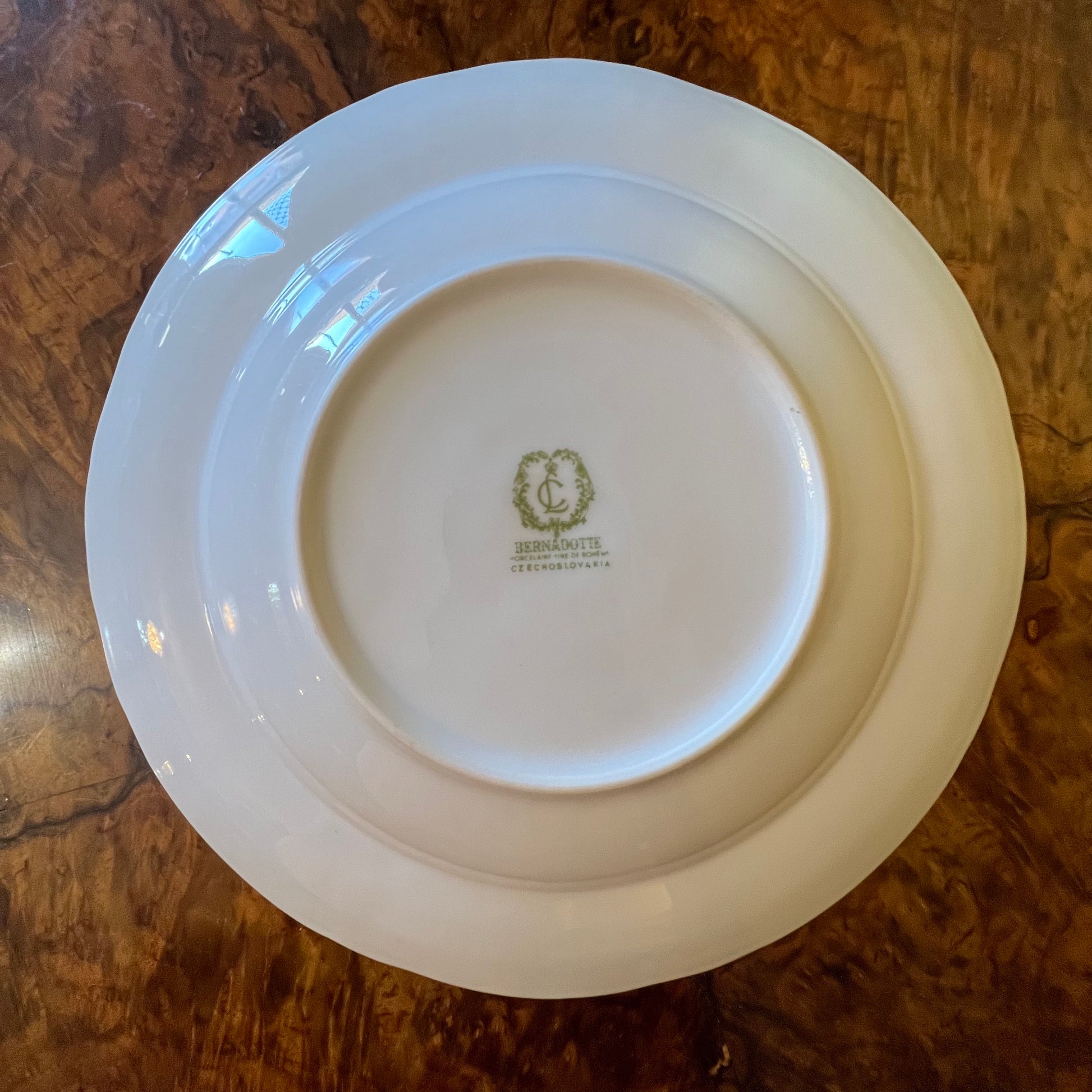Description: Floral print with gold trimming, ware and fading to gold trim, scratches to plate from use, stamped LC Bernadotte 11 available