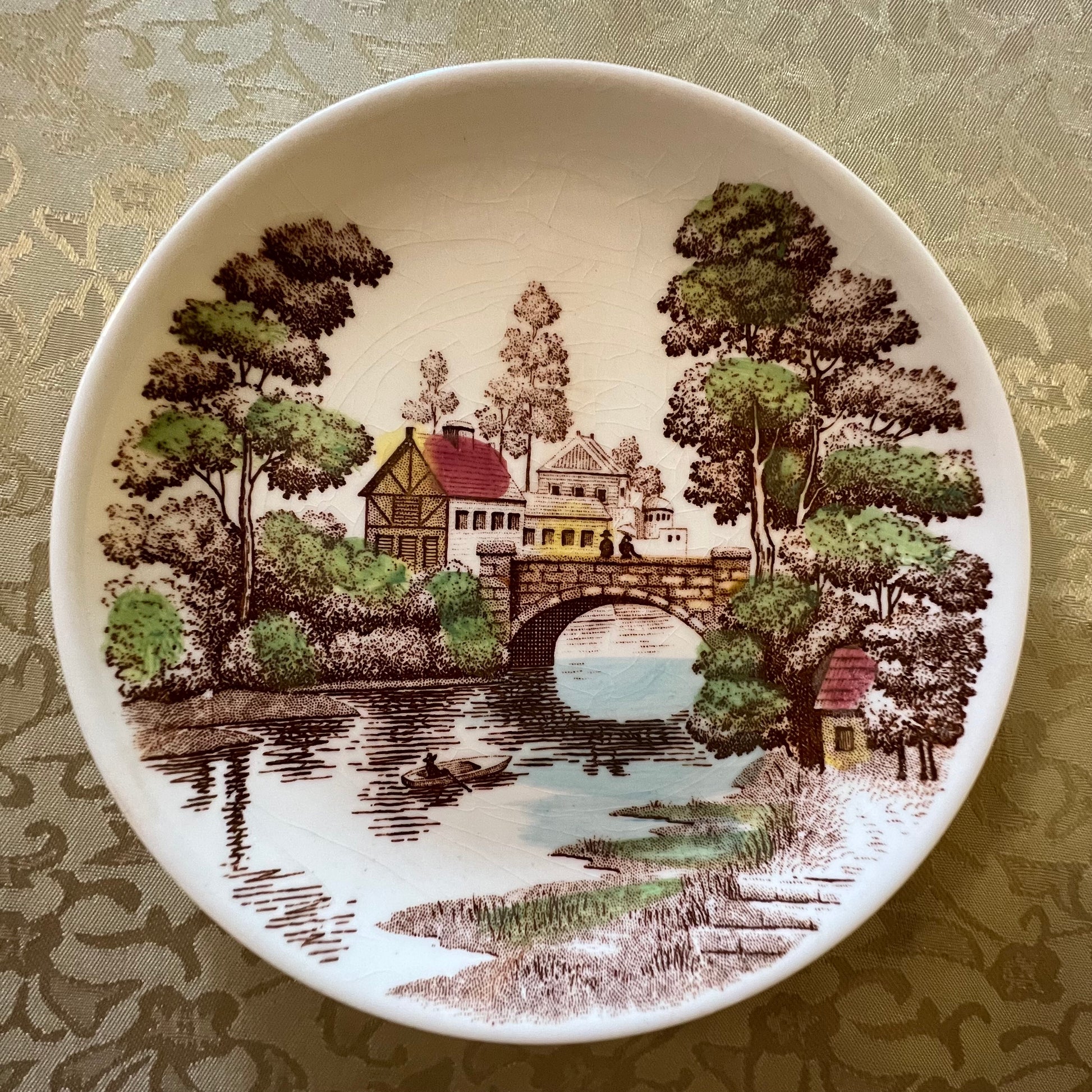 Description: River and town print stamped Summer Holiday Nasco, crazing to plate.
