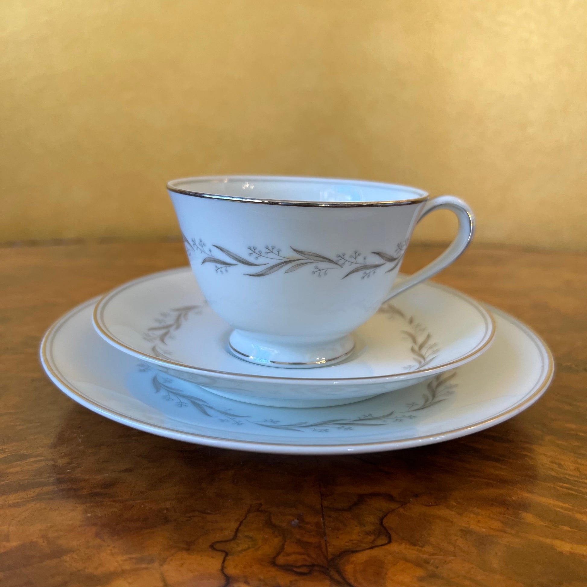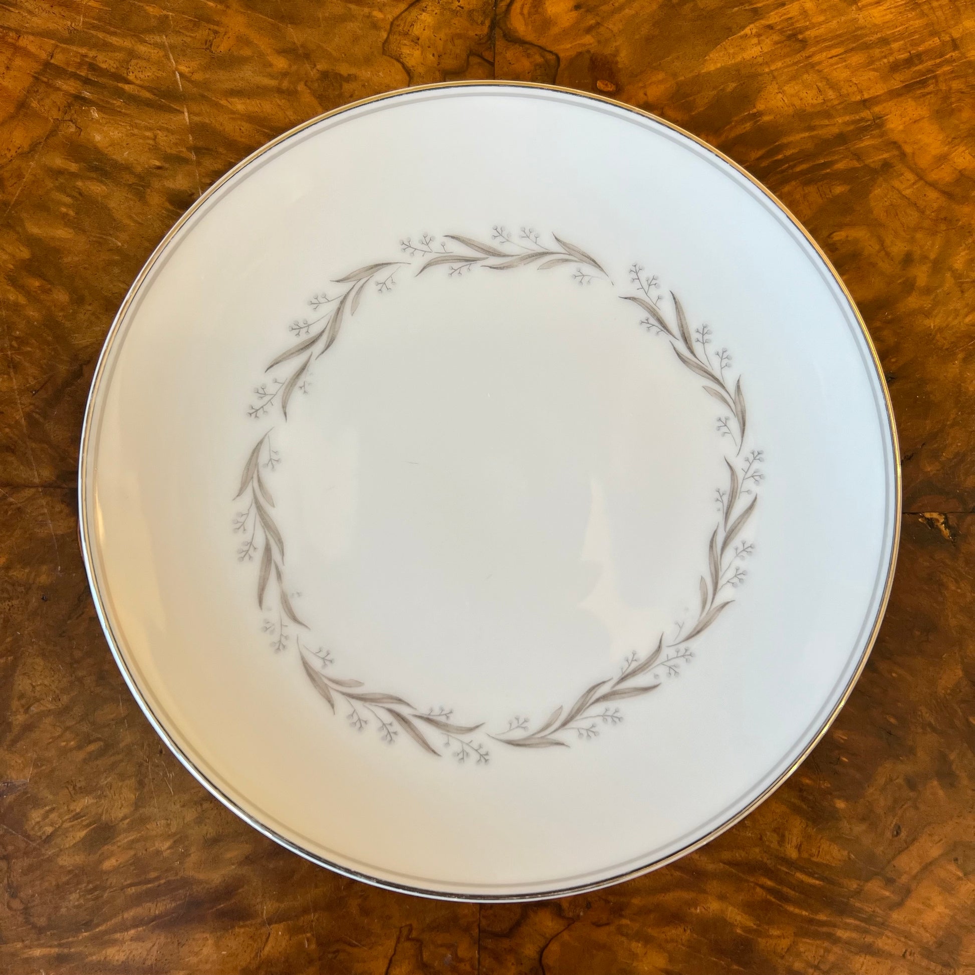 Description: Blue berries grey leaves, very sight ware to print, stamped Noritake Almont