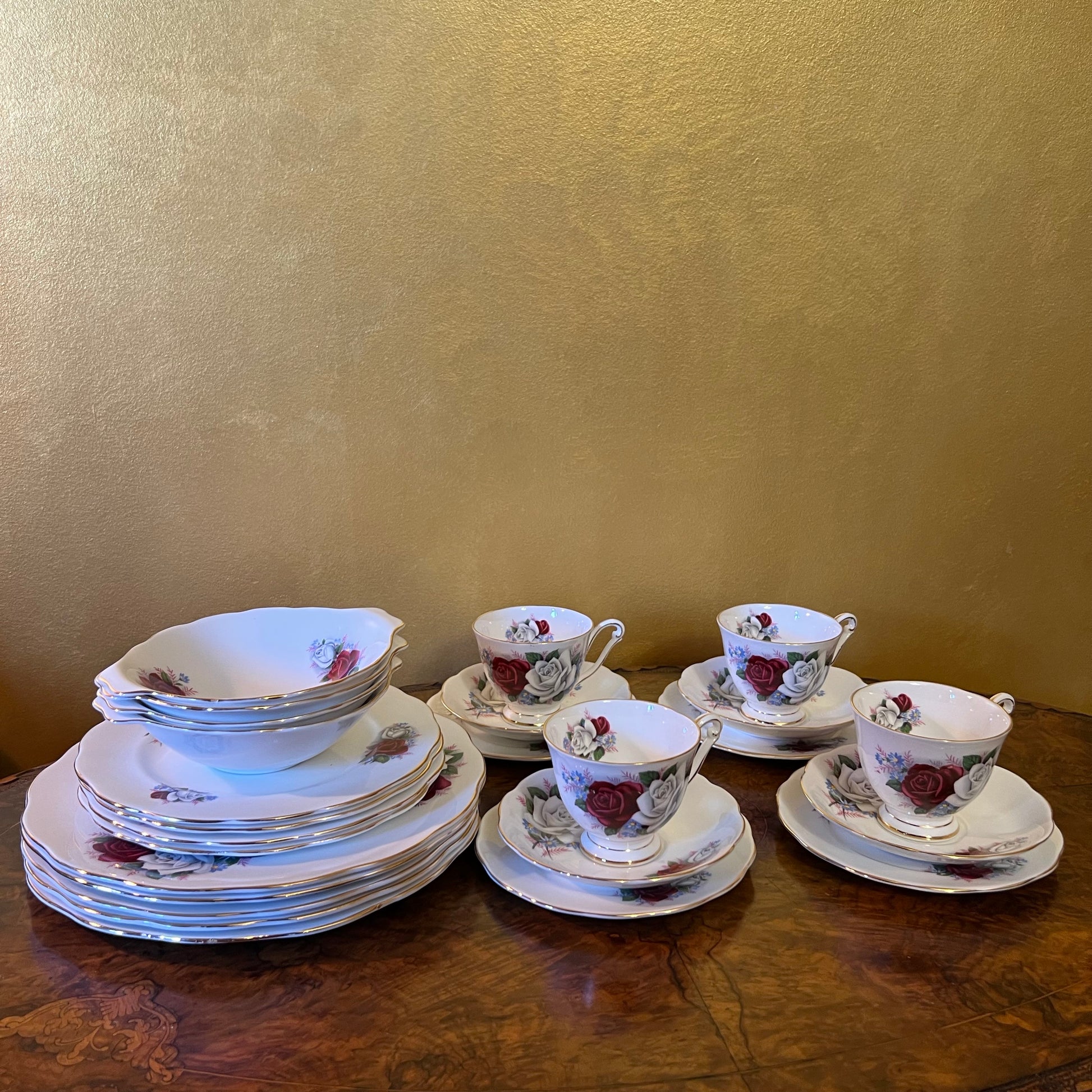 Description: Red and white rose print with gold trimming, slight ware to plate and gold trim, set comes with 4 x dinner plates, 4 x entree plates, 4 x bowls, 4 x side plates, 4 x saucers, 4 x tea cups