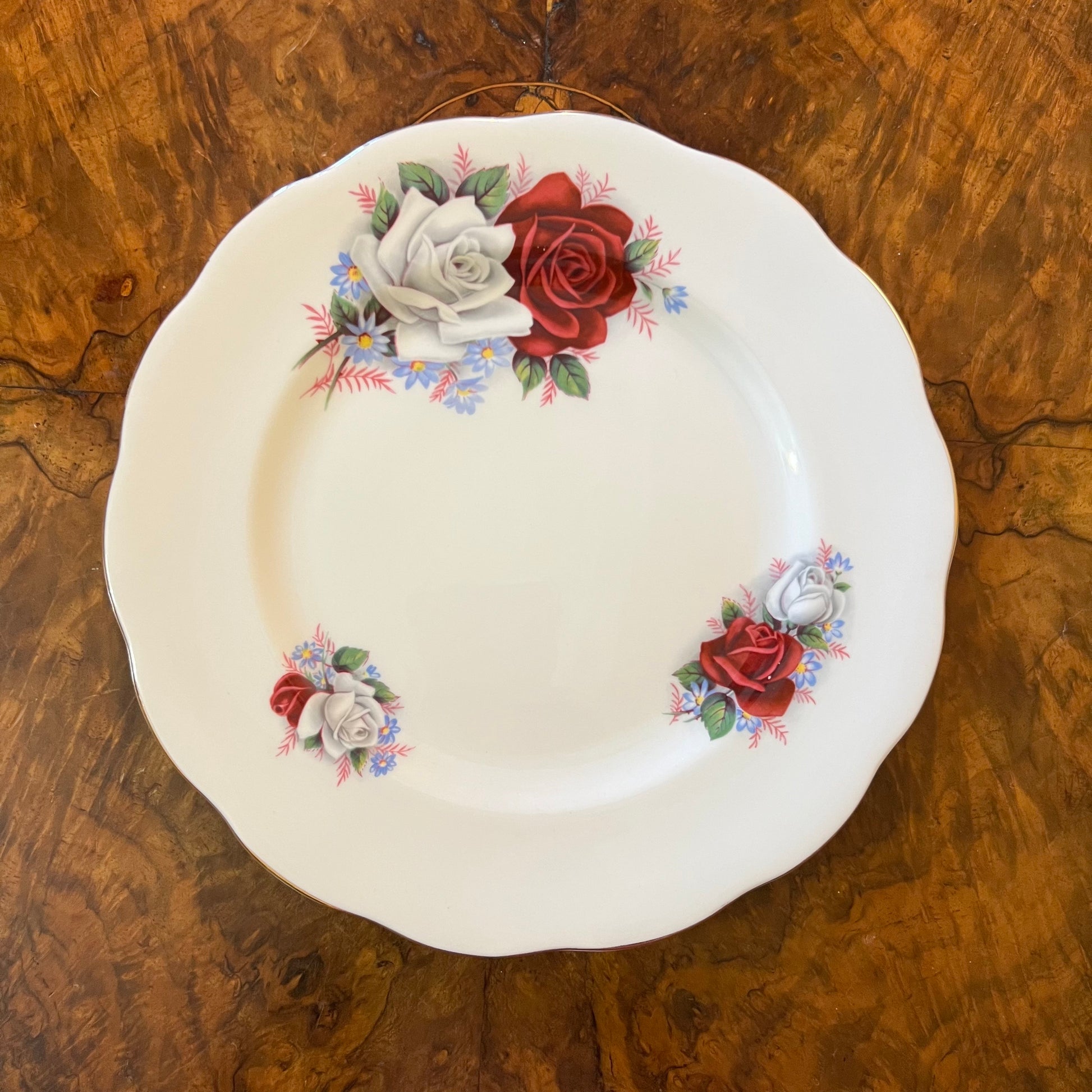 Description: Red and white rose print with gold trimming, slight ware to item.