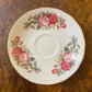 Description: Pink an red roses print with gold trimming, some wear to gold trim, stamped Queen Anne