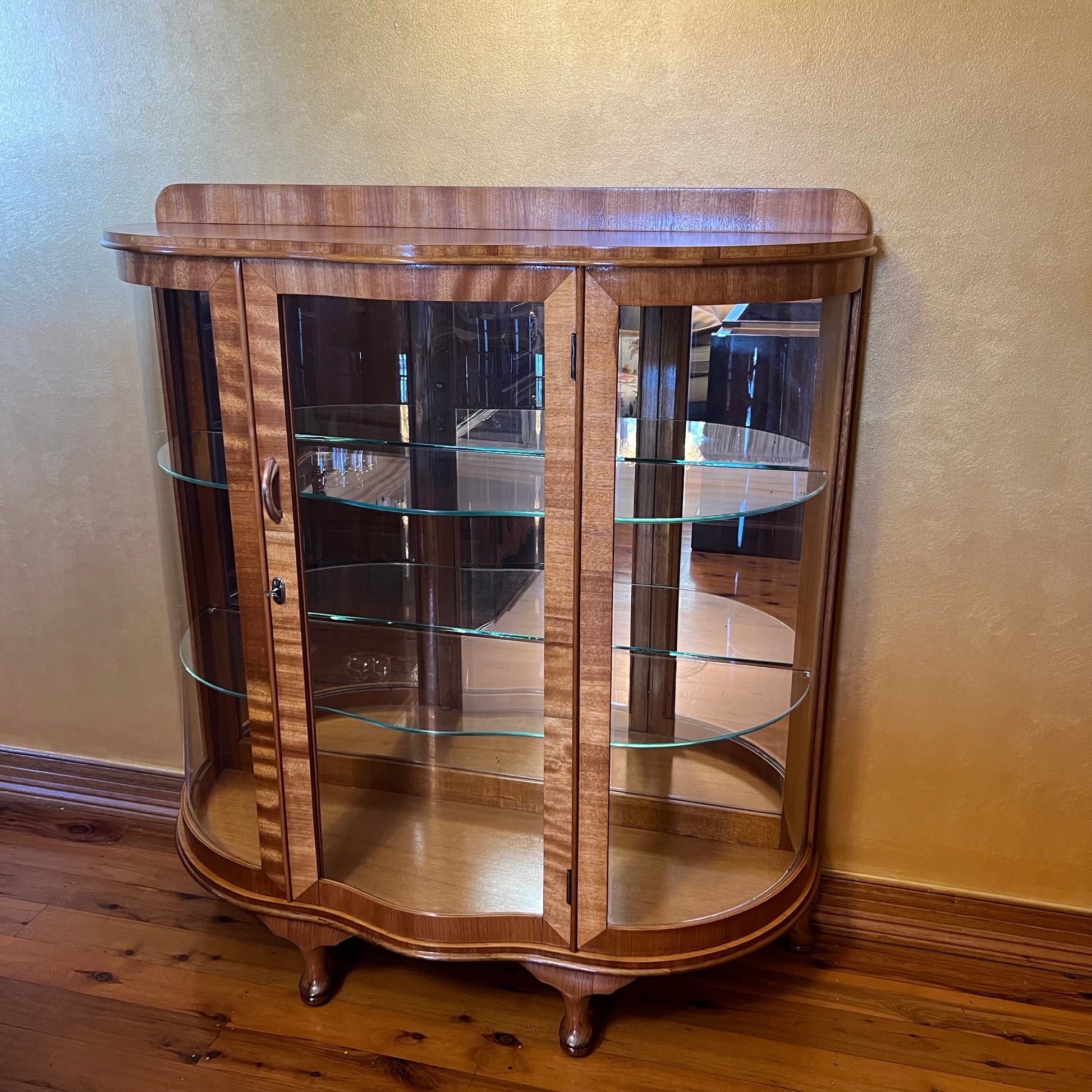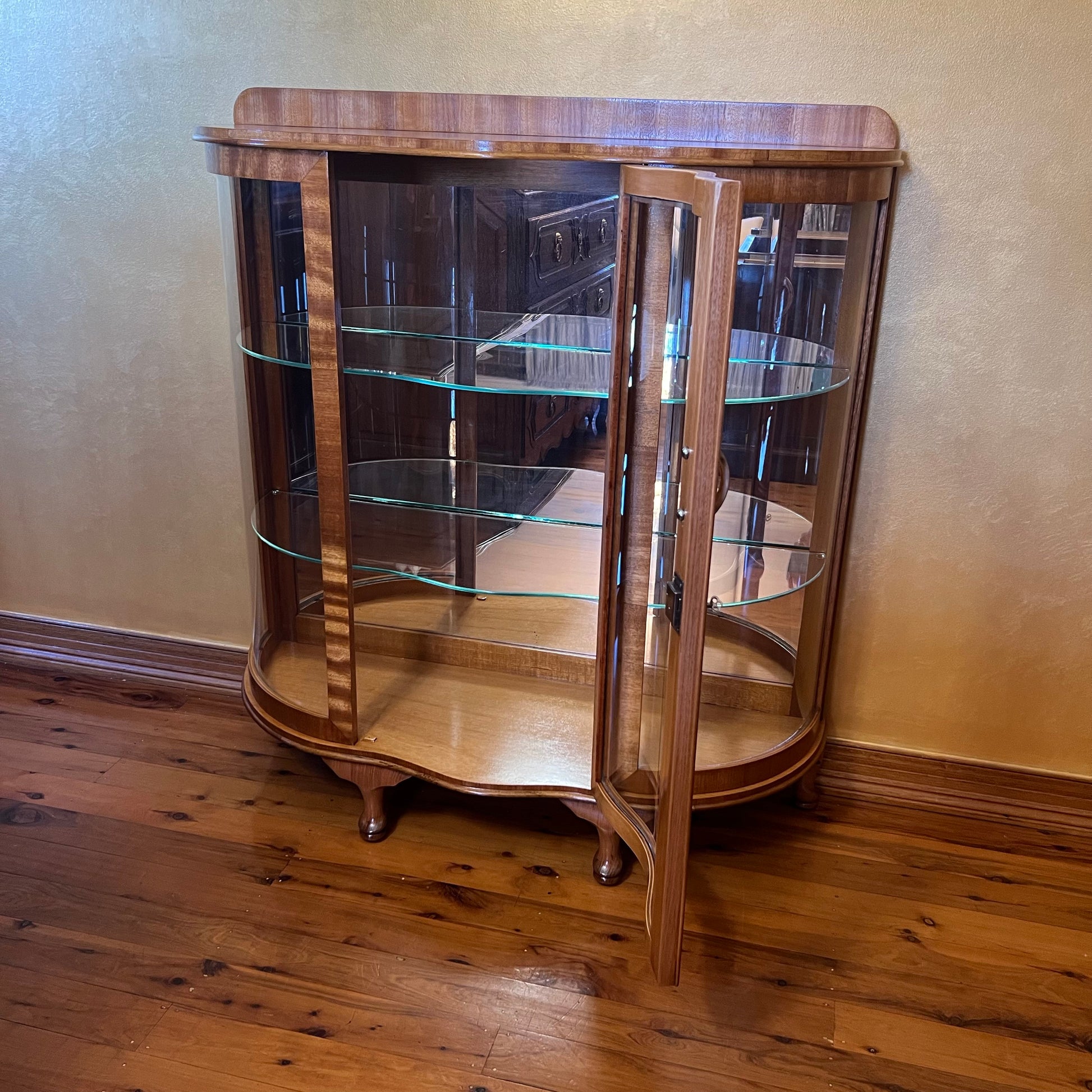 Description: has three shelves two of the shelves are glass and can come out of cabinet for cleaning or moving, comes with key, cabinet has been fully restored and French Polished.