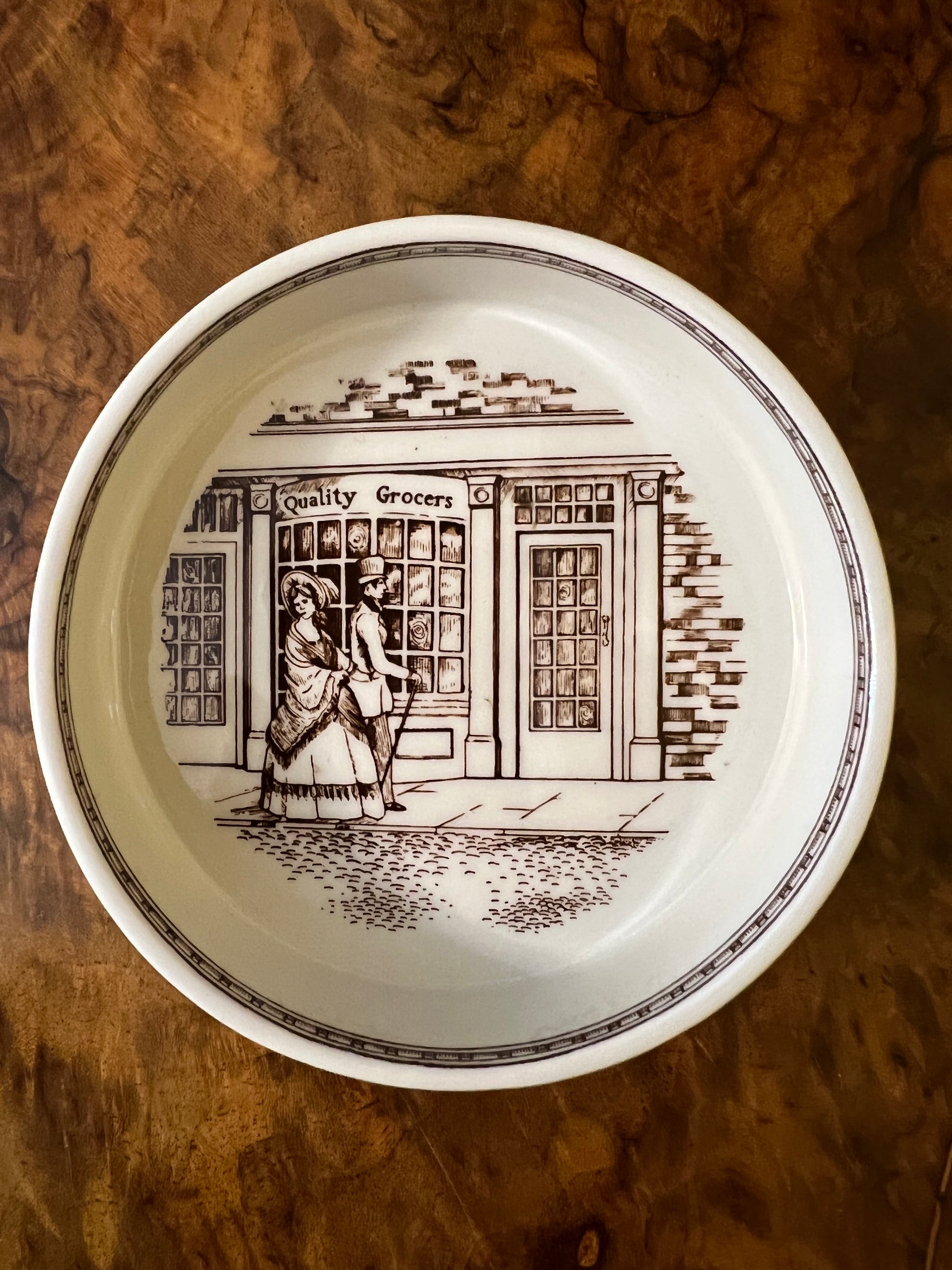 Description: Print of shops and man and women walking, brown prints, stamped Real English Ironstone Adams