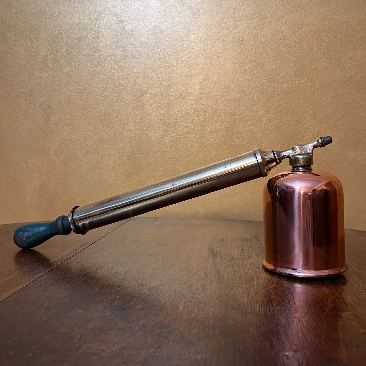 Description: Copper bottle, brass pump and spray, wooden handle, marks and wear due to use and age, has some dents on bottle, stamped Rega