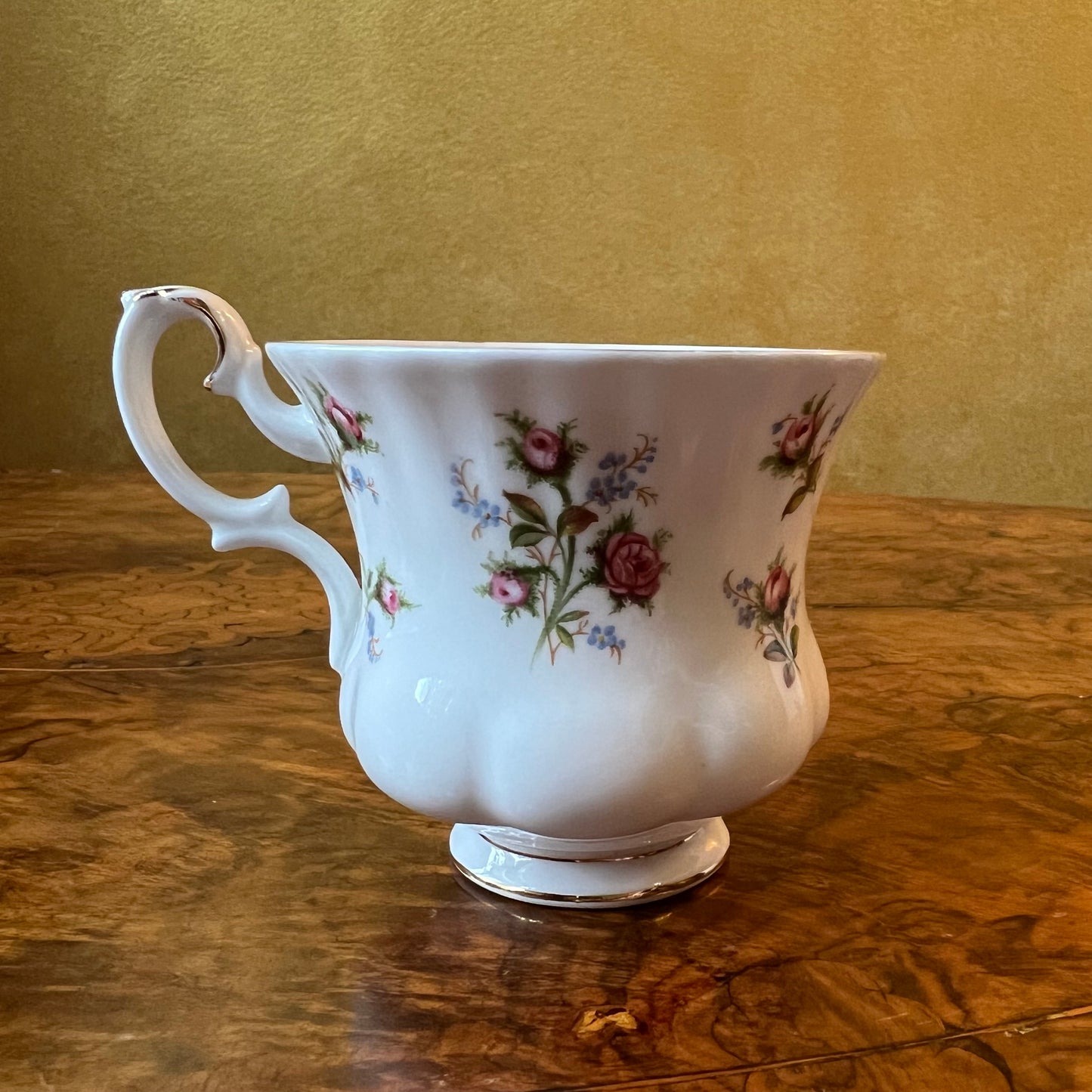 Description: Small tea cup and saucer, pink rose print with gold trimming, some fading to gold trimming, stamped Royal Albert Winsome