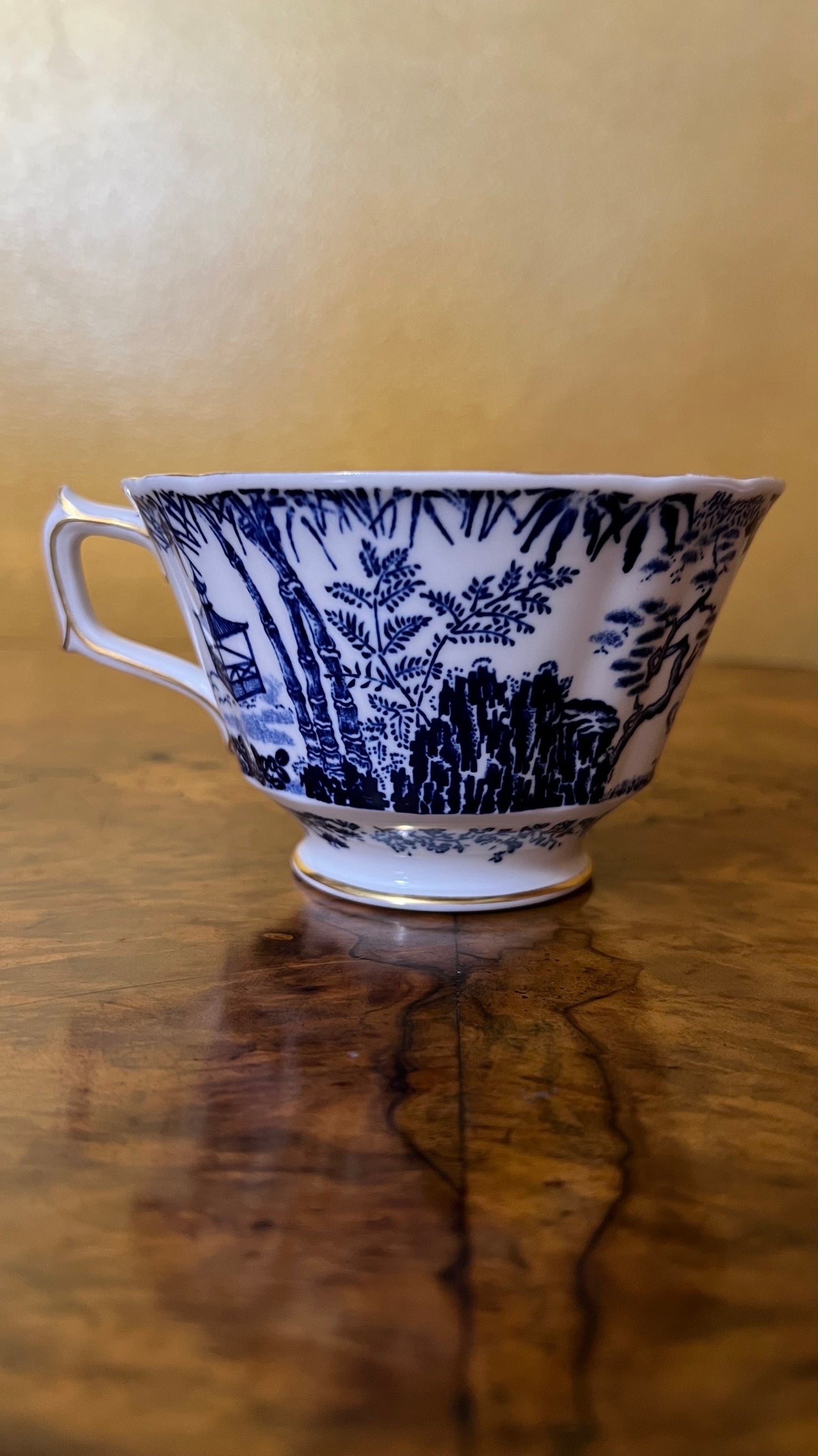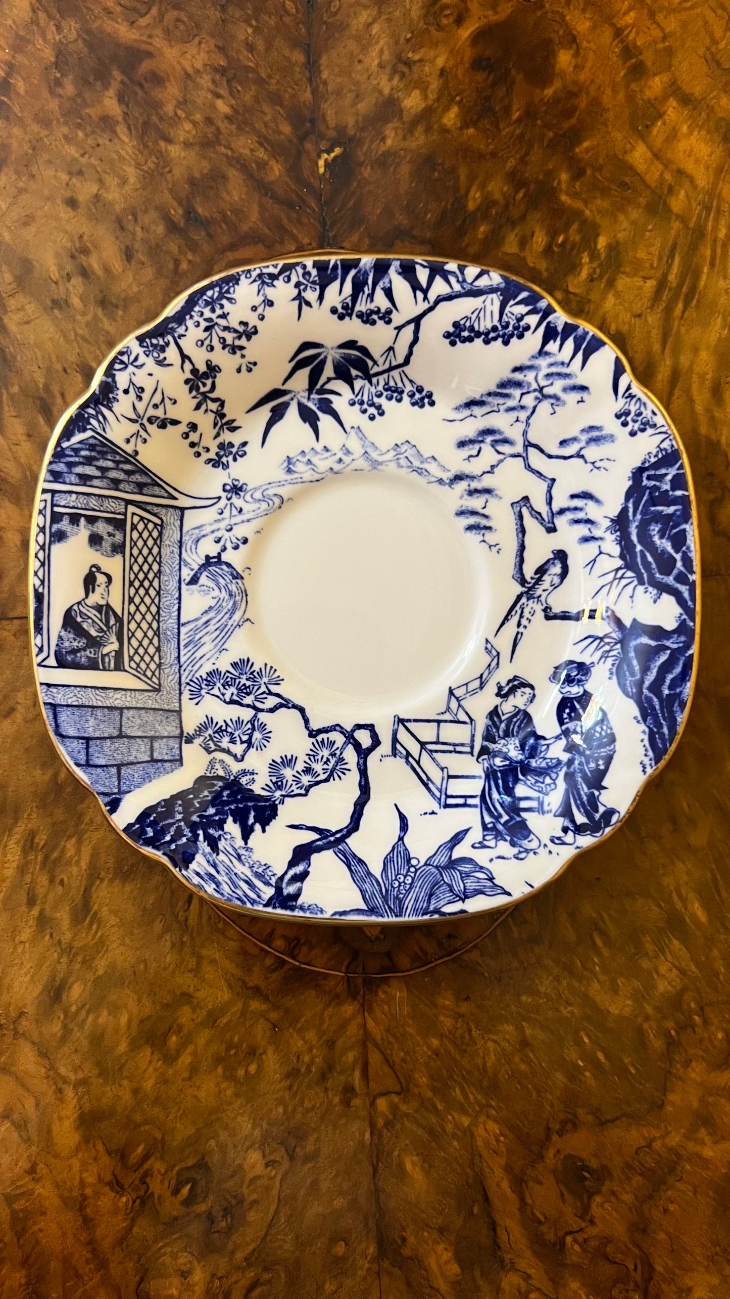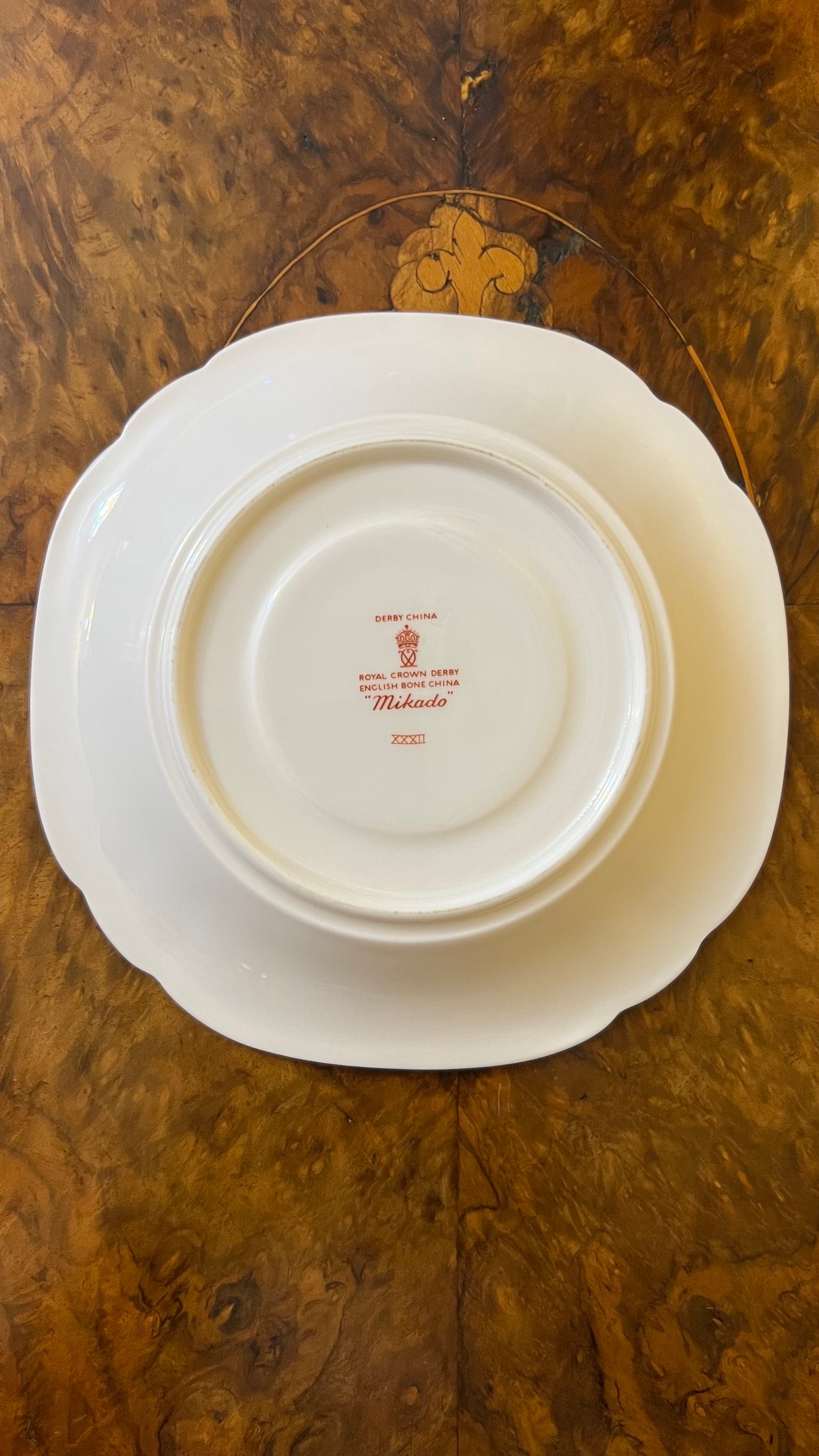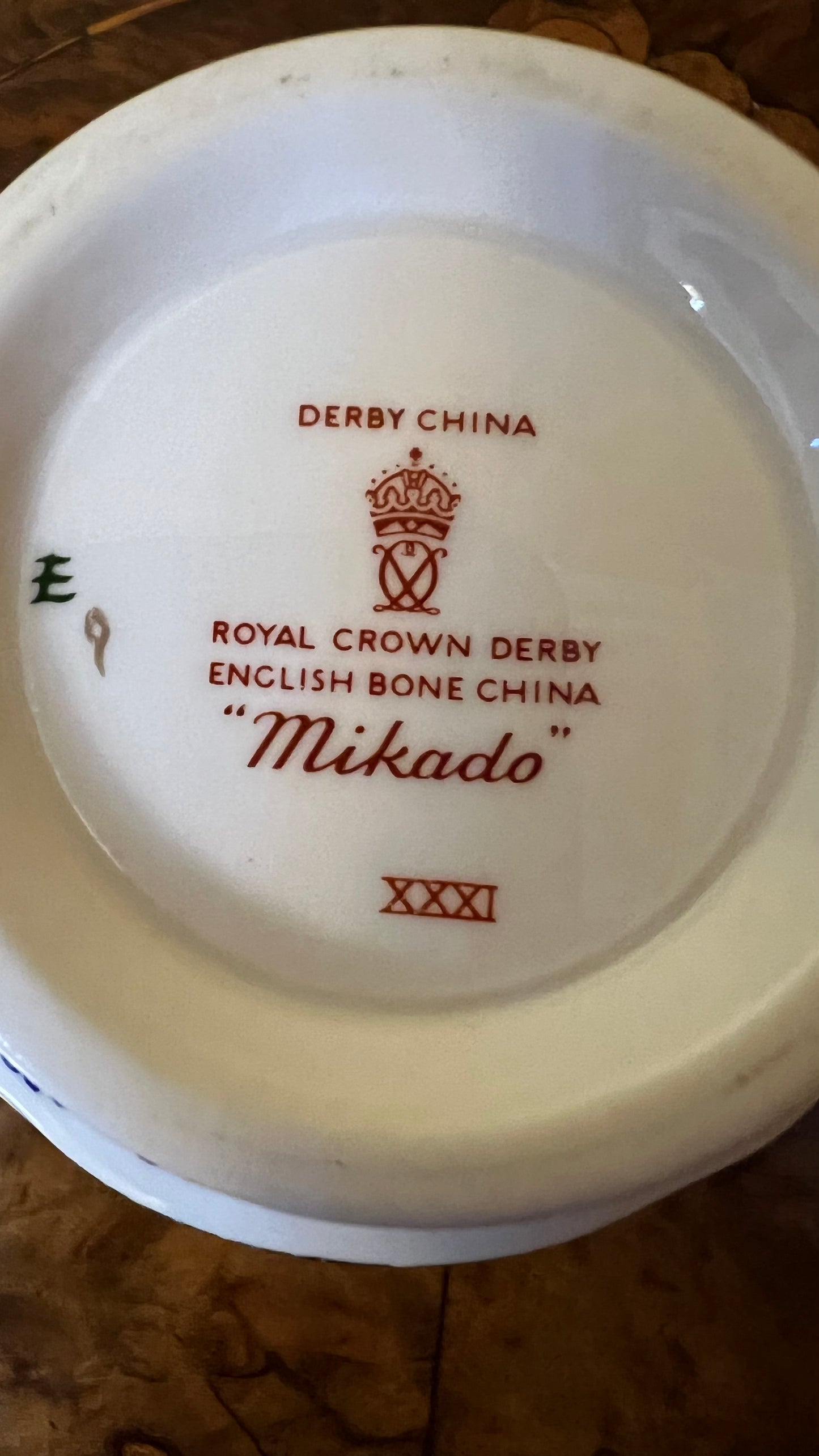Description: Blue and white oriental print with gold trimming, some scratches in plate from use, some fading to gold rim of cup. Stamped Royal Crown Derby Mikado.