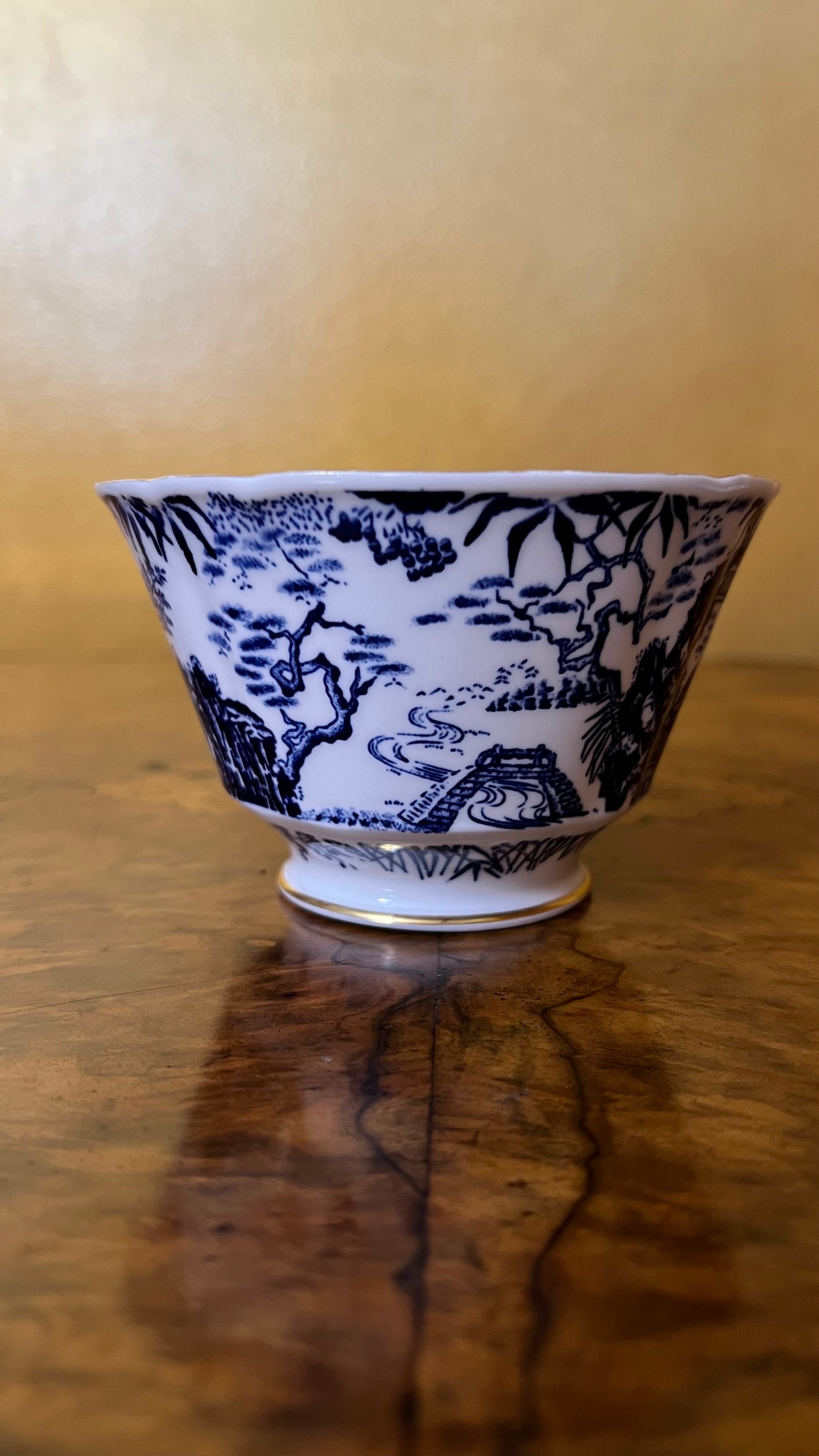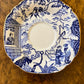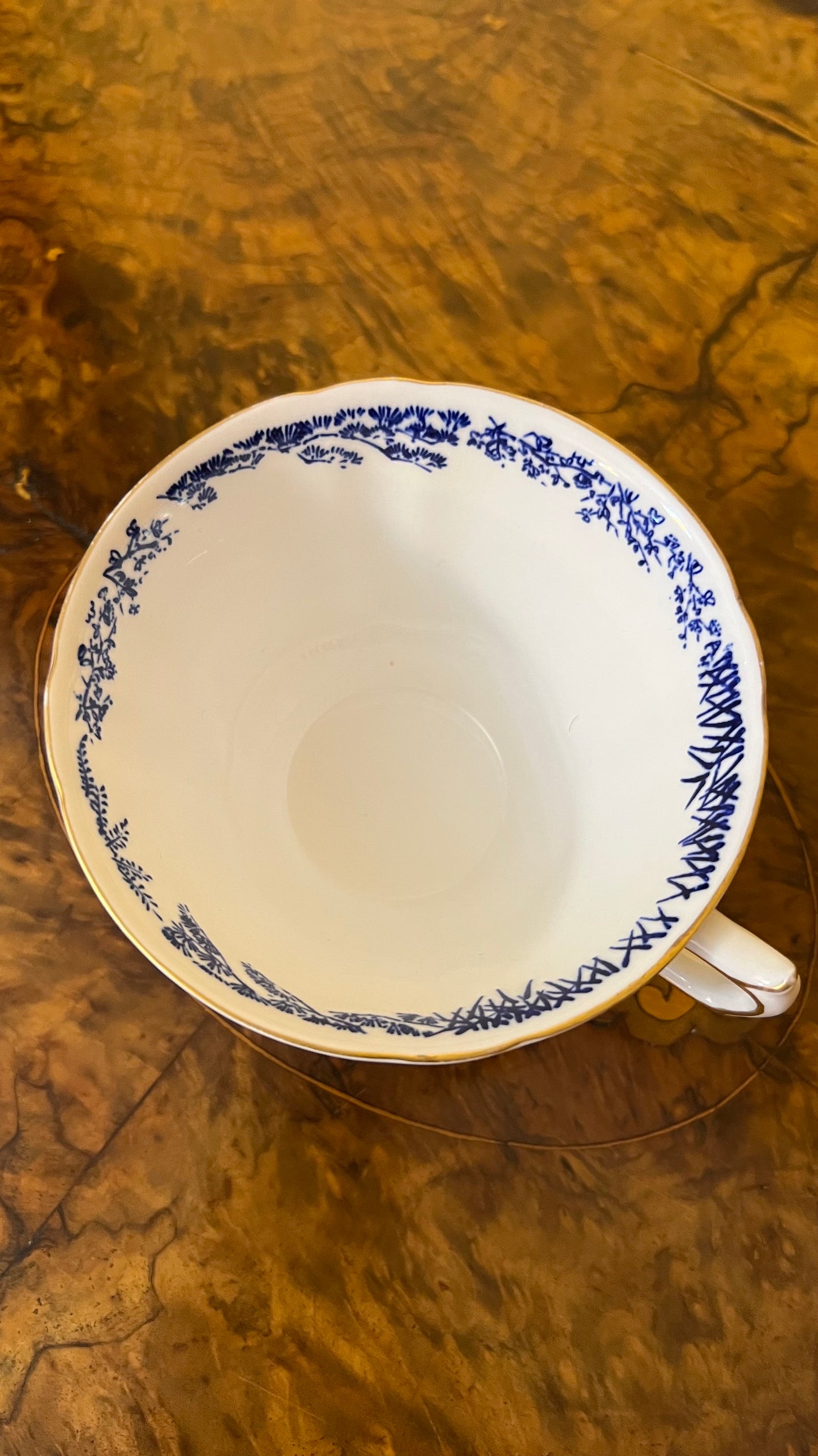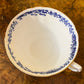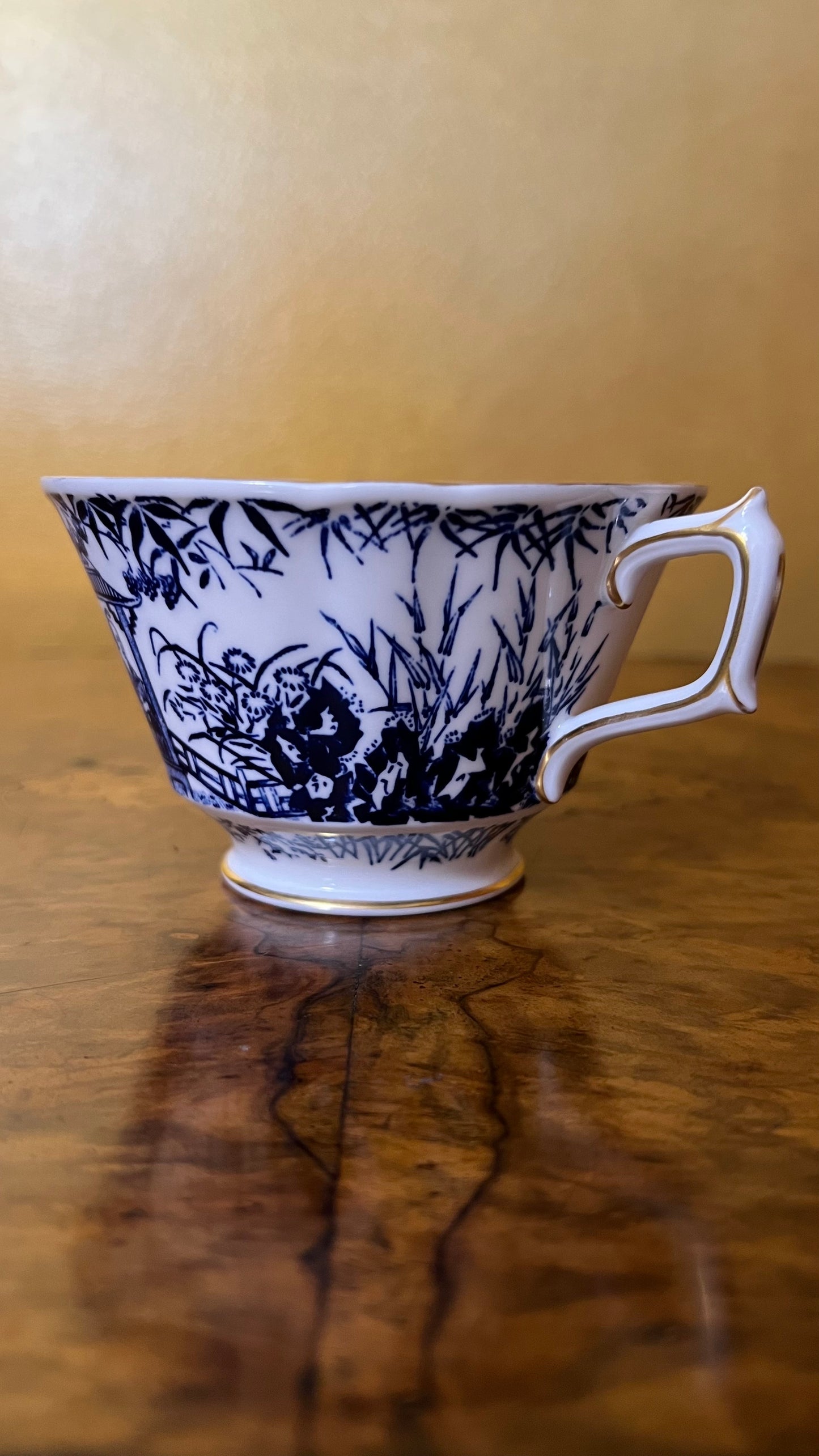 Description: Blue and white oriental print with gold trimming, some scratches in plate from use, some fading to gold rim of cup. Stamped Royal Crown Derby Mikado.