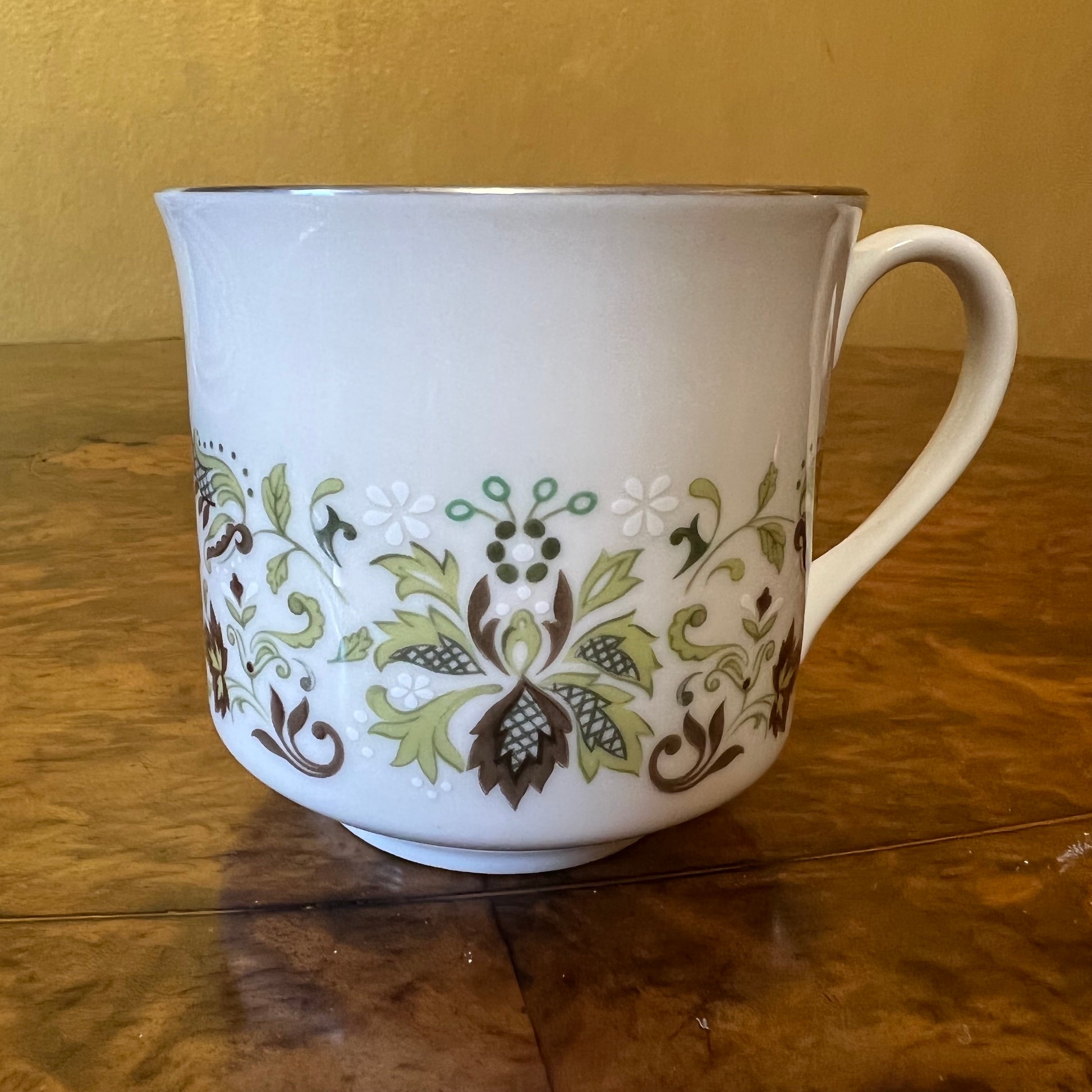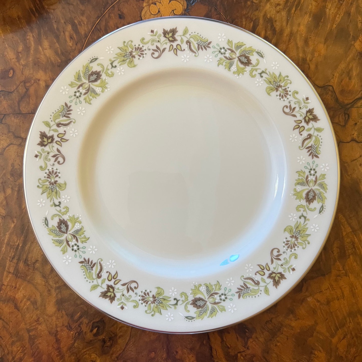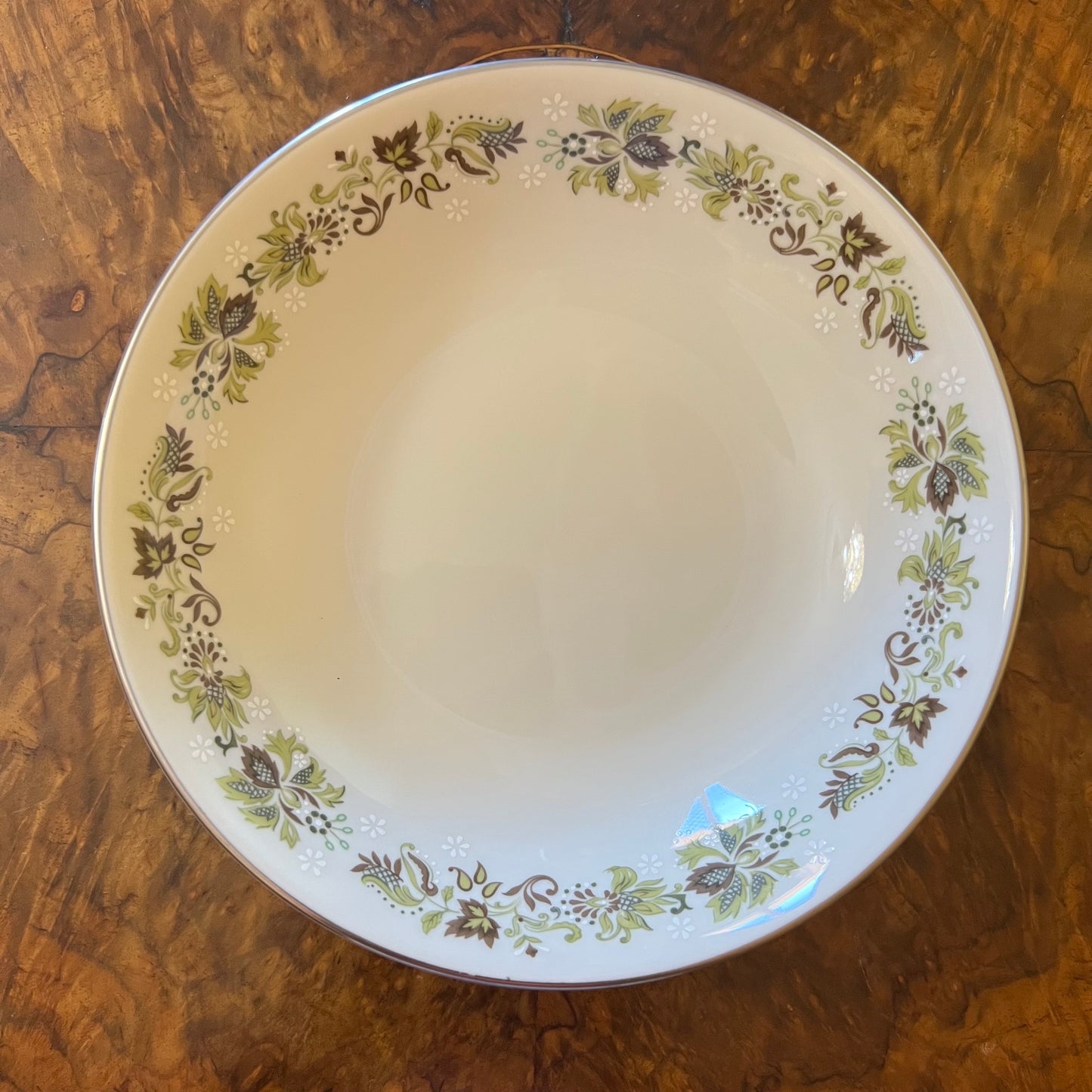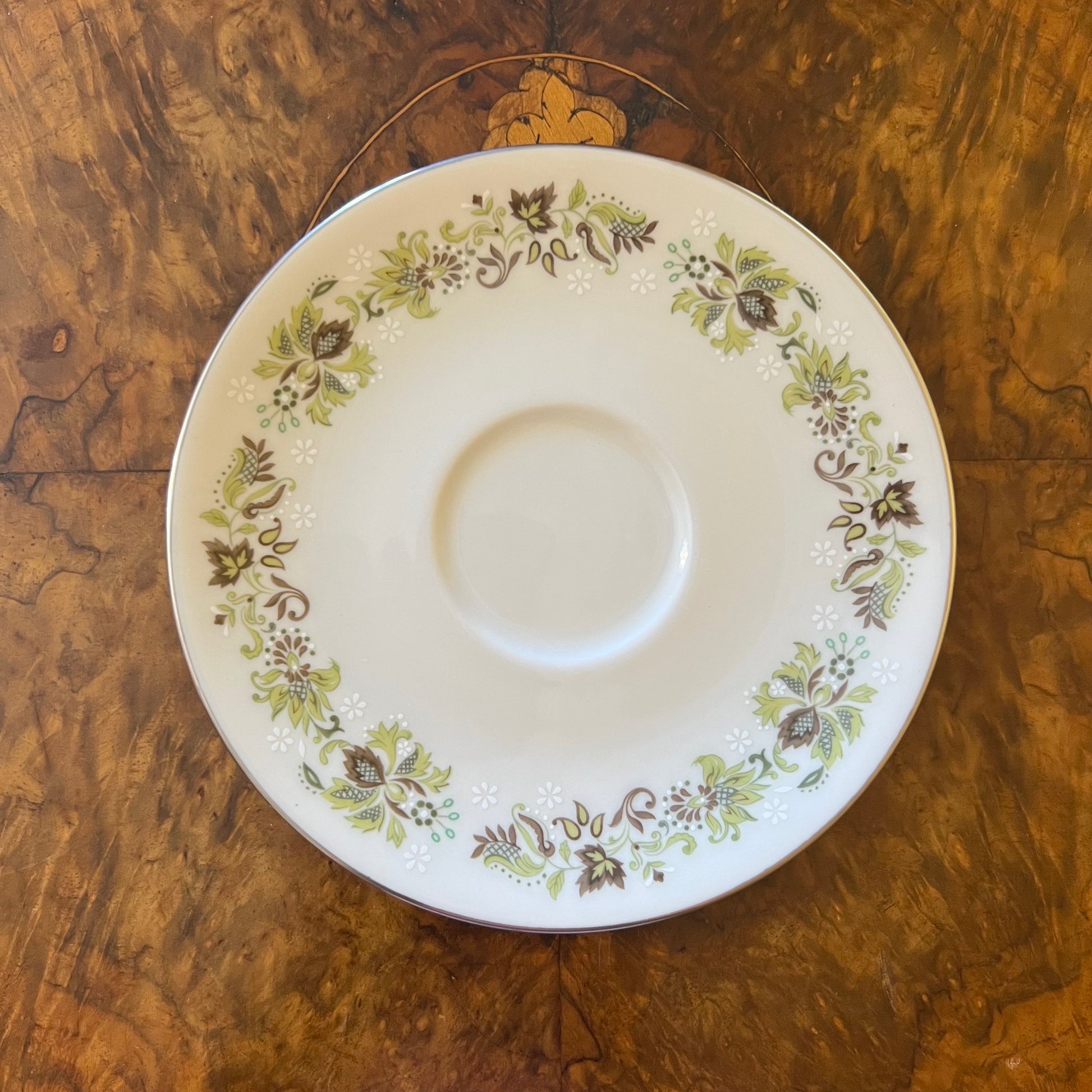 Description: Green leaf print with silver trimming, stamped Royal Doulton Vanity Fair, has very slight wear.