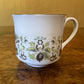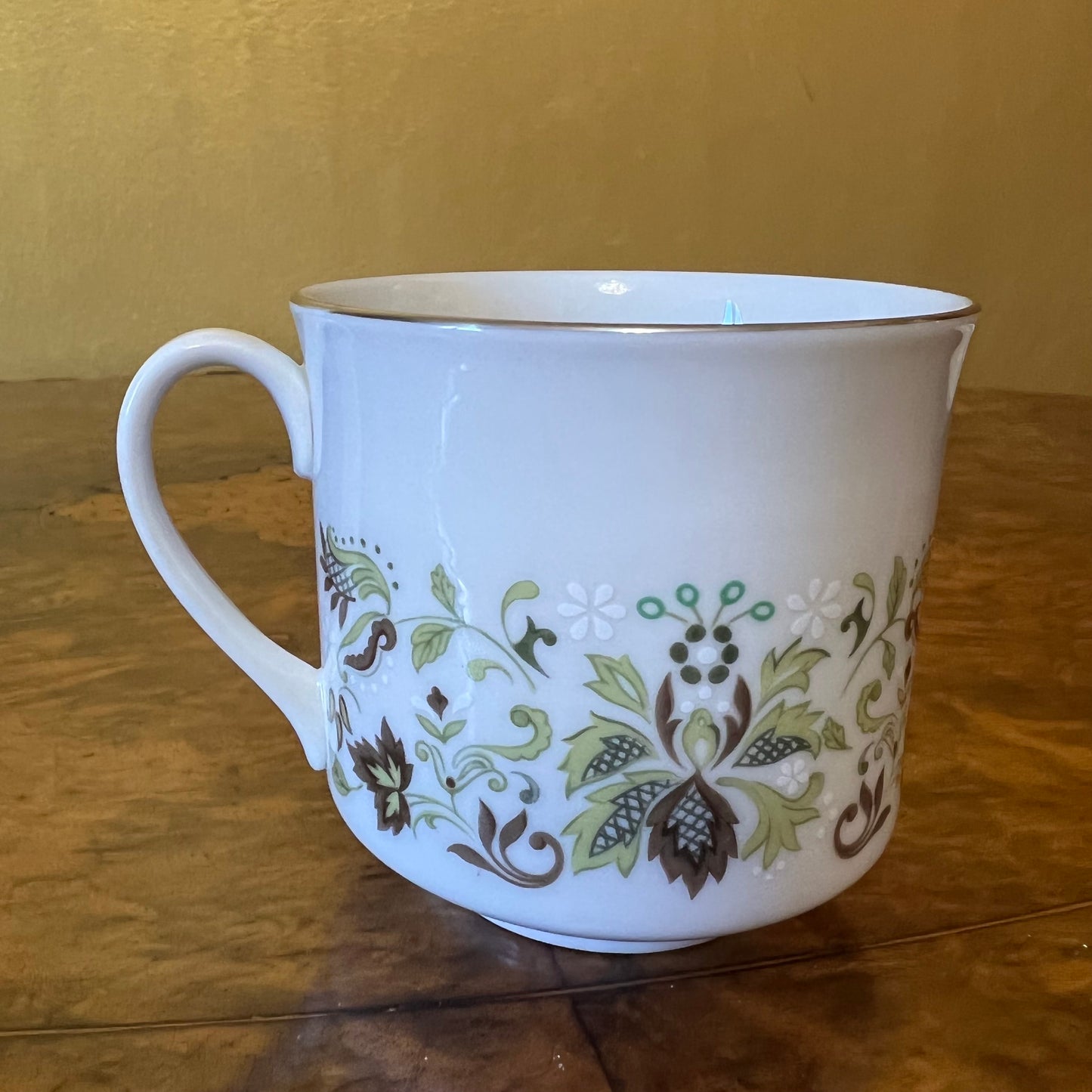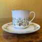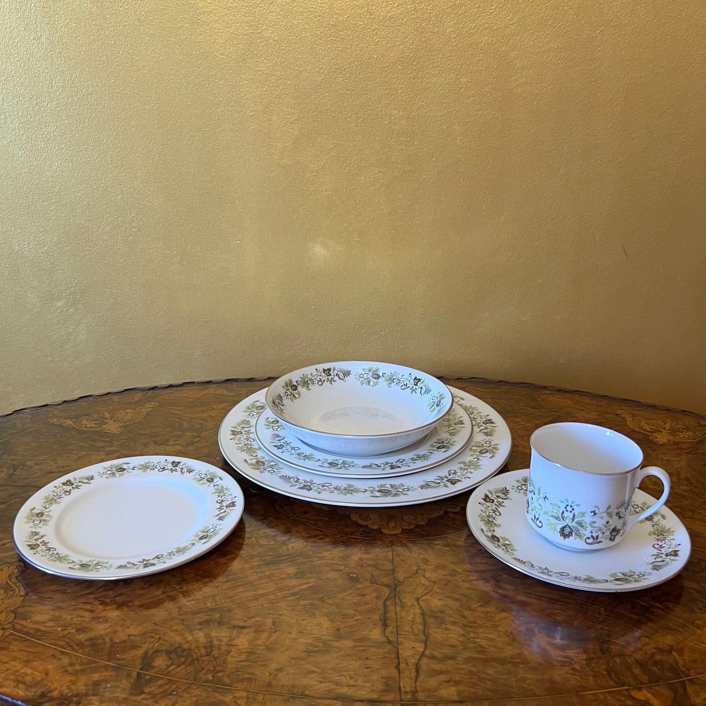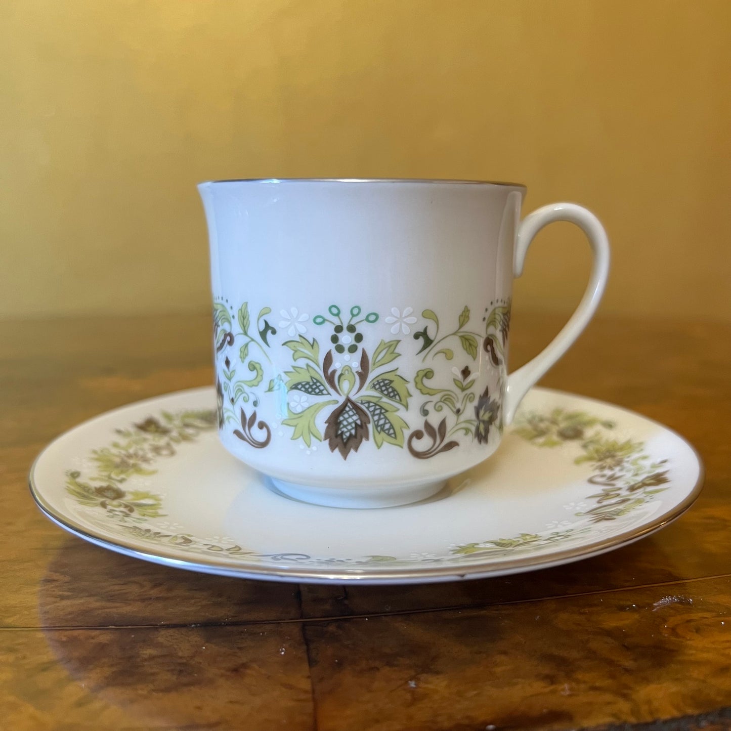 Description: Green leaf print with silver trimming, stamped Royal Doulton Vanity Fair, has very slight wear.