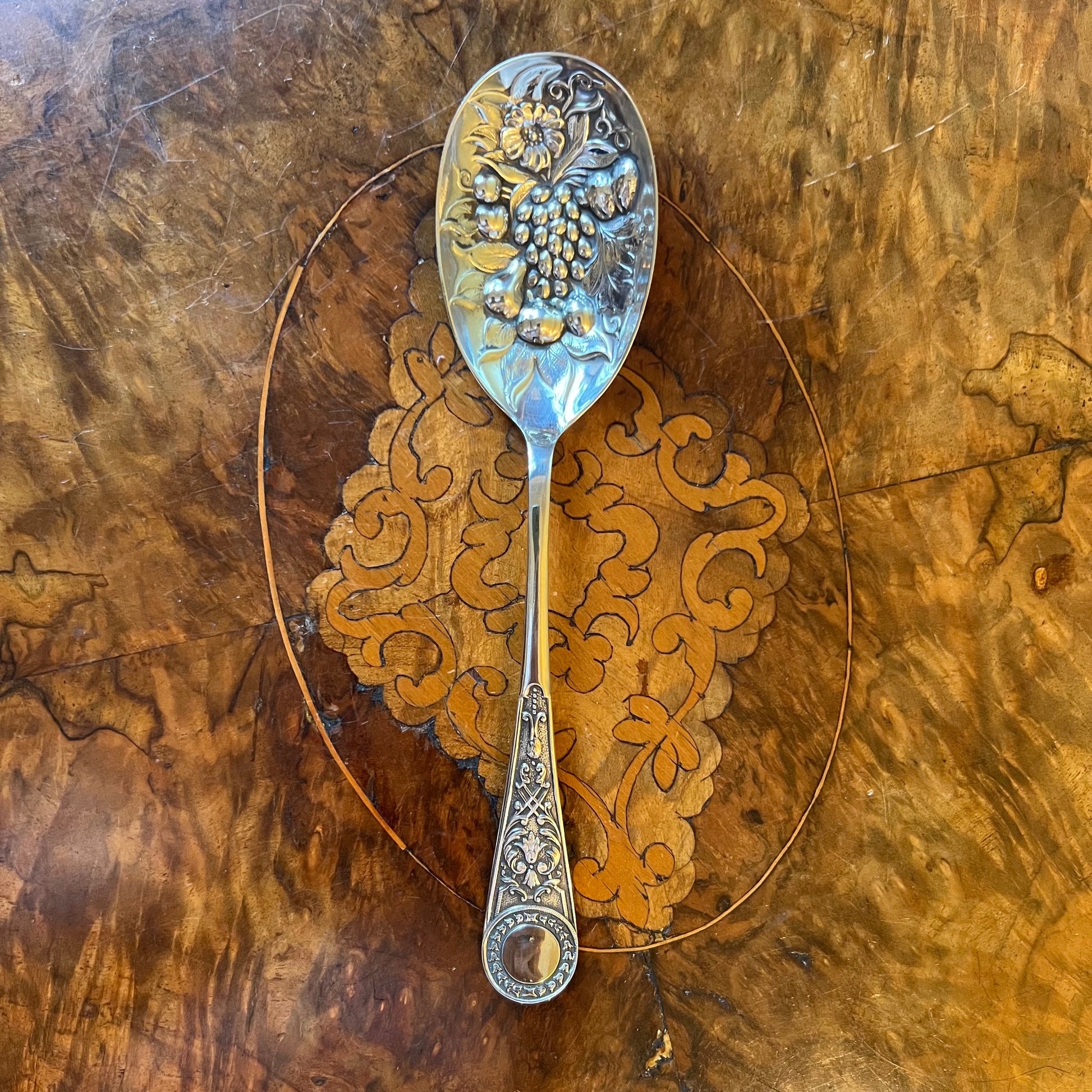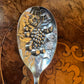 Description: Grapes & floral embossed in centre of spoon, embossed detail on spoon handle, stamped EPNS