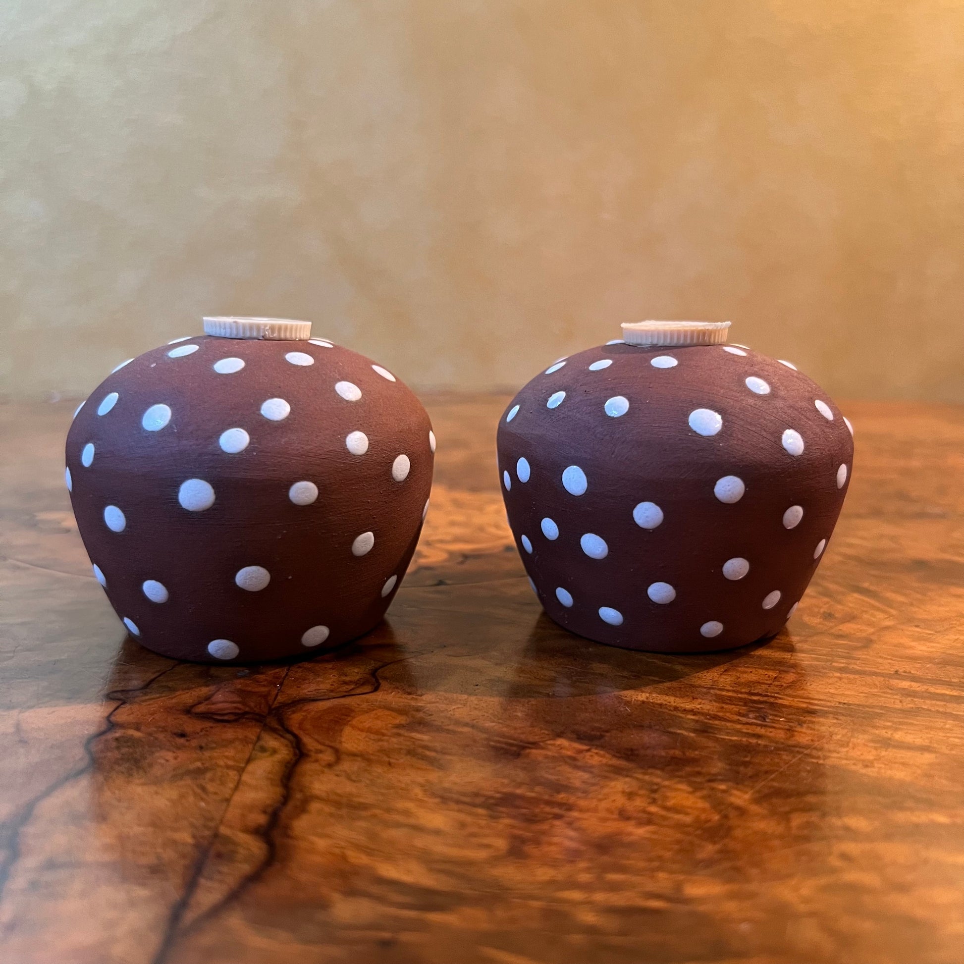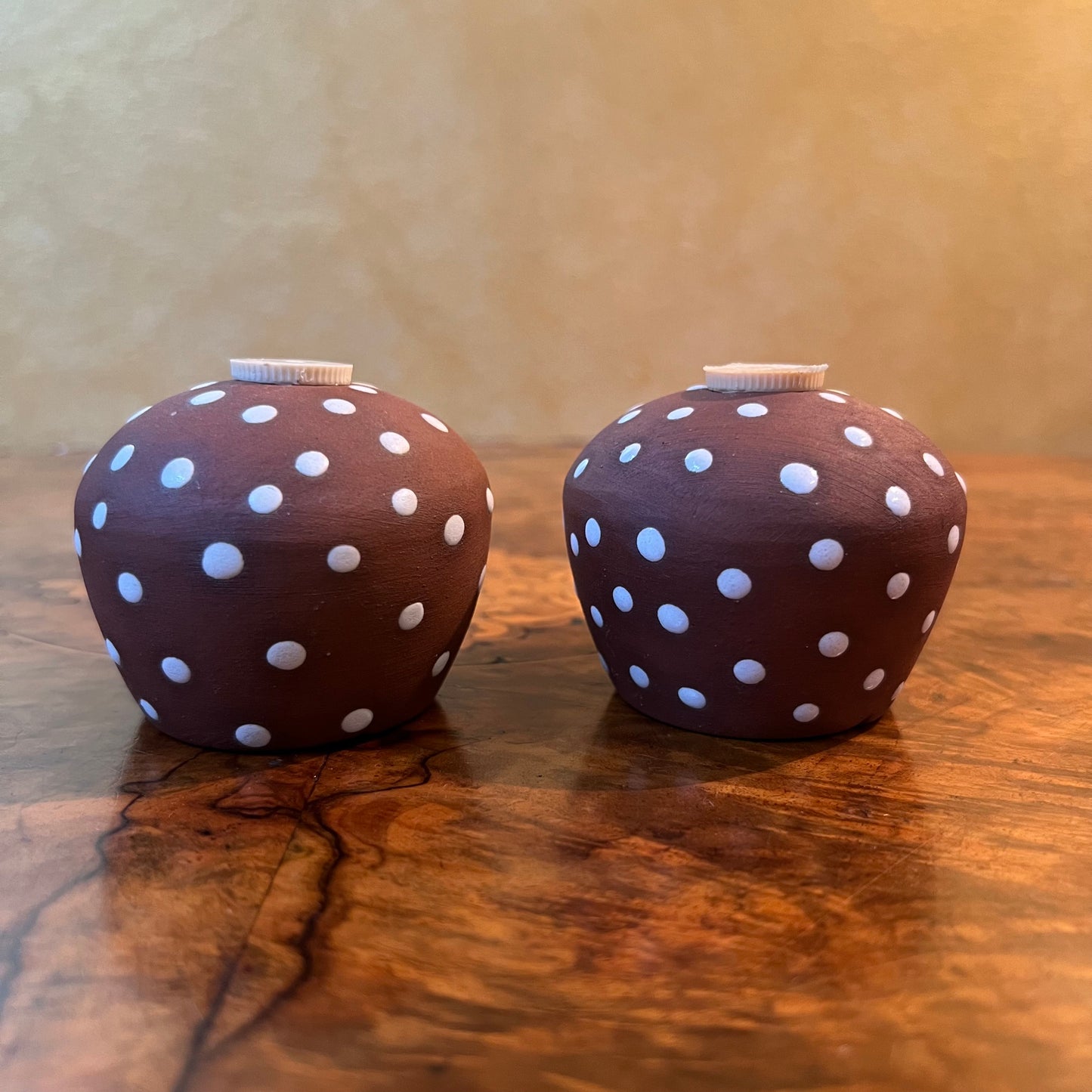 Brown and white spotty design made from Terrace, rounded shape with flat base.