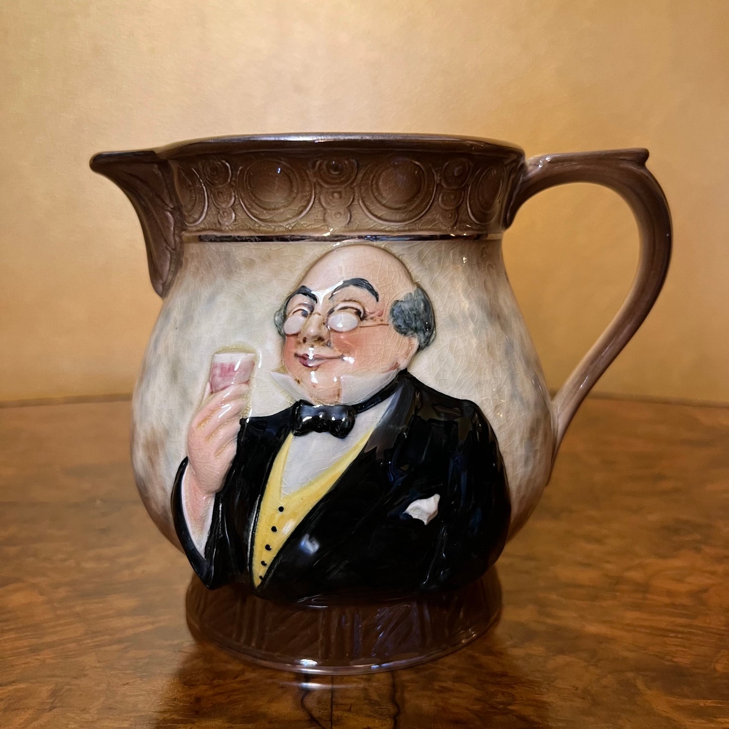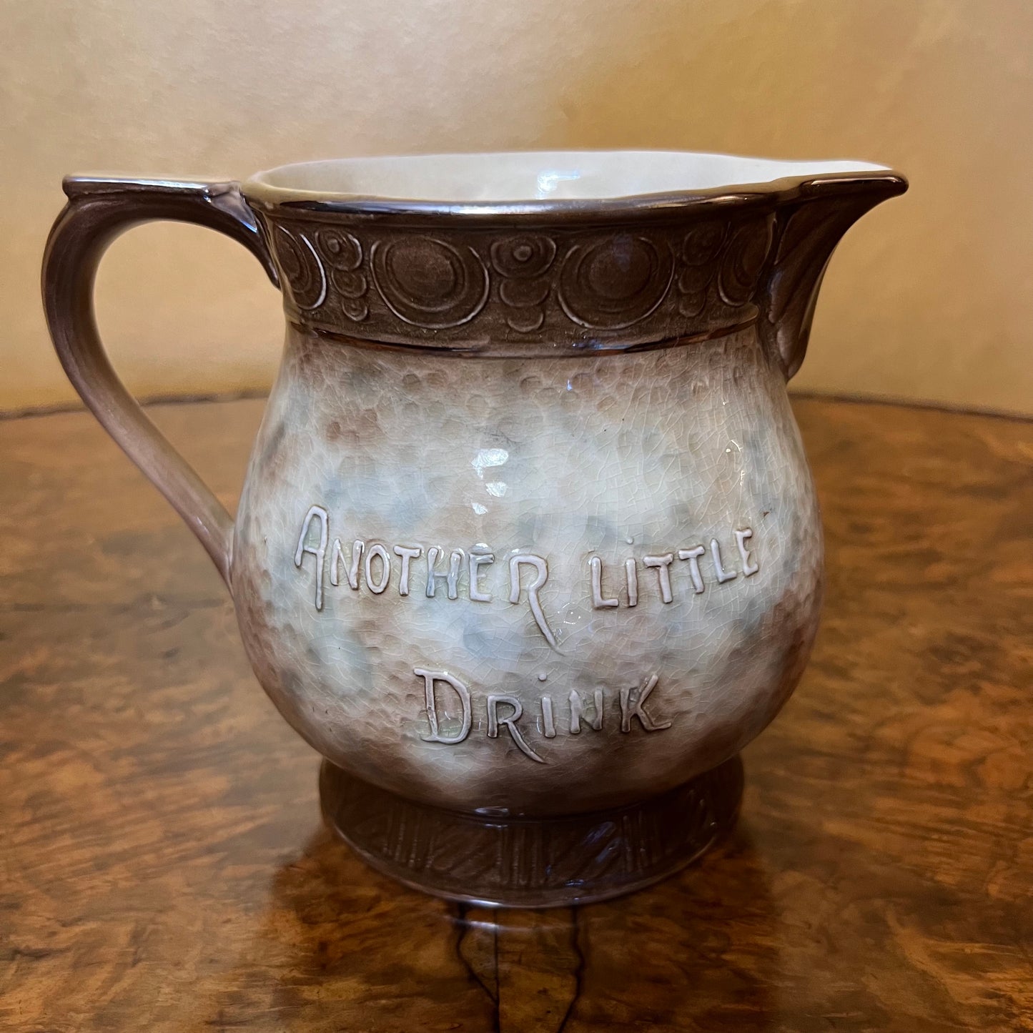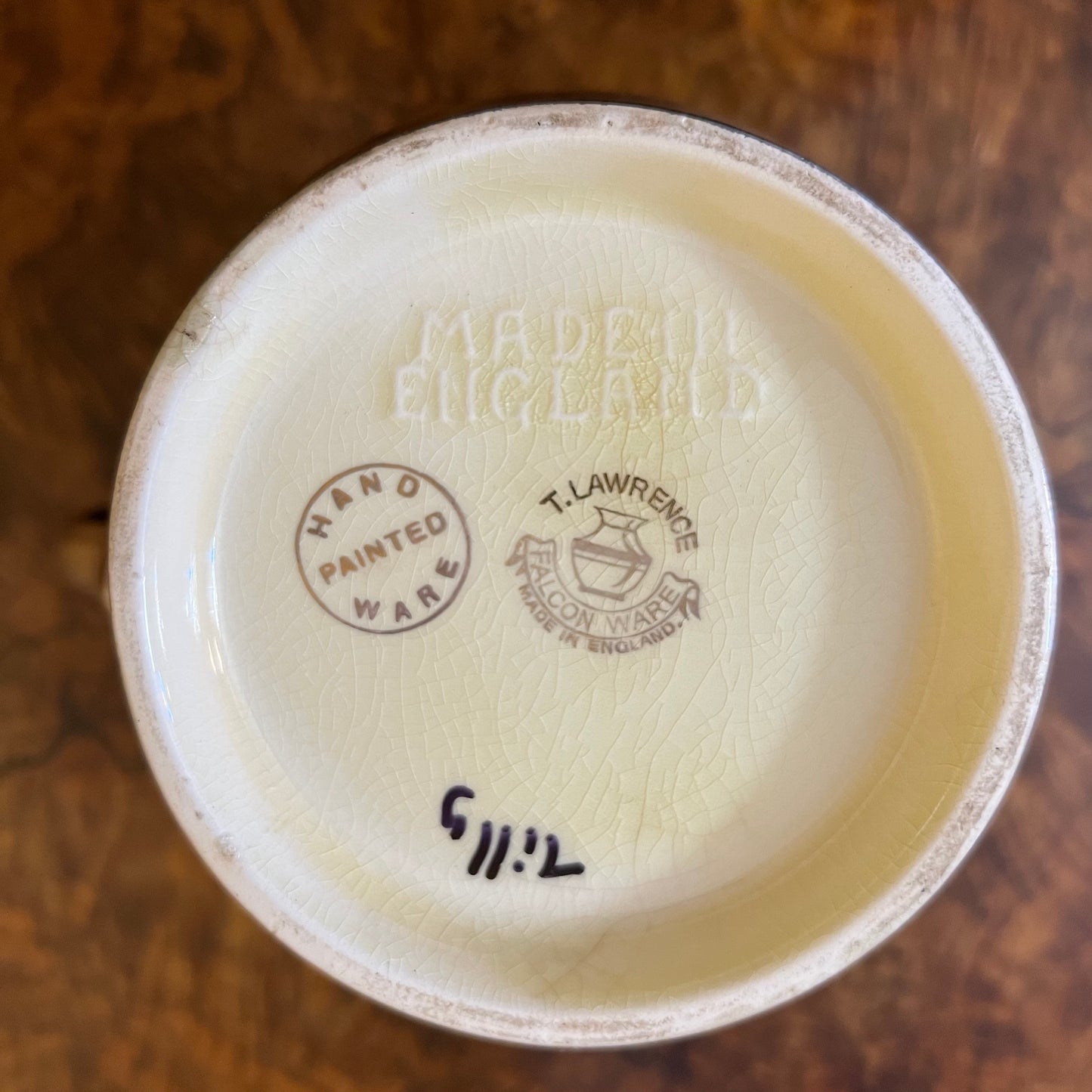 Embossed Man holding a drink, on the back has writing " Another little drink" crazing, has some wear to print and gold trim, stamped T Lawrence Falcon Ware