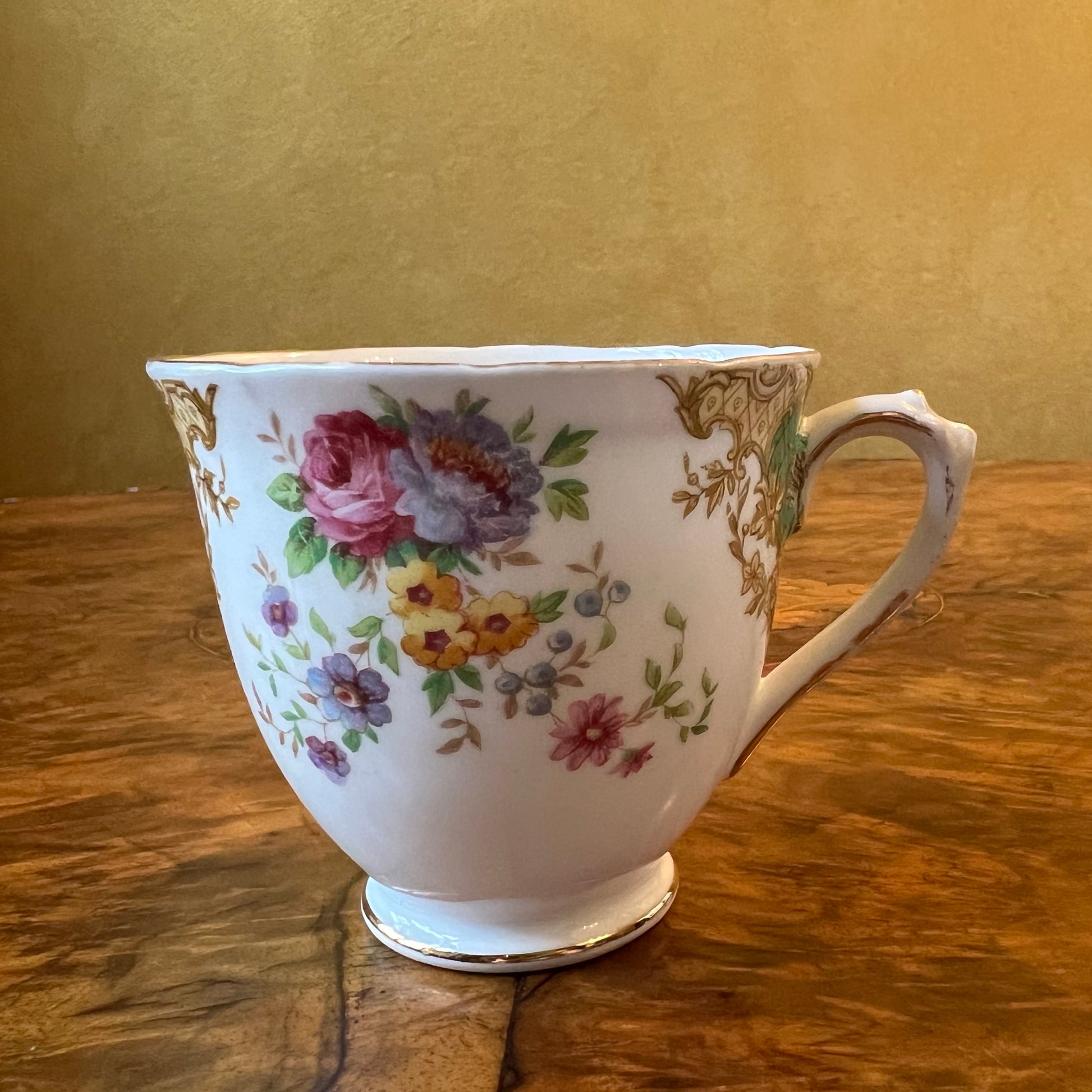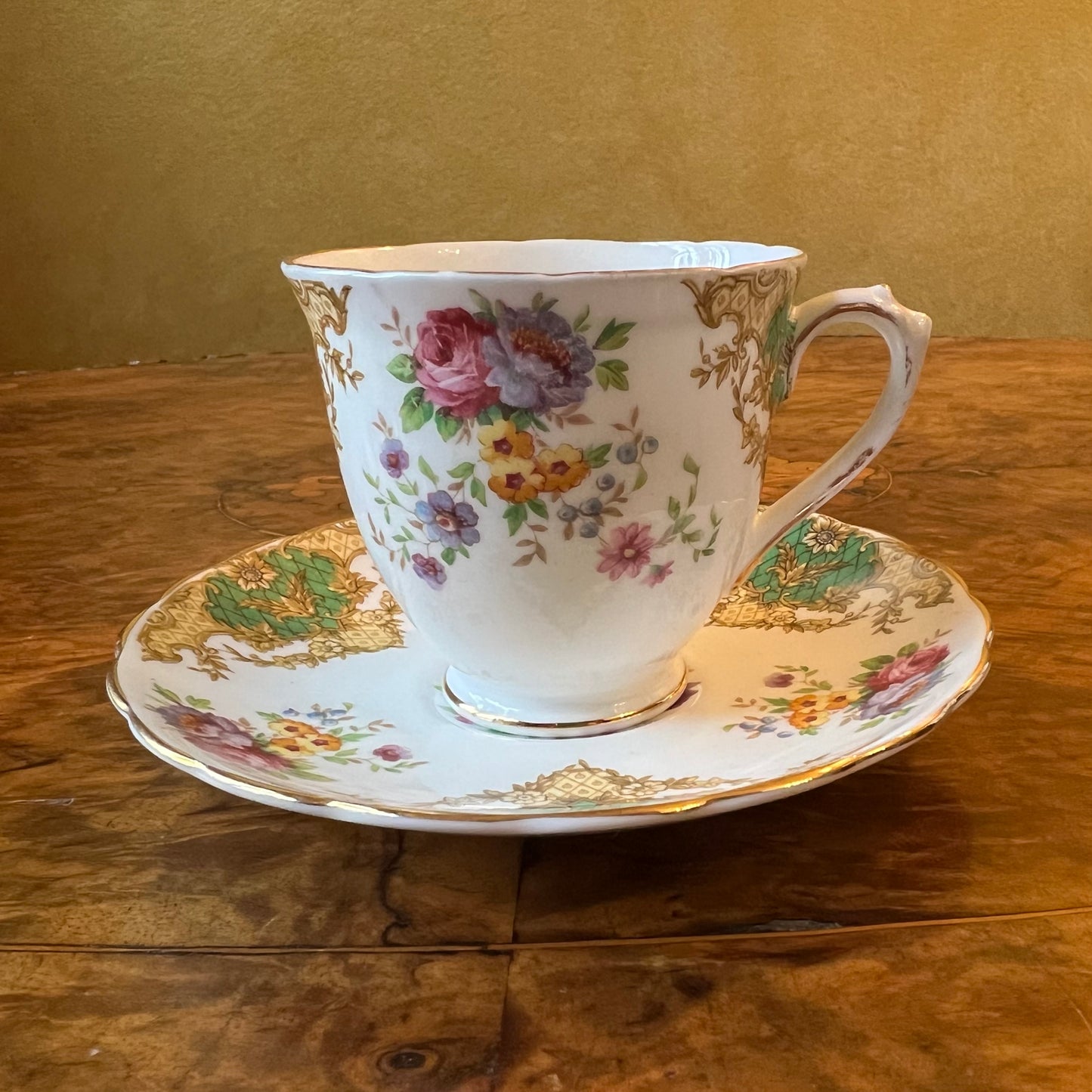 Description: Floral print with green and gold, with gold trimming ware and fade to gold trimming, stamped Tuscan Provence