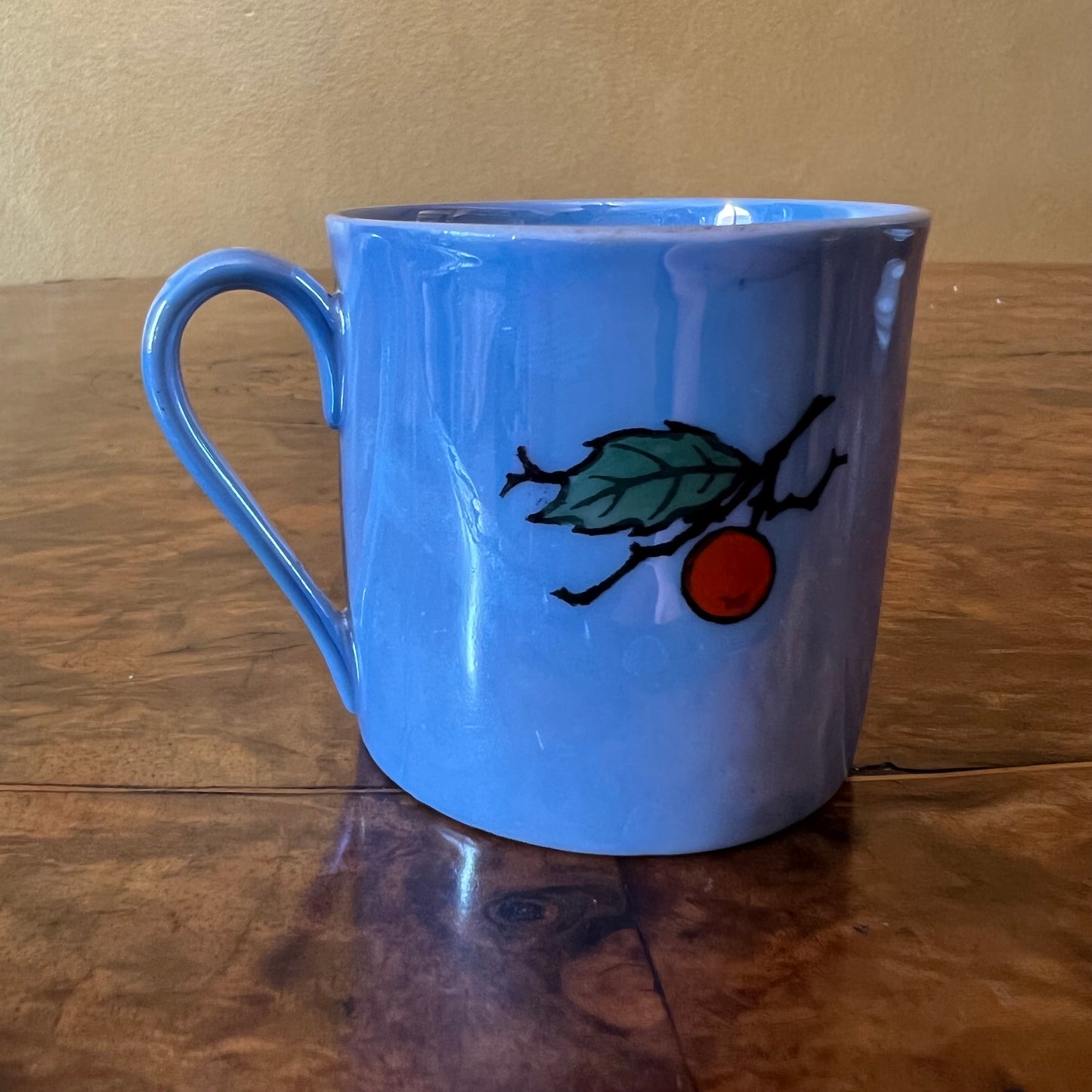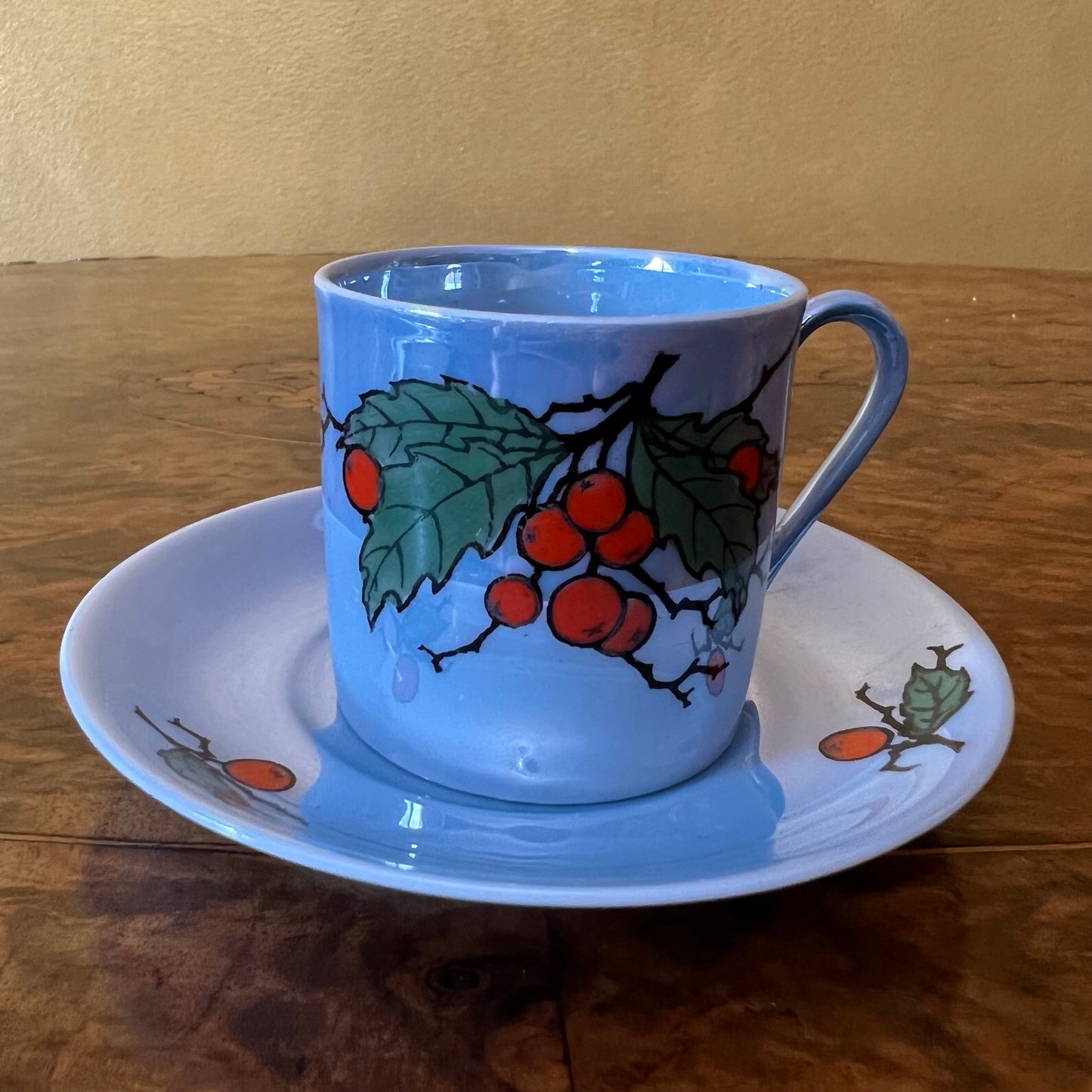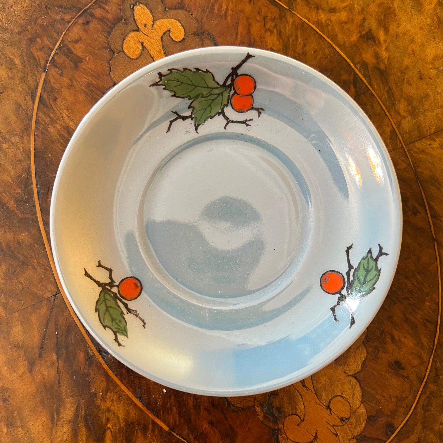 Description: Christmas holy print coffee cups and saucer set of four, some wear to items.