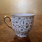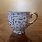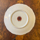 Gold floral print with gold trim, white background, slight ware to gold trim.