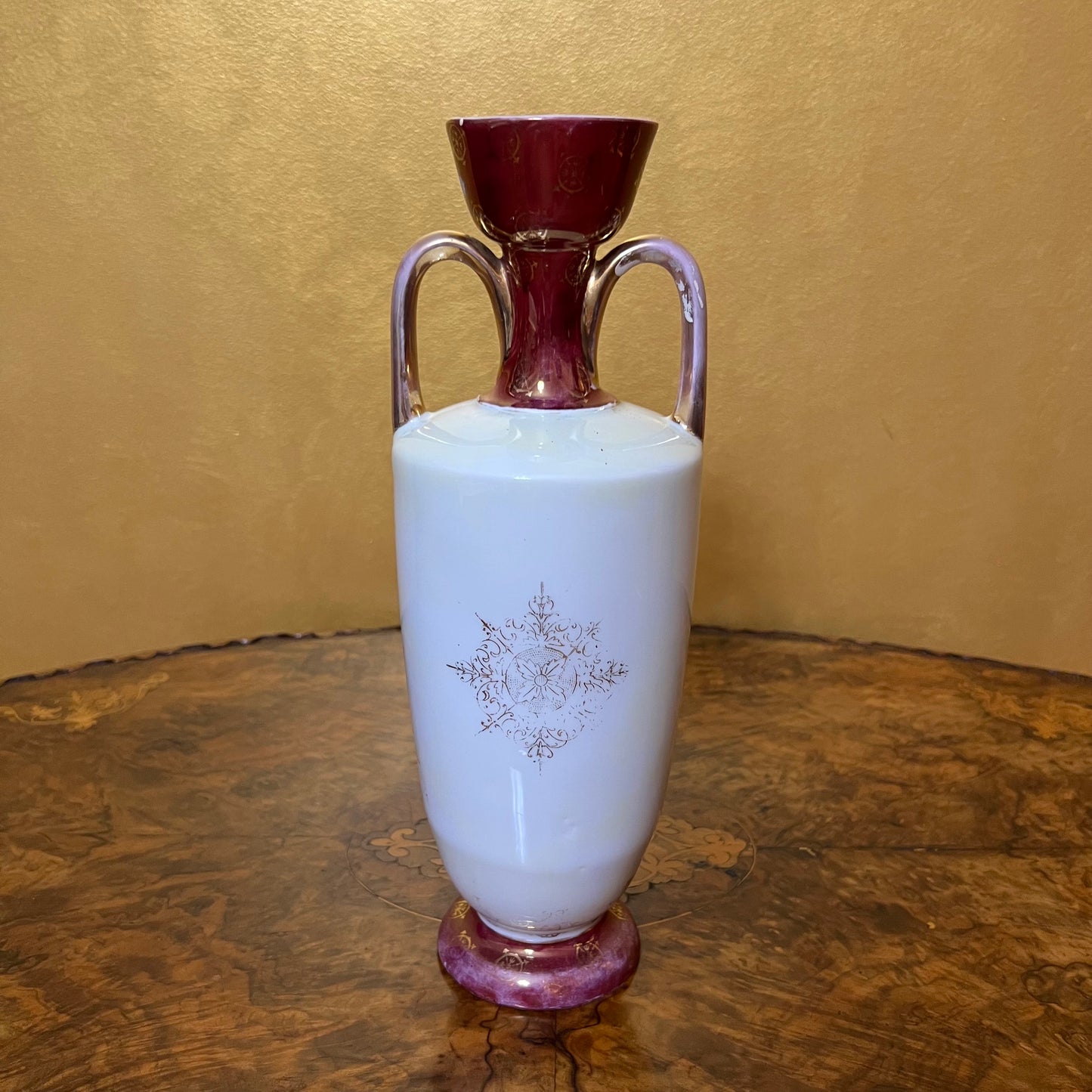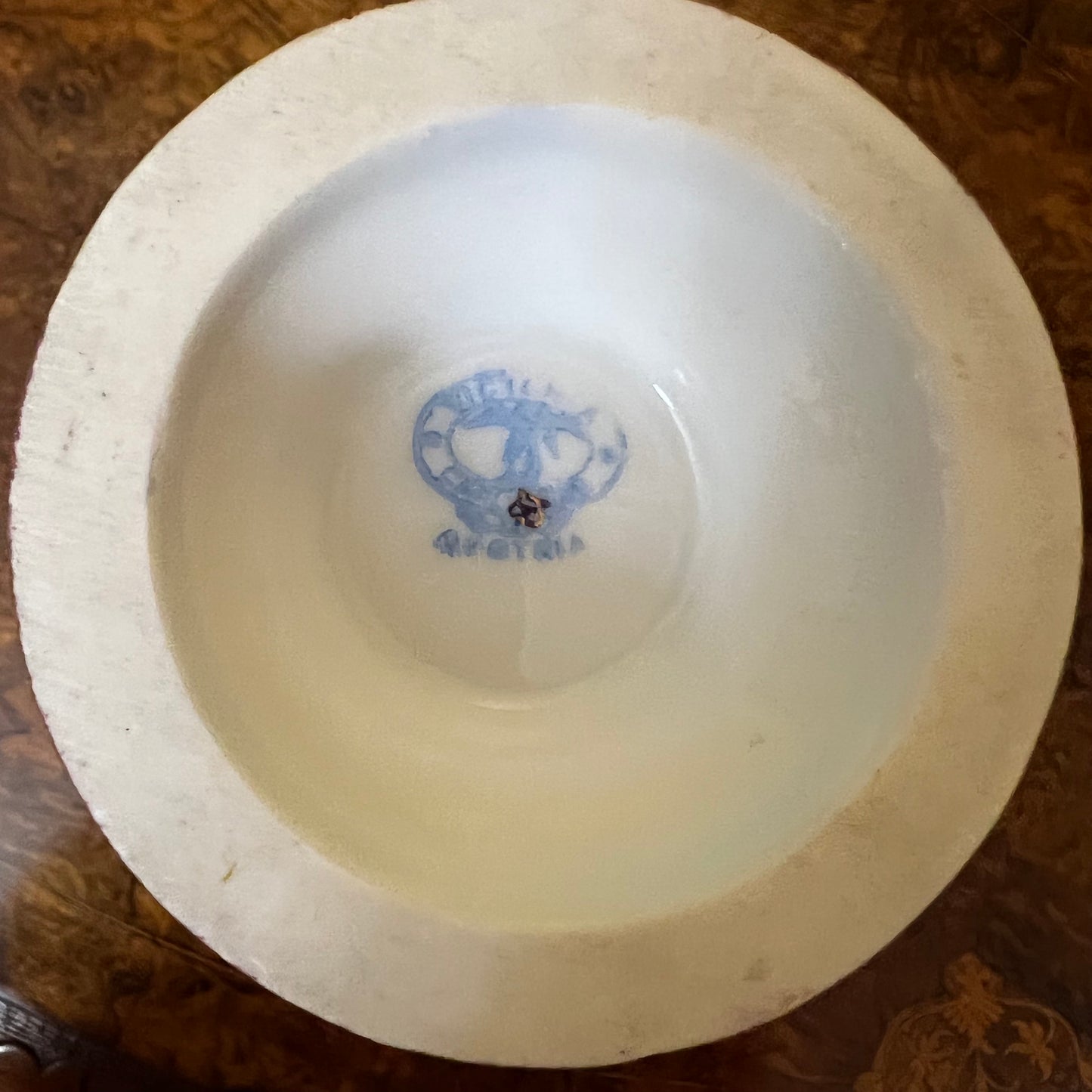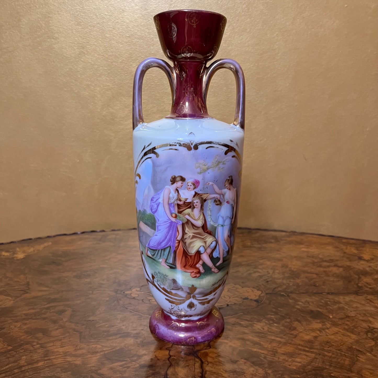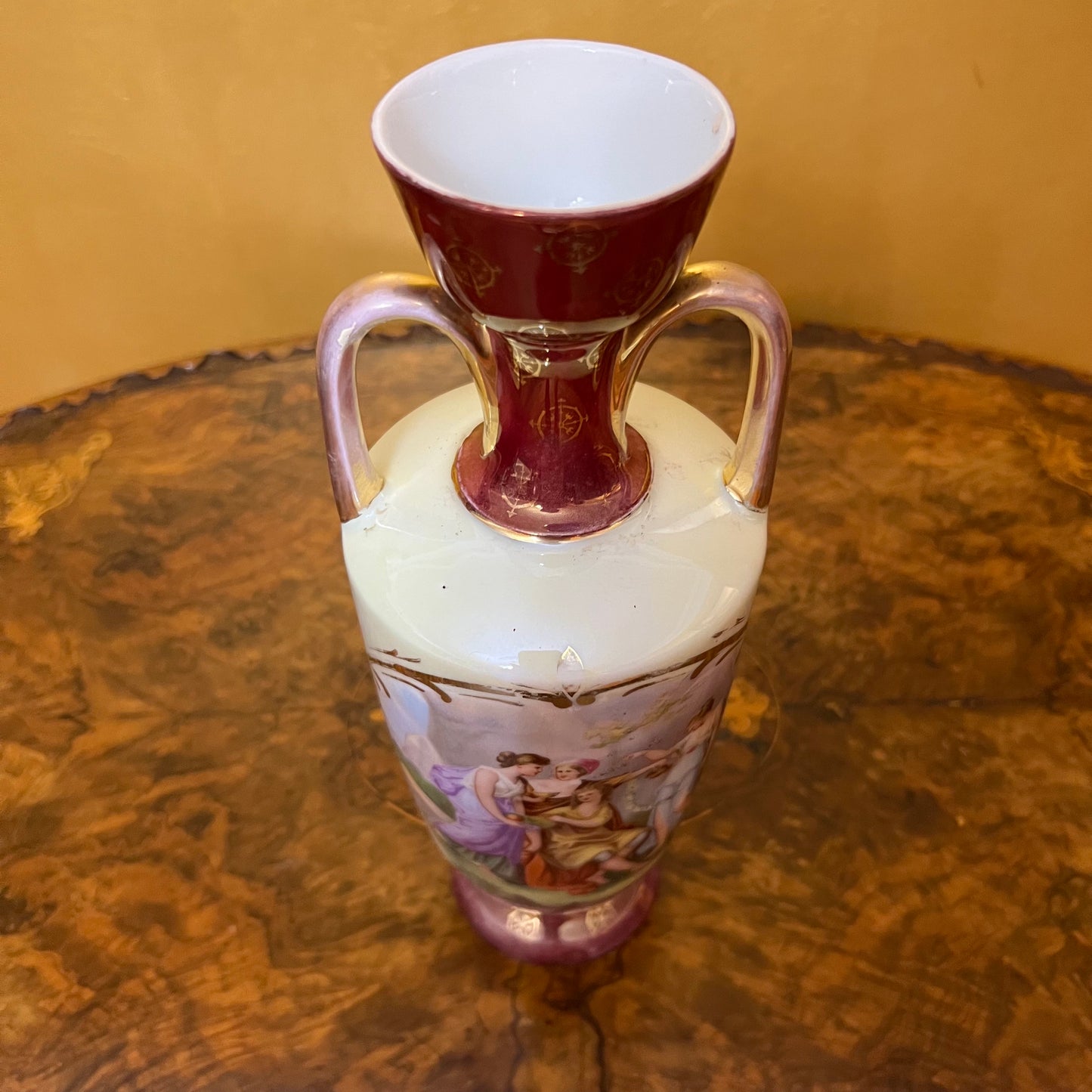 Description: Ladies in the garden with gold detail, there is wear to print and also gold on handles and on print, stamped Victoria Austria