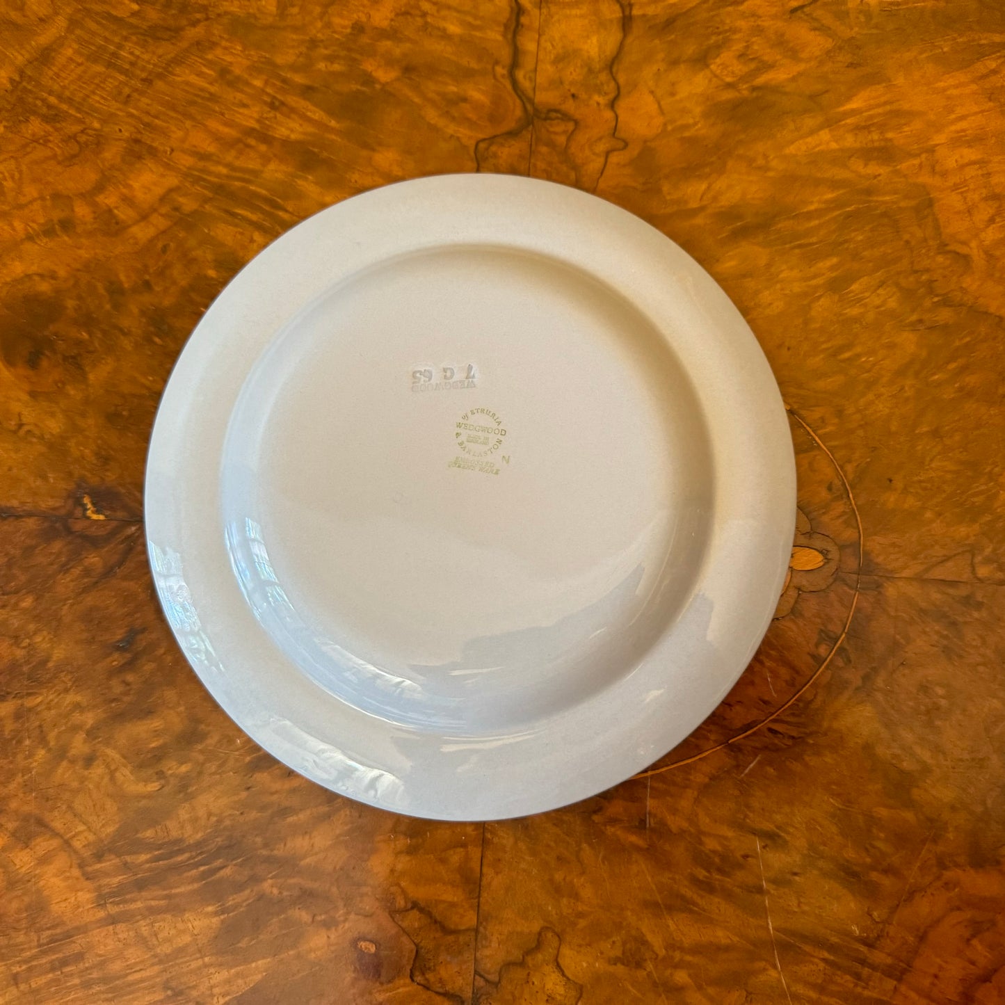 Description: Blue in photo is light that in real life, blue with cream embossed border design, stamped Wedgwood Queens Ware
